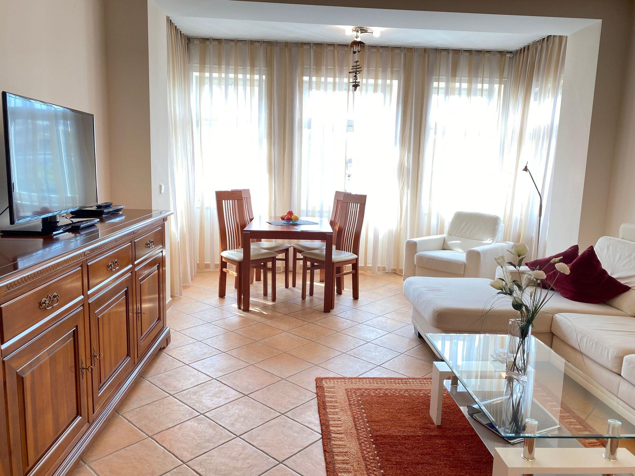 Die Ferienwohnung 1 befindet sich im Erdgeschoss der Bäderstilvilla und hat eine überdachte Terrasse auf der Rückseite des Hauses, auf der Sie das Leben im Freien genießen können. Zur Wohnung gehören ein großes Badezimmer mit Doppelwaschtisch, Dusche und Badewanne. In dem gemütliches Wohnzimmer, in das die Komplettküche klug integriert wurdevund ein Schlafzimmer mit Doppelbett. Die Ferienwohnung ist komplett gefliest. Selbstverständlich gibt es moderne Unterhaltungstechnik und freies Internet für die wenigen Regenstunden auf Usedom.