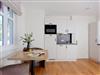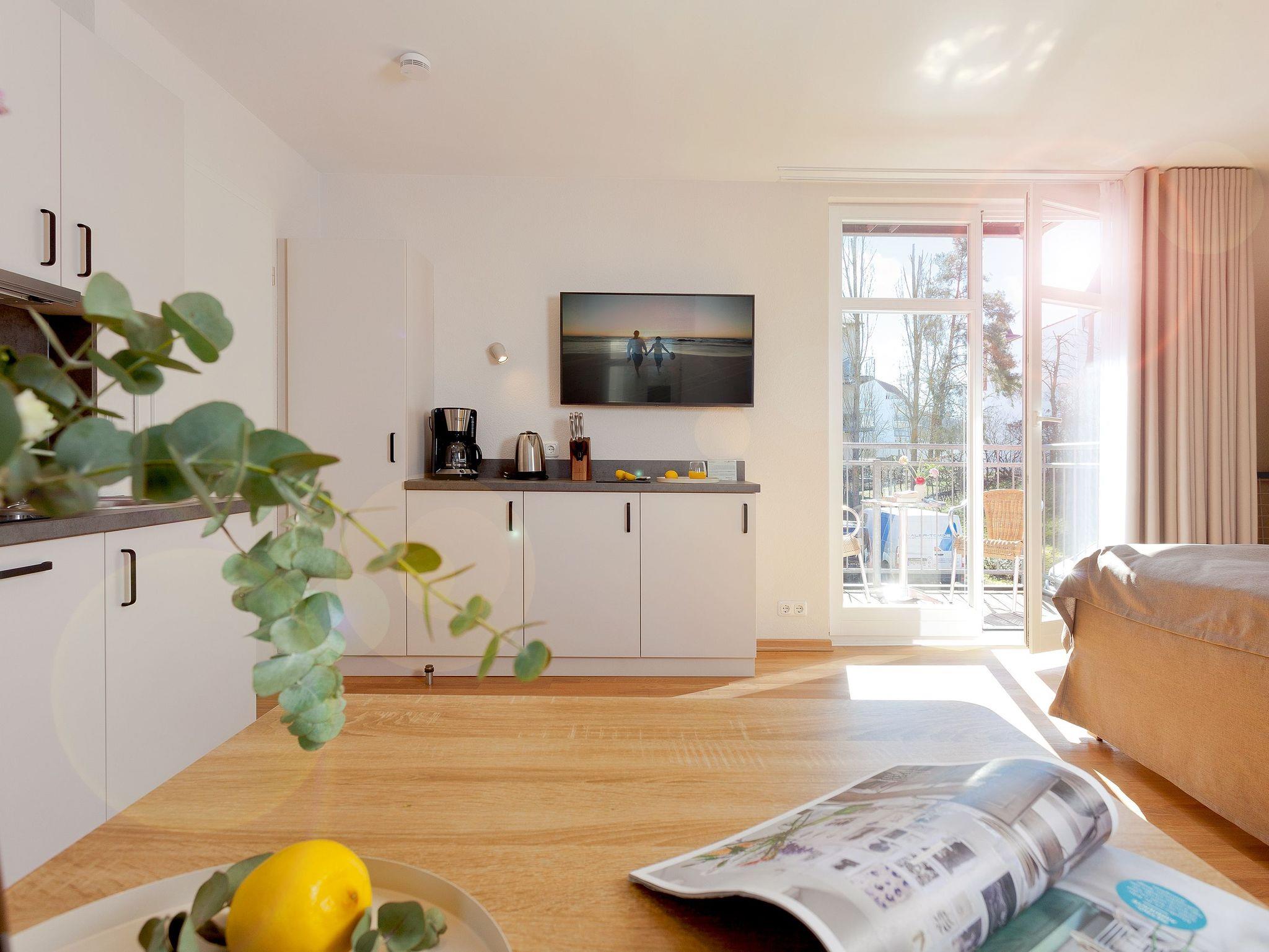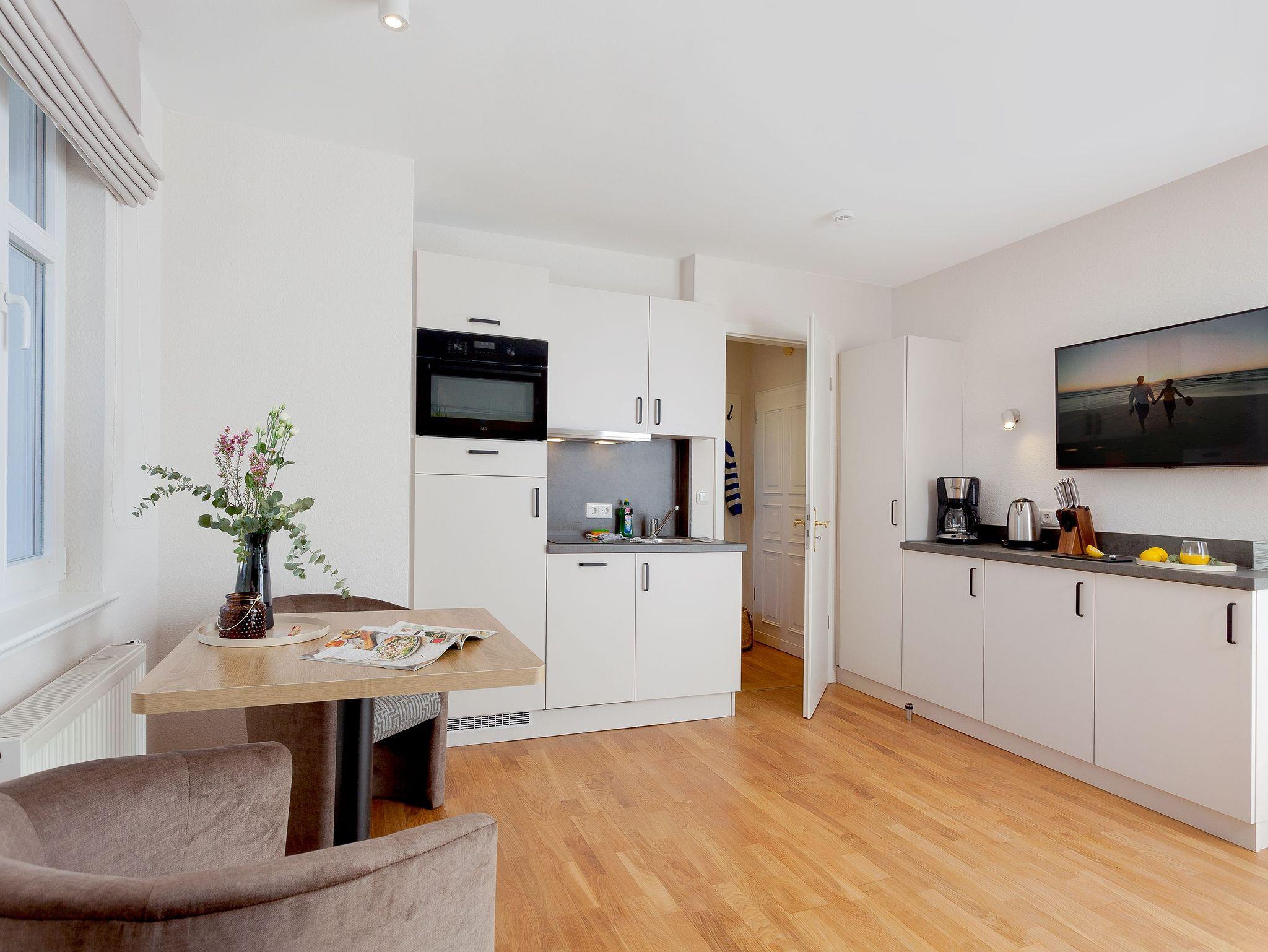 Unser Appartement 5 im 1. Obergeschoss wurde im Winter 2024 - 25 renoviert und erstrahlt nun in neuem Glanz. Mit ca. 30 qm bietet das Appartement alles, was es für einen erholsamen Aufenthalt mit bis zu 2 Personen benötigt. Die neue, moderne Single-Küchenzeile ist vollausgestattet mit einem 2 Platten-Cerankochfeld, Kühlschrank mit Gefrierfach, Backofen mit integrierter Mikrowelle, Spülmaschine sowie Kaffeemaschine, Wasserkocher und Toaster.