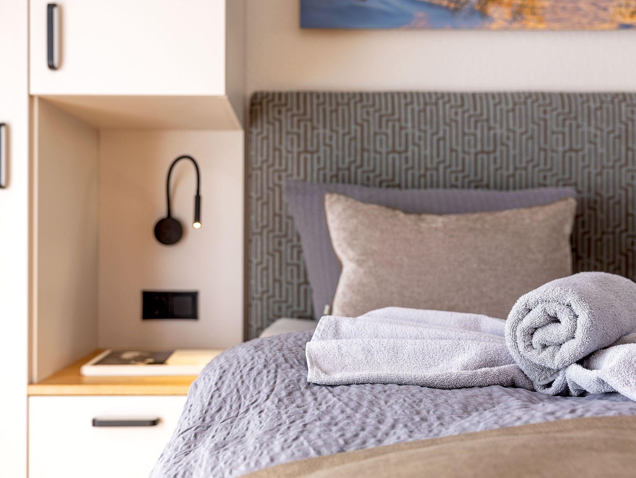 Der kombinierte Wohn- und Schlafbereich lädt zum Entspannen ein. Genießen Sie gemütliche Abende auf den neuen Sesseln am Esstisch für zwei, bevor Sie im komfortablen Boxspringbett (180 x 200 cm) eine erholsame Nacht verbringen. Am Morgen begrüßt Sie die Sonne auf dem möblierten Balkon in Südostlage.