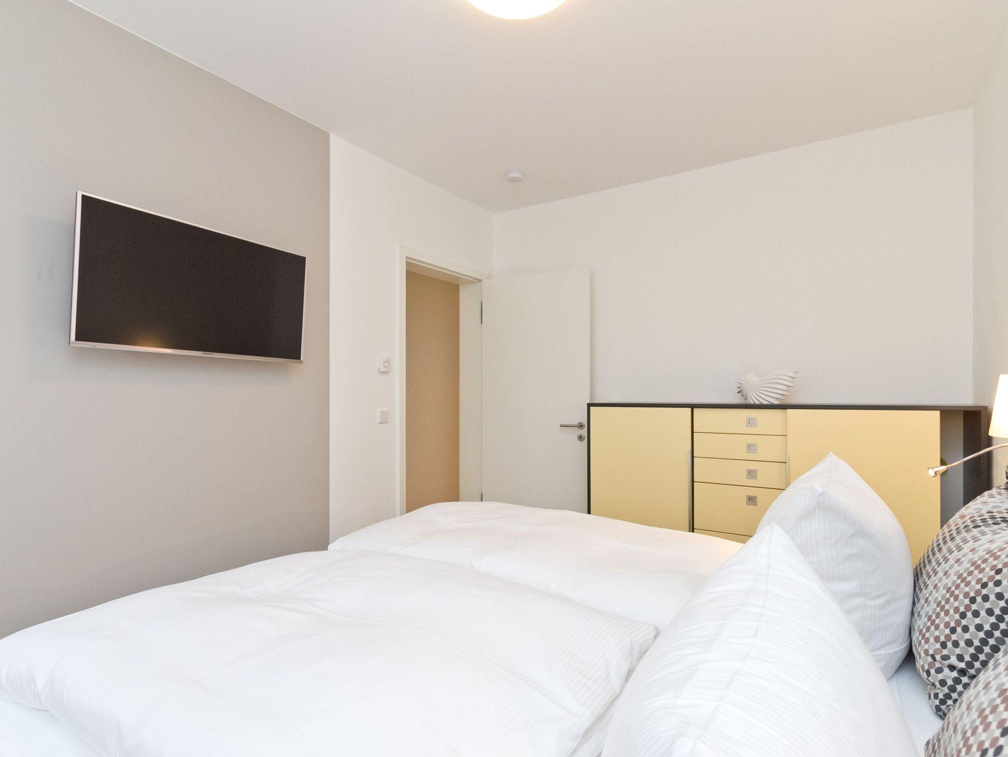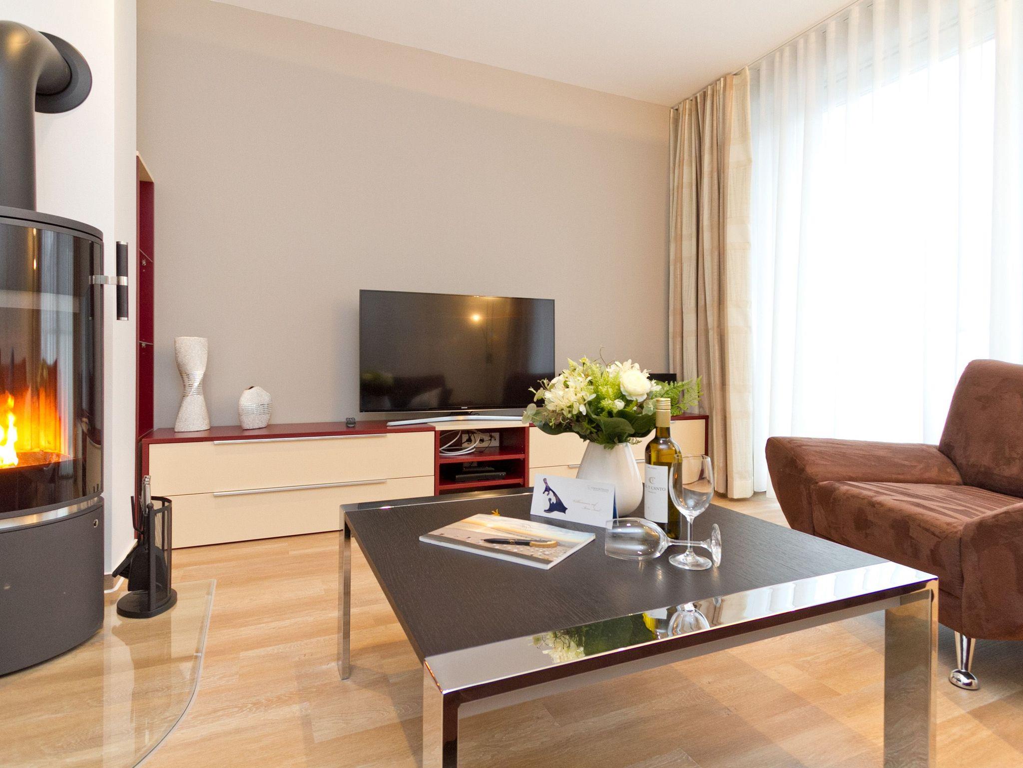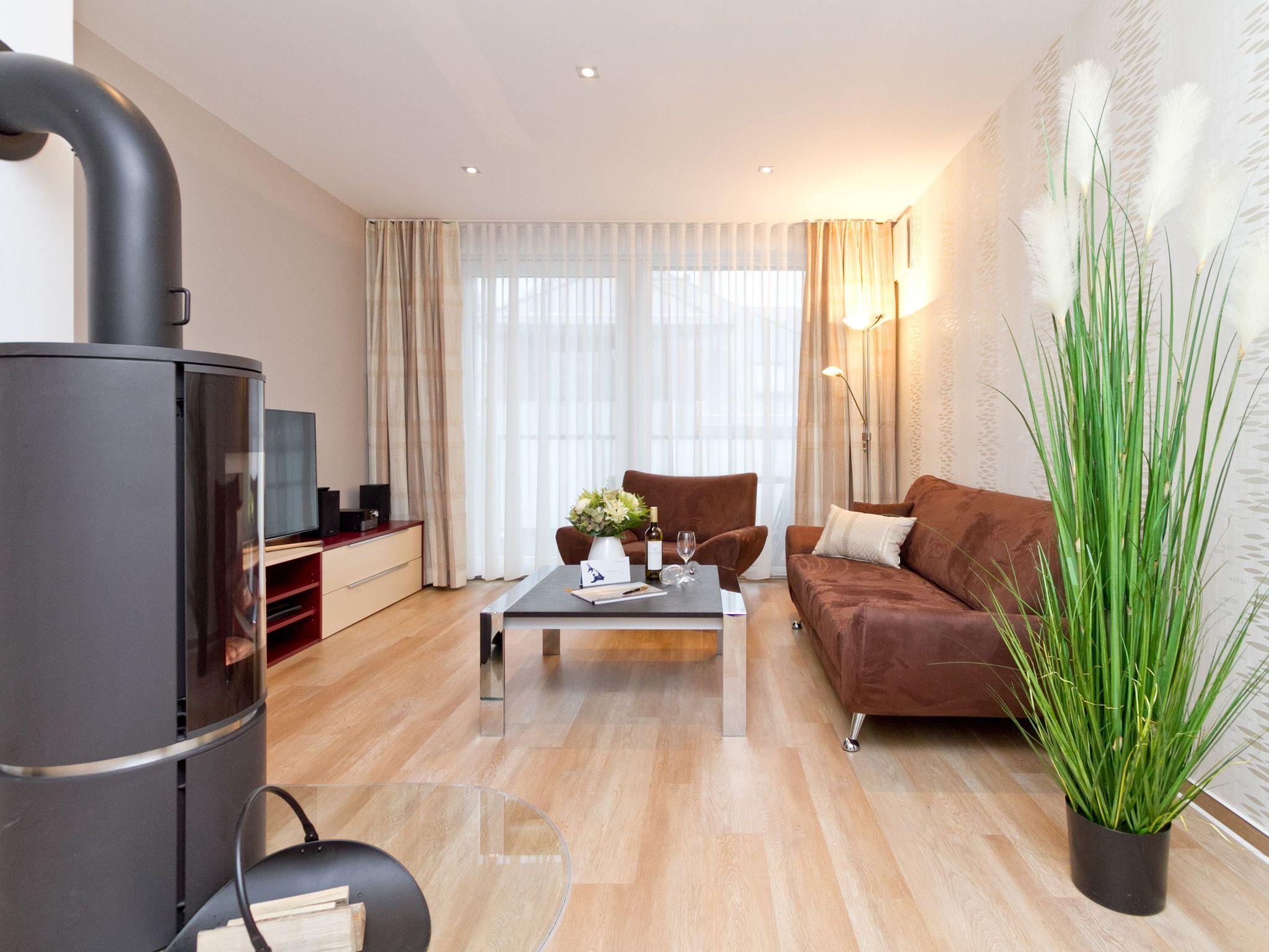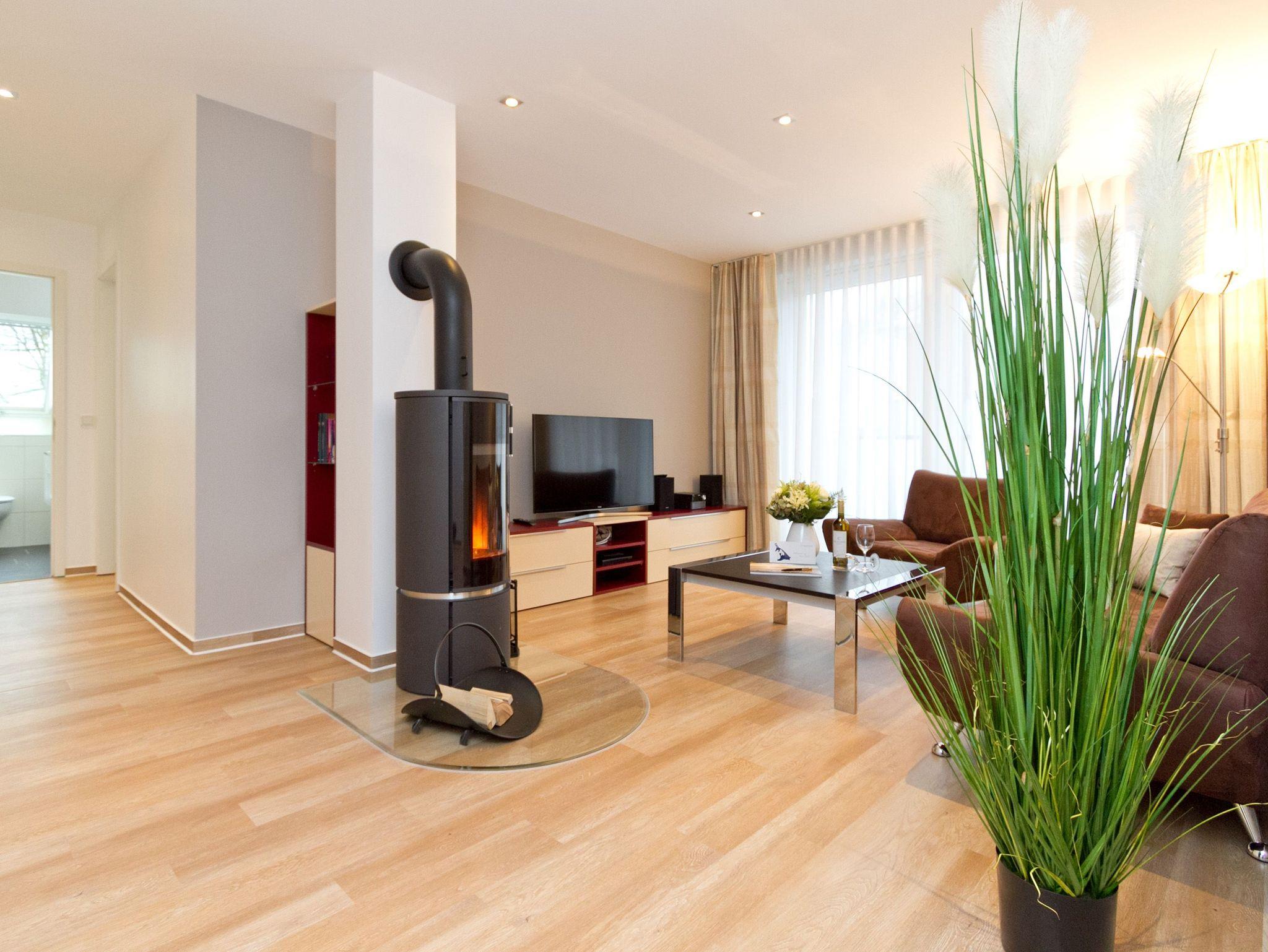 Vier Personen und ein Kleinkind im Kinderreisebett werden sich hier im 2. Obergeschoss im Appartement Nummer 18 pudelwohl fühlen. Denn es bietet mit seinen 85 Quadratmetern allen nur erdenklichen Wohnkomfort und überrascht mit einigen Extras. Hell und großzügig empfängt die Urlaubshungrigen das Wohnzimmer mit seinem Echtholzkaminofen, seiner Sofa-Sitzgruppe und dem großen Flat-TV mit DVD-Player. Kommen Sie an und entspannen Sie einfach drauf los. Hier brauchen Sie sich um nichts zu sorgen. Die Betten sind bezogen. Handtücher liegen bereit. Die separate Küche ist mit hochwertigen Küchengeräten bestens ausgerüstet. Auch Geschirr fehlt nicht. Am gläsernen, zur Küche gehörenden Essplatz finden alle Platz. Ihr Urlaubsdomizil verfügt über gleich zwei, sonnenverwöhnte Balkone (einer mit 8 Quadratmetern in Richtung Ost/ Süd-Ost; ein 2. zur Südseite, 6 Quadratmeter groß), auf denen Sie die frische Ostseeluft direkt einatmen können. In den zwei Schlafzimmern befinden sich bequeme Boxspringdoppelbetten (1,80 m x 2,00 m). Jedes ist mit einem Flat-TV und einer Kommode für die Urlaubsgarderobe ausgestattet. Das riesige Badezimmer ist eine kleine Wellness-Oase mit Badewanne, Dusche, Waschtisch und einer eigenen Infrarotsauna. Hier können Sie an kühlen Tagen oder Abenden bei kreislaufschonend kuscheligen Temperaturen ordentlich ins Schwitzen kommen und allen Stress loslassen. Im Appartement gibt es zudem ein separates Gäste-WC. Zwei hintereinander befindliche Parkplätze gehören zur Nummer 18 dazu. Auch ein Briefkasten steht zur Verfügung. Auf Wunsch stellen wir für unsere kleinen Gäste ein Kinderreisebett (ohne zusätzliche Matratze [&] Bettzeug) und einen Kinderhochstuhl (gegen einen Aufpreis) in die Wohnung. Das WLAN können Sie kostenfrei nutzen.
