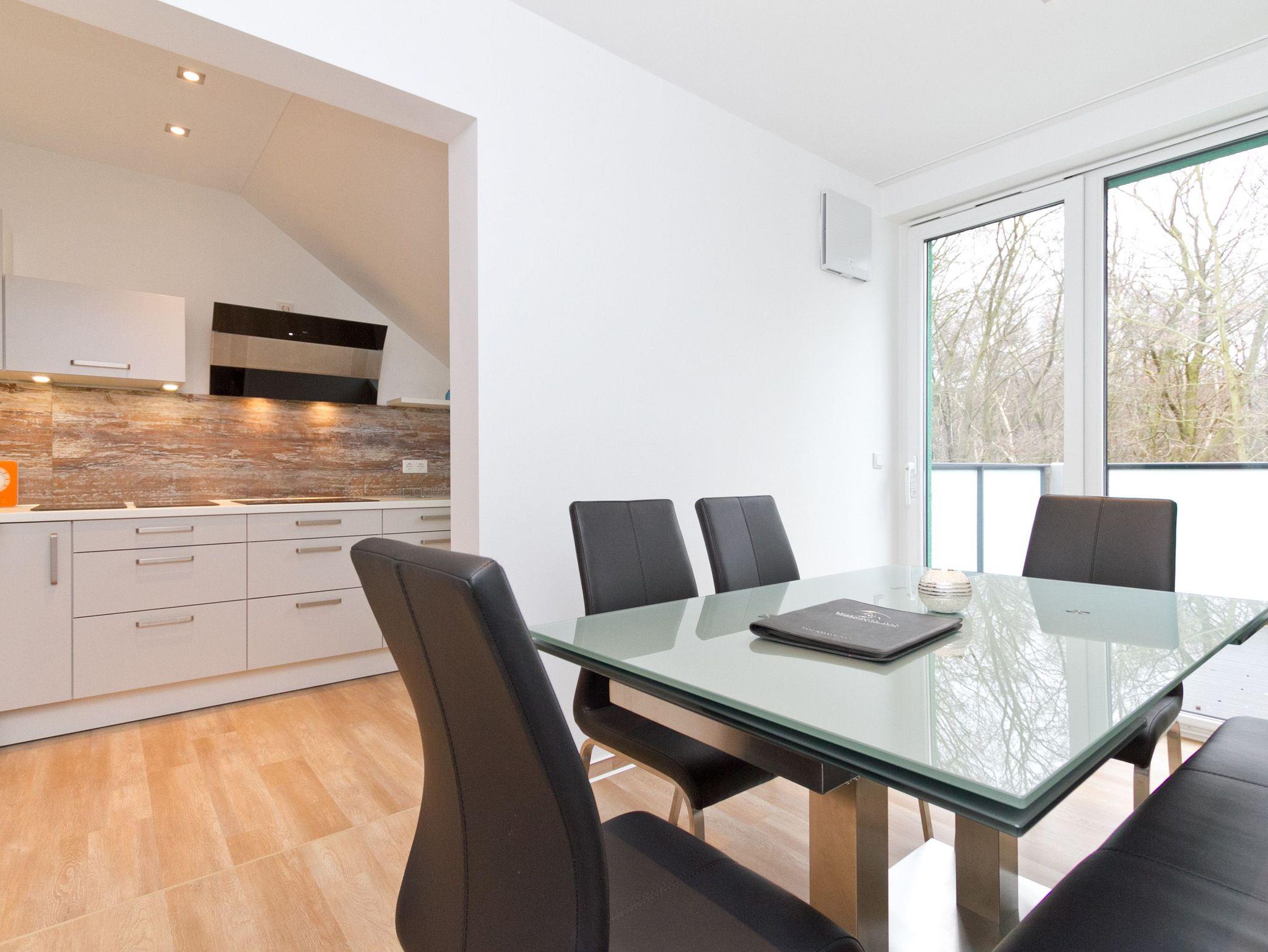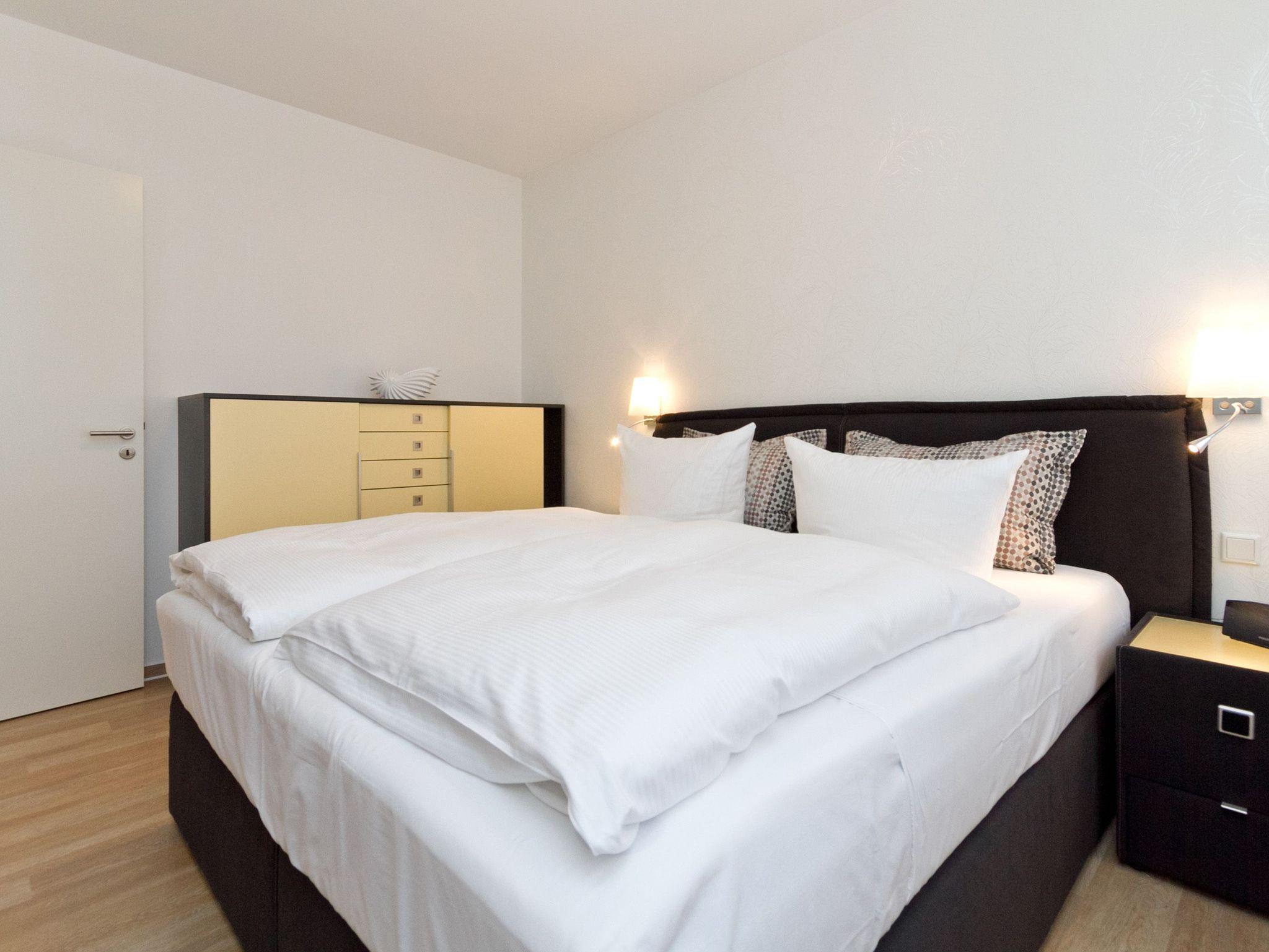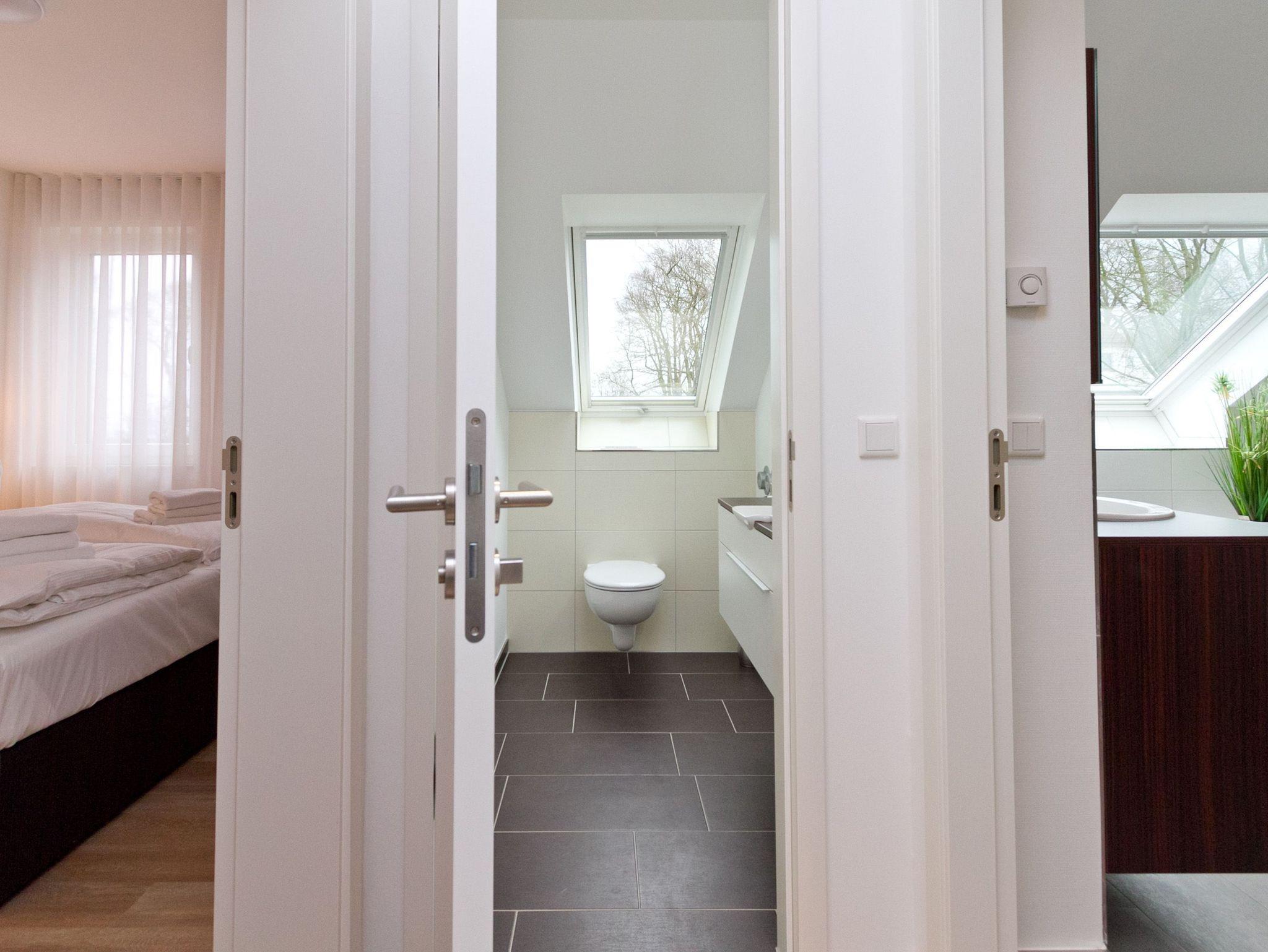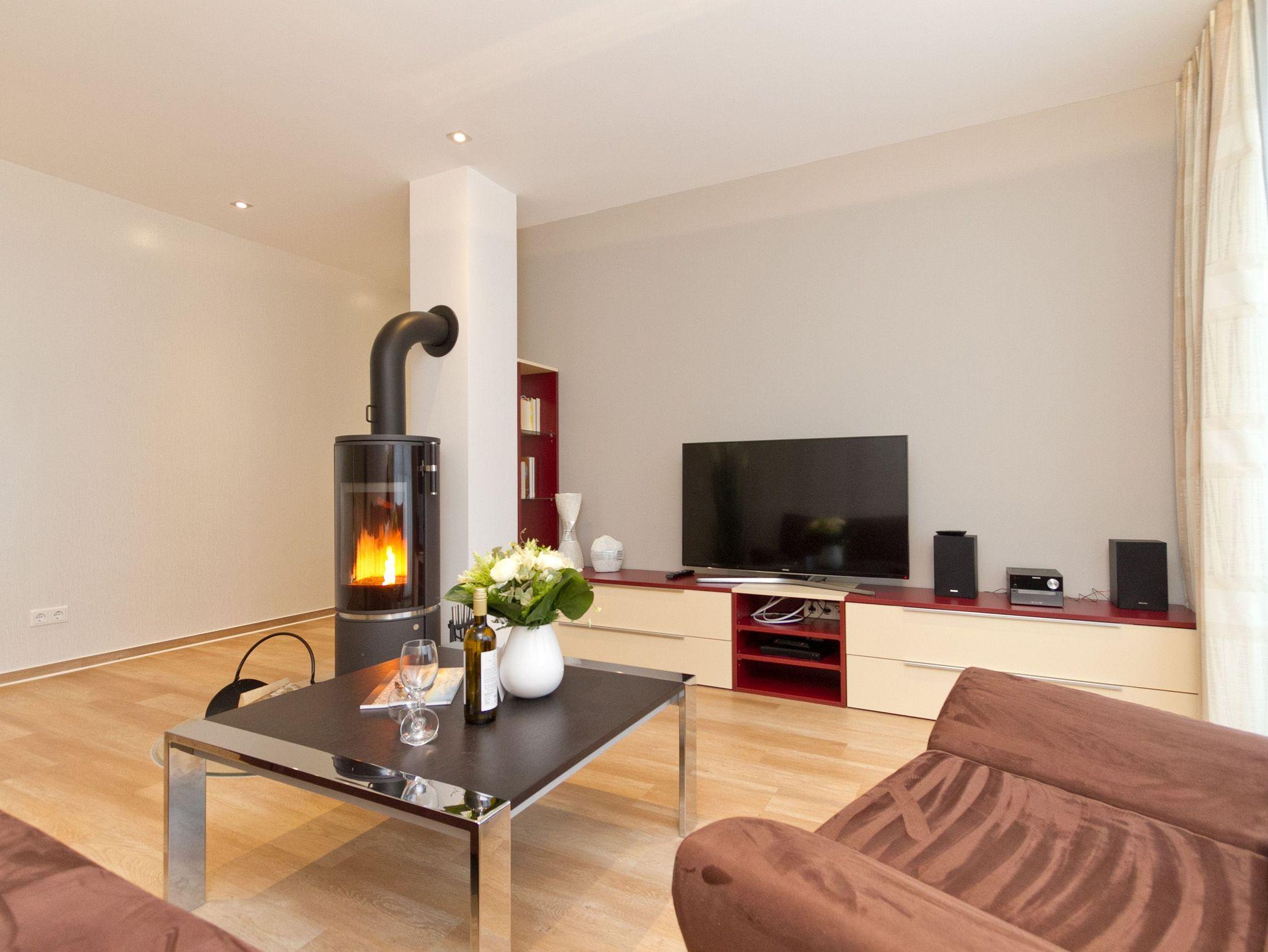 Vier Personen und ein Kleinkind im Kinderreisebett werden sich hier im 2. Obergeschoss im Appartement Nummer 18 pudelwohl fühlen. Denn es bietet mit seinen 85 Quadratmetern allen nur erdenklichen Wohnkomfort und überrascht mit einigen Extras. Hell und großzügig empfängt die Urlaubshungrigen das Wohnzimmer mit seinem Echtholzkaminofen, seiner Sofa-Sitzgruppe und dem großen Flat-TV mit DVD-Player. Kommen Sie an und entspannen Sie einfach drauf los. Hier brauchen Sie sich um nichts zu sorgen. Die Betten sind bezogen. Handtücher liegen bereit. Die separate Küche ist mit hochwertigen Küchengeräten bestens ausgerüstet. Auch Geschirr fehlt nicht. Am gläsernen, zur Küche gehörenden Essplatz finden alle Platz. Ihr Urlaubsdomizil verfügt über gleich zwei, sonnenverwöhnte Balkone (einer mit 8 Quadratmetern in Richtung Ost/ Süd-Ost; ein 2. zur Südseite, 6 Quadratmeter groß), auf denen Sie die frische Ostseeluft direkt einatmen können. In den zwei Schlafzimmern befinden sich bequeme Boxspringdoppelbetten (1,80 m x 2,00 m). Jedes ist mit einem Flat-TV und einer Kommode für die Urlaubsgarderobe ausgestattet. Das riesige Badezimmer ist eine kleine Wellness-Oase mit Badewanne, Dusche, Waschtisch und einer eigenen Infrarotsauna. Hier können Sie an kühlen Tagen oder Abenden bei kreislaufschonend kuscheligen Temperaturen ordentlich ins Schwitzen kommen und allen Stress loslassen. Im Appartement gibt es zudem ein separates Gäste-WC. Zwei hintereinander befindliche Parkplätze gehören zur Nummer 18 dazu. Auch ein Briefkasten steht zur Verfügung. Auf Wunsch stellen wir für unsere kleinen Gäste ein Kinderreisebett (ohne zusätzliche Matratze [&] Bettzeug) und einen Kinderhochstuhl (gegen einen Aufpreis) in die Wohnung. Das WLAN können Sie kostenfrei nutzen.