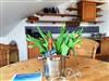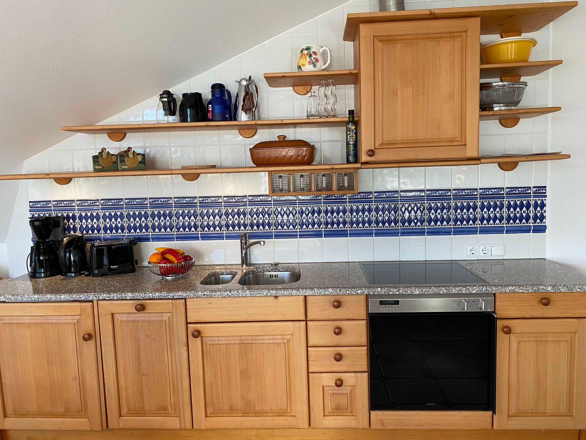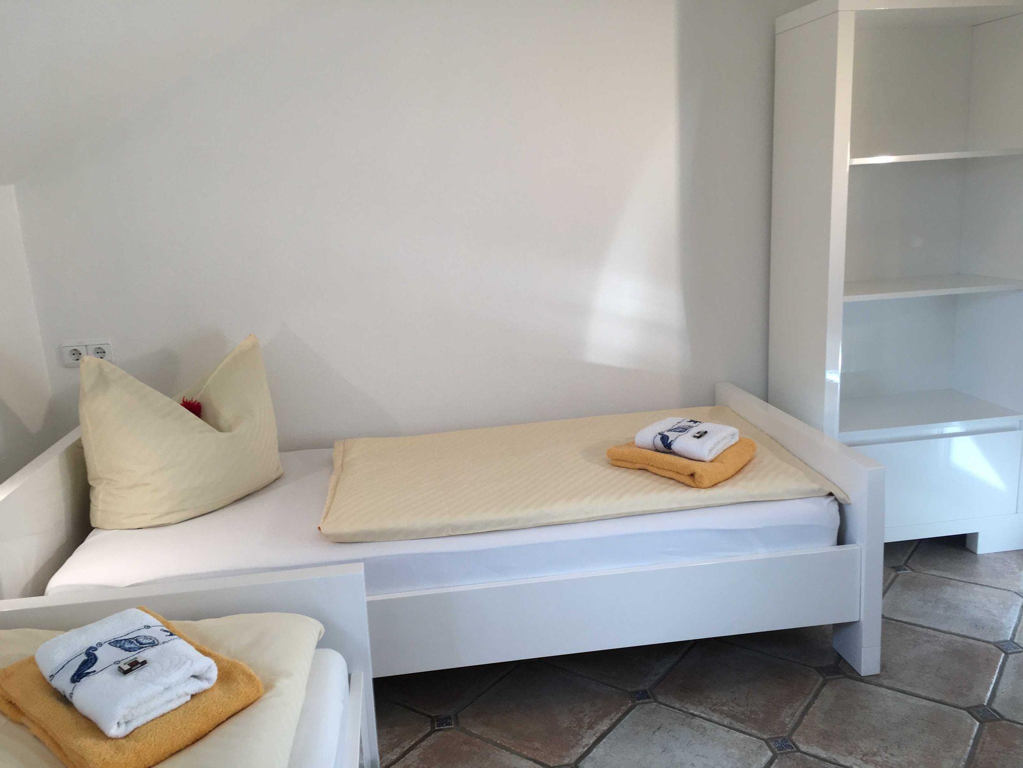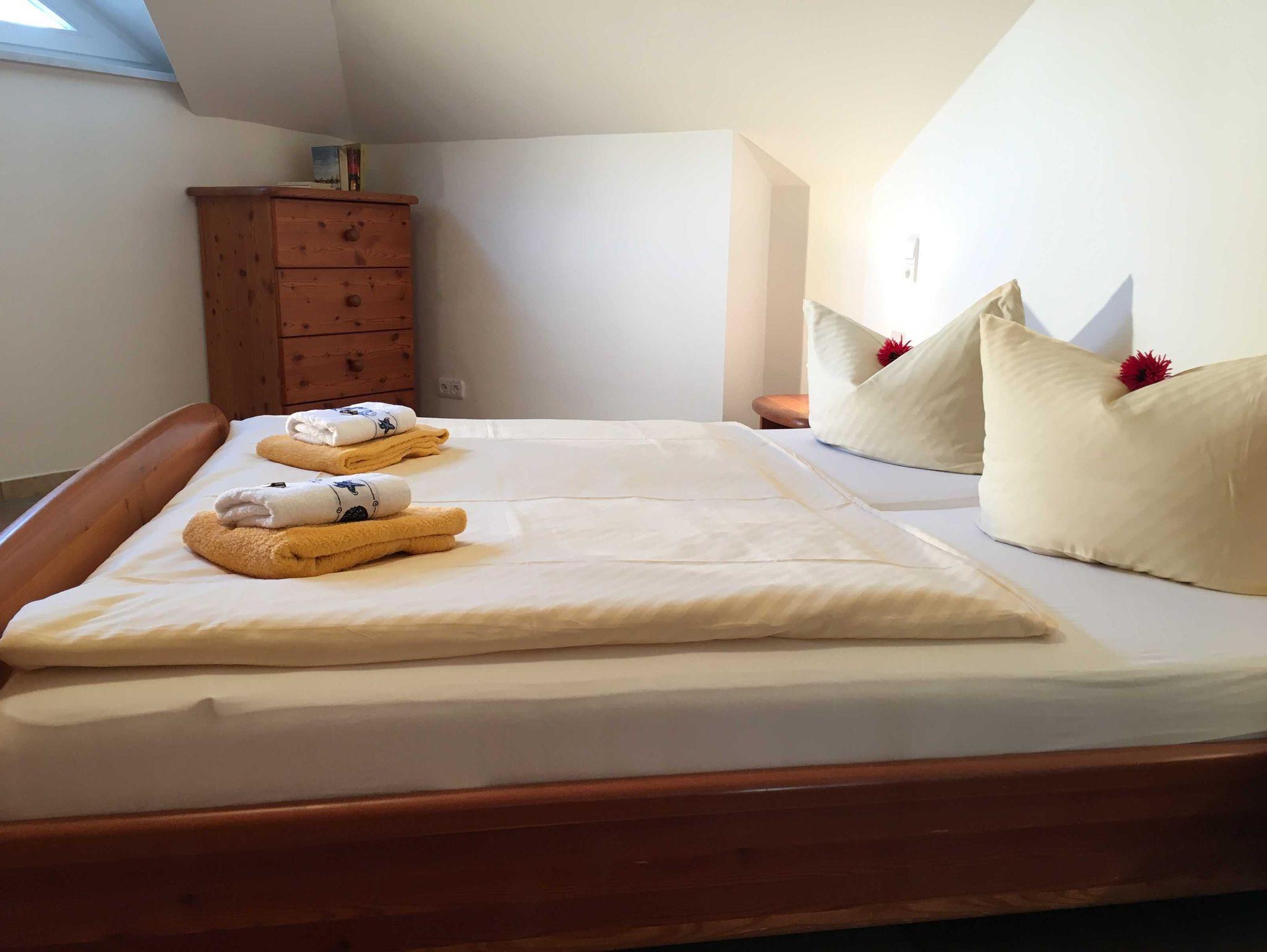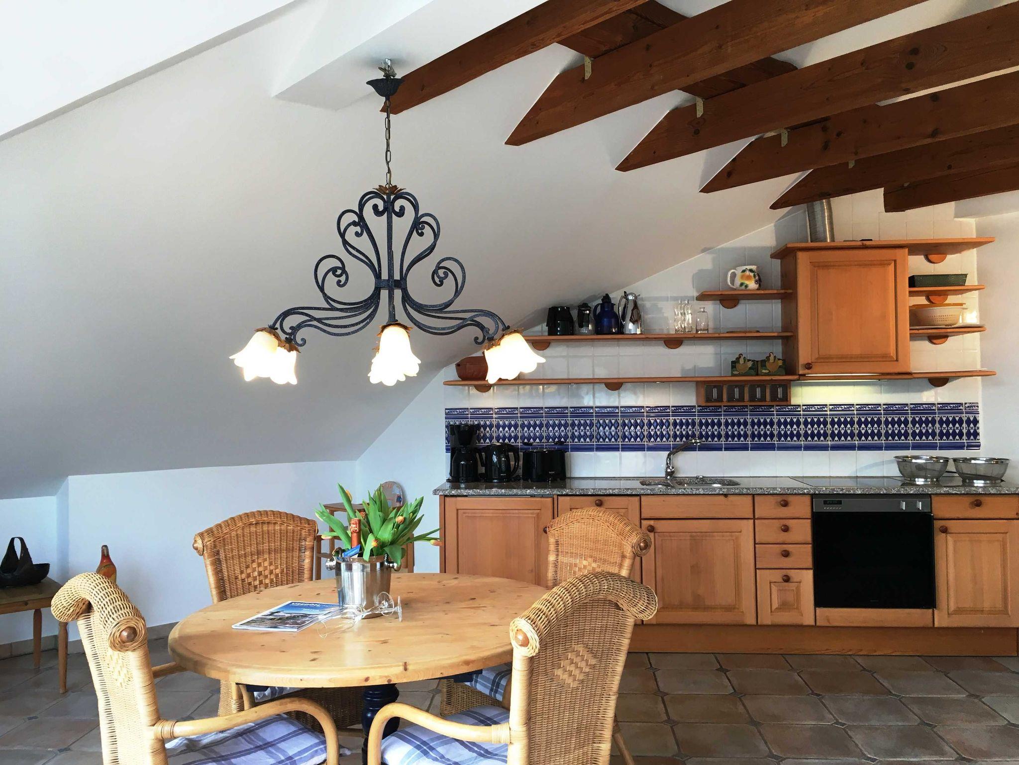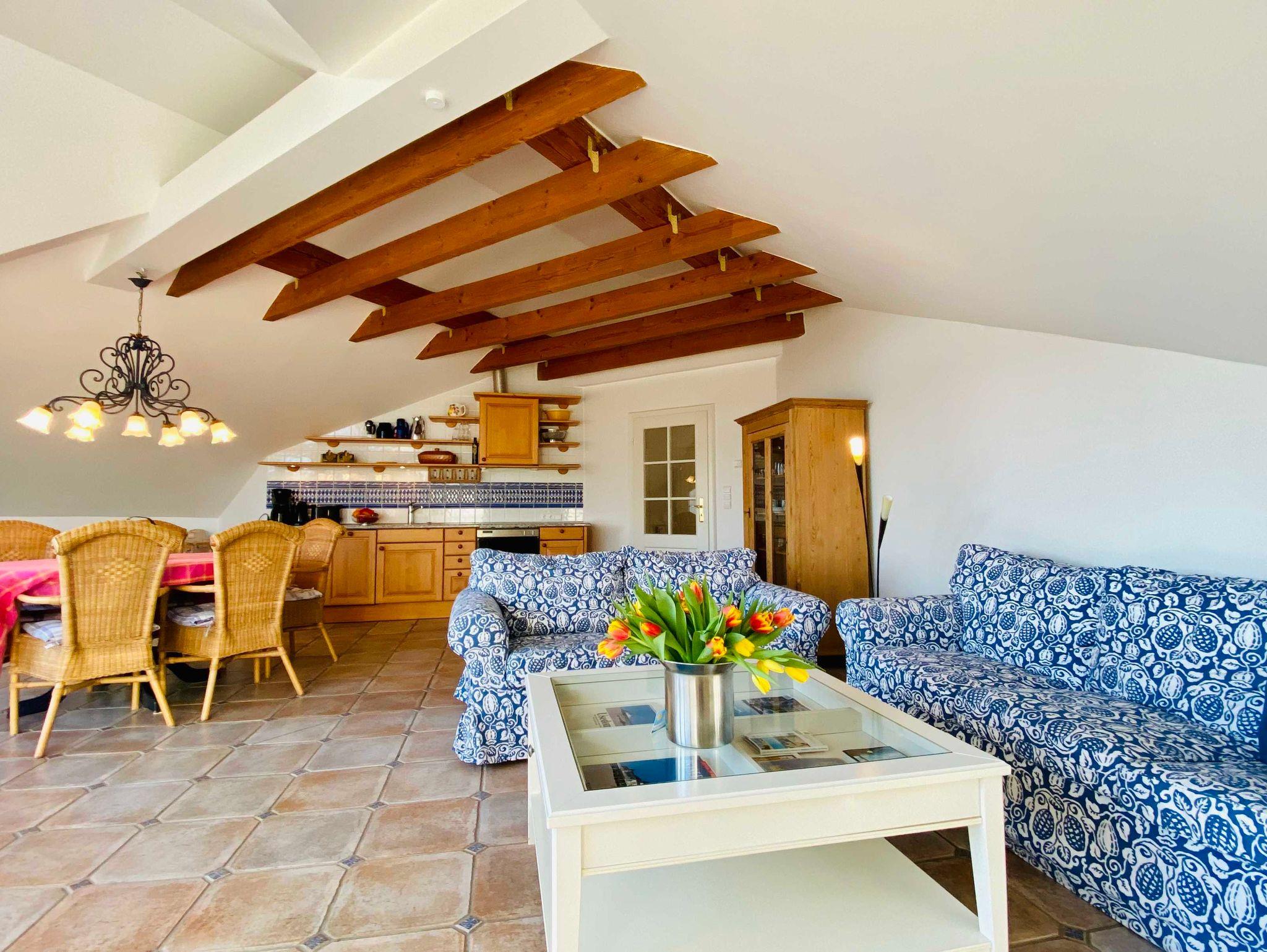 Die schöne 3-Raumwohnung 12 befindet sich im Dachgeschoss der Villa Caprivi und ist über das Treppenhaus zu erreichen. Der große Wohnraum hat eine gemütliche Couchecke, Esstisch und integrierete Küchenzeile mit Geschirrspüler, Backofen und Herd. Vom Wohnzimmer aus gelangen Sie zum seitlicher überdachter Balkon mit Seeblick. Es gibt ein Schlafzimmer mit Doppelbett und ein Schlafzimmer mit zwei Einzelbetten.