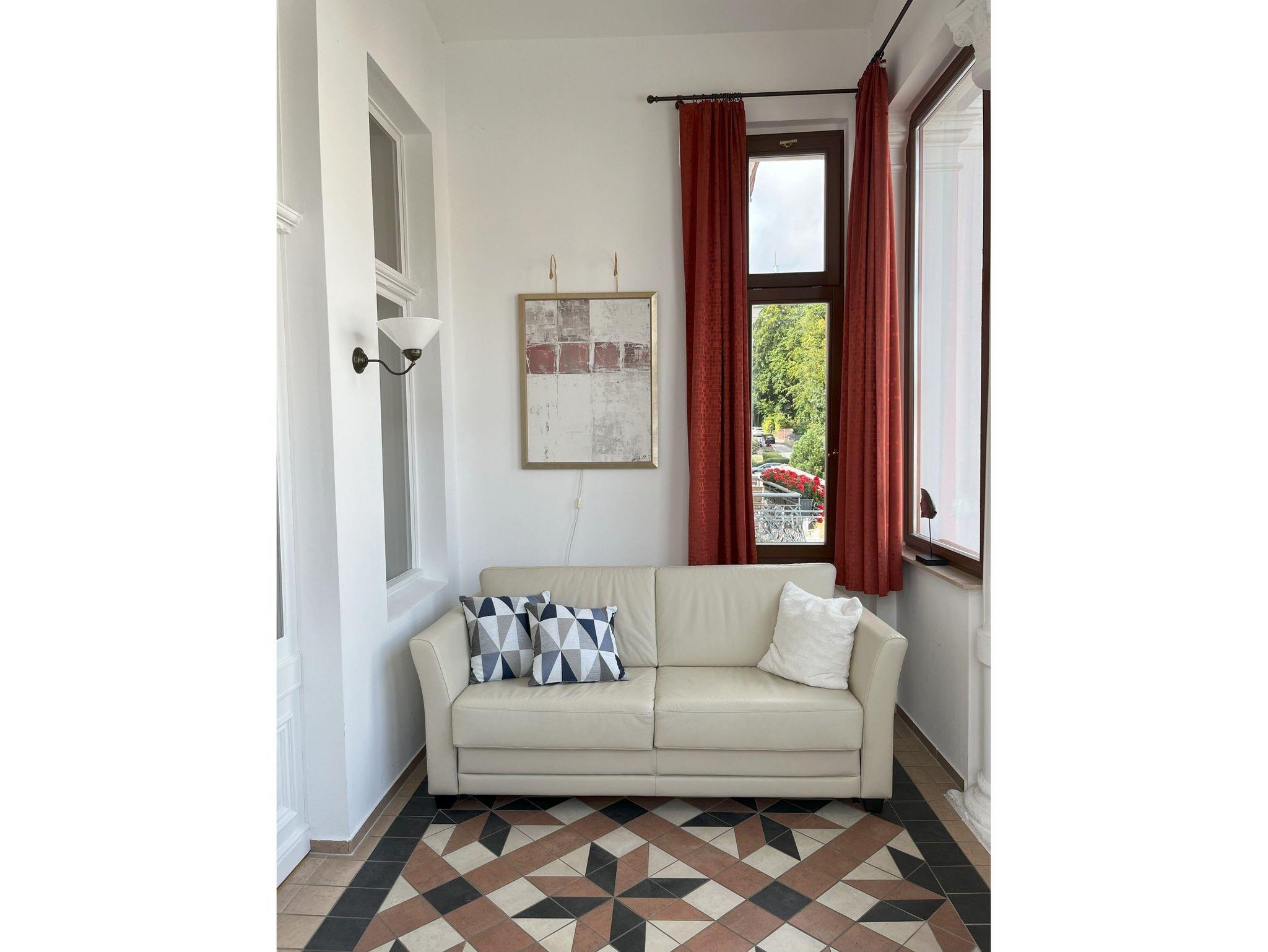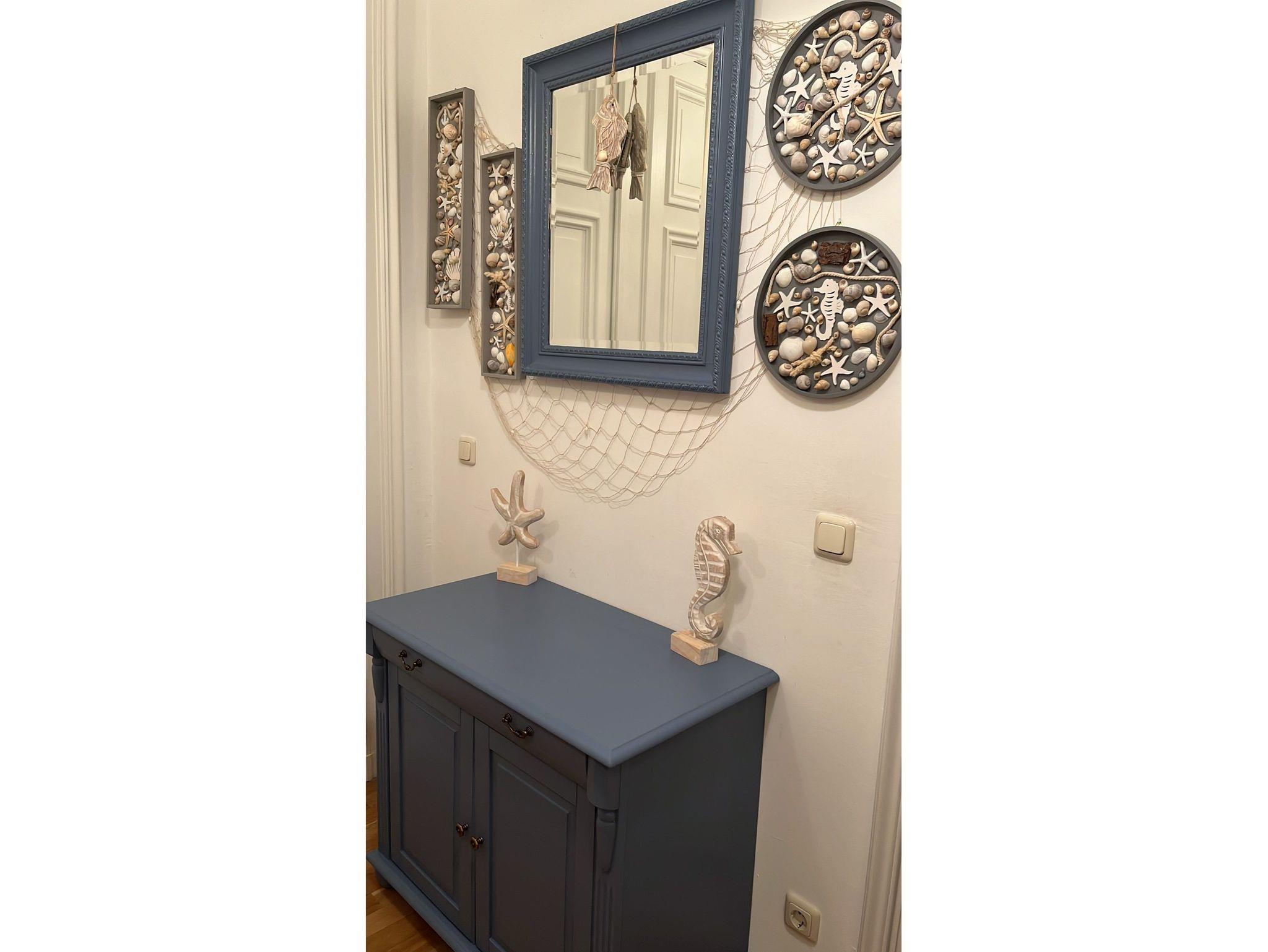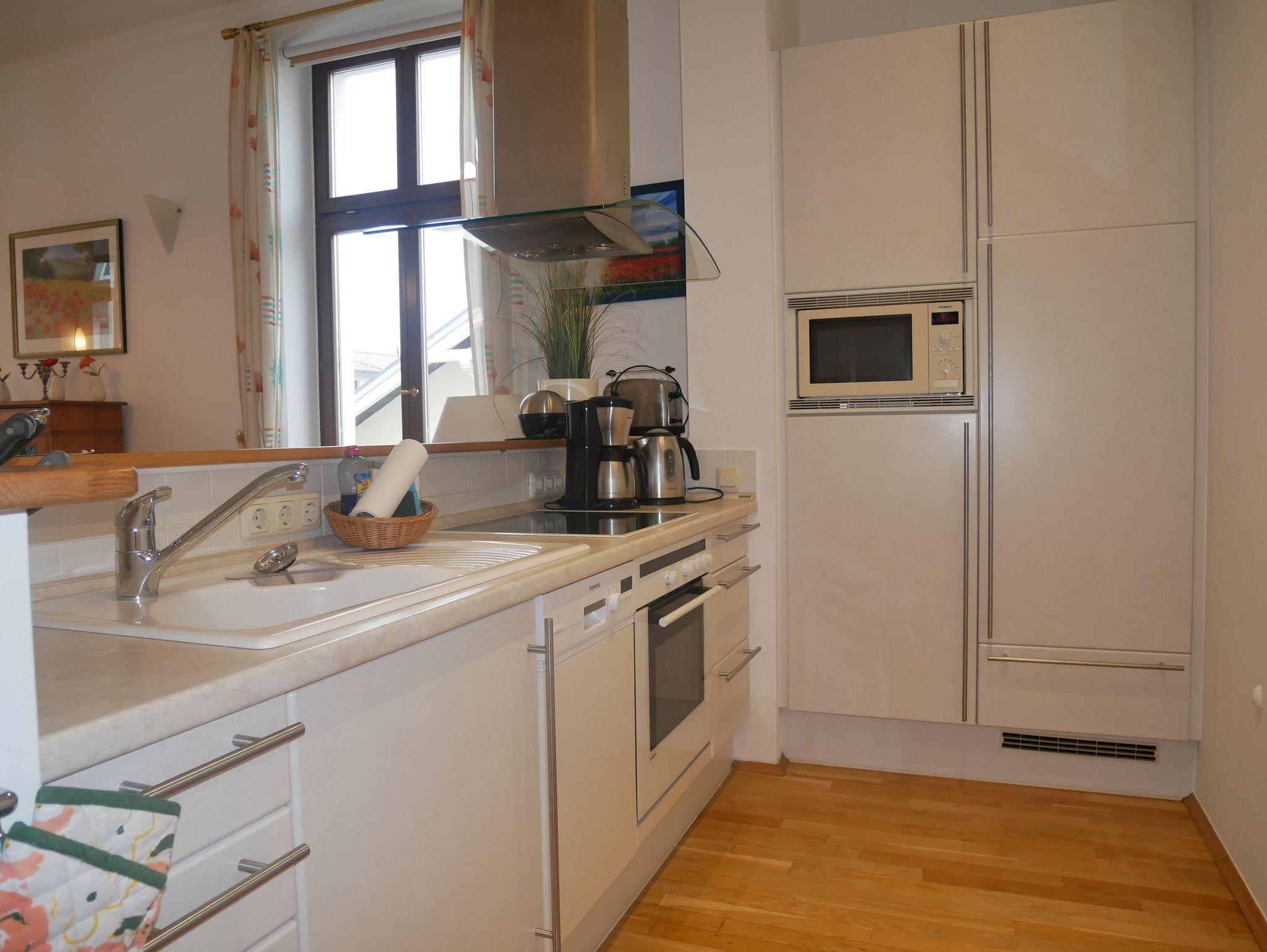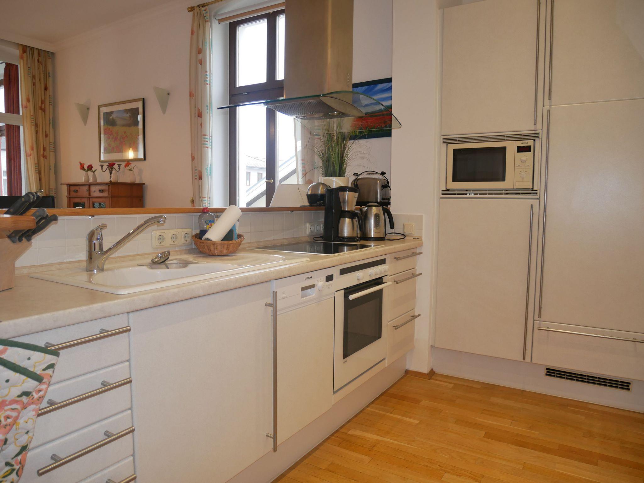 Die ca. 80 qm große Ferienwohnung befindet sich im 1. Obergeschoß der Villa Kramme. Der lichtdurchflutete Wohnraum besteht aus einer offenen Küchenzeile ausgestattet mit Kühlschrank mit Gefrierfach, Cerankochfeld, Backofen, Spülmaschine, Mikrowelle, Wasserkocher, Toaster, und Kaffeemaschine. Im Wohnbereich befindet sich der Esstisch mit Stühlen, einer Sitzgruppe aus Leder, Flachbild TV und einem Kamin. In der geschlossenen Loggia steht die Schlafcouch für die Aufbettung der 3+ 4 Person und 2 Ledersessel mit kleinen Tisch.