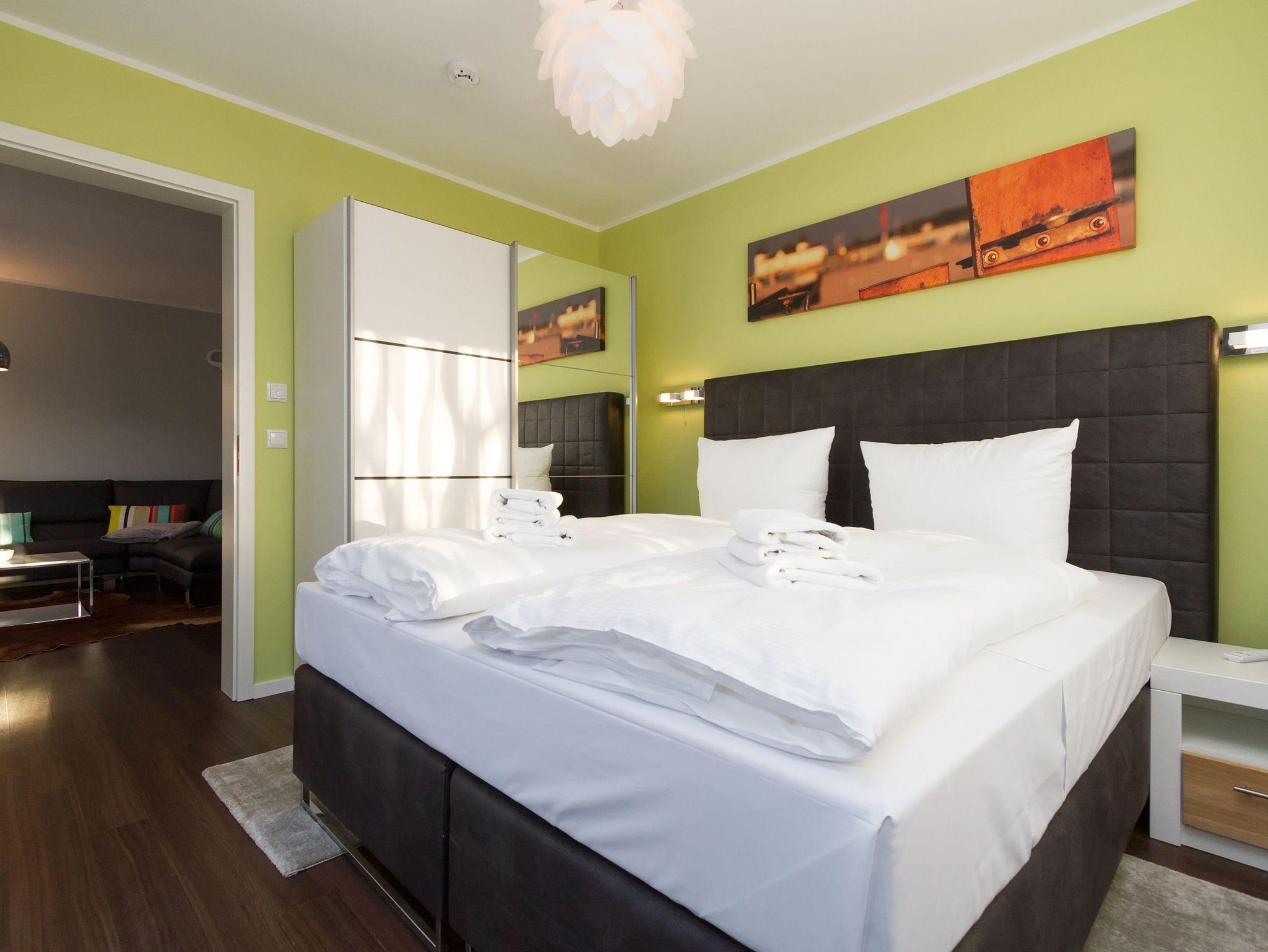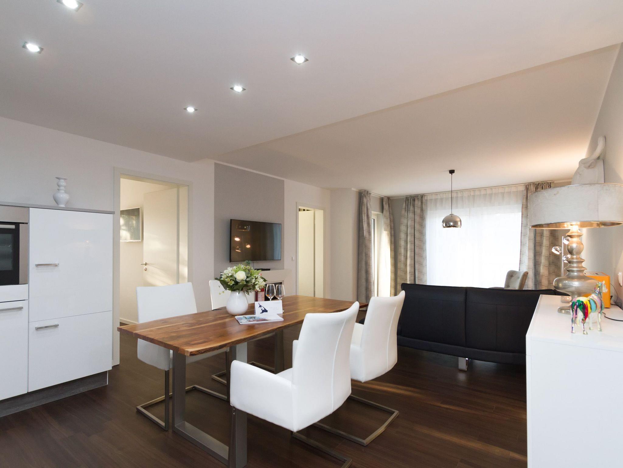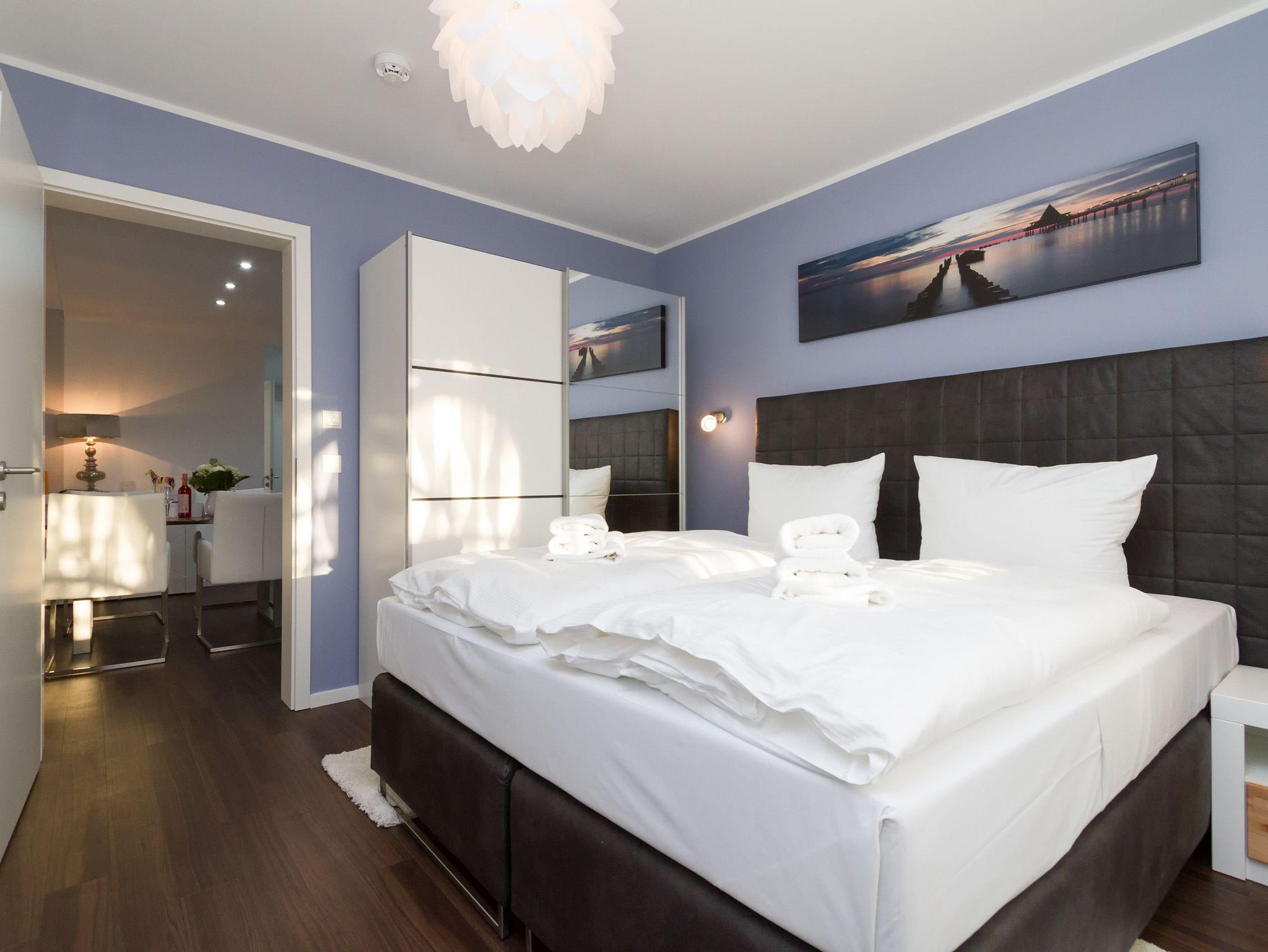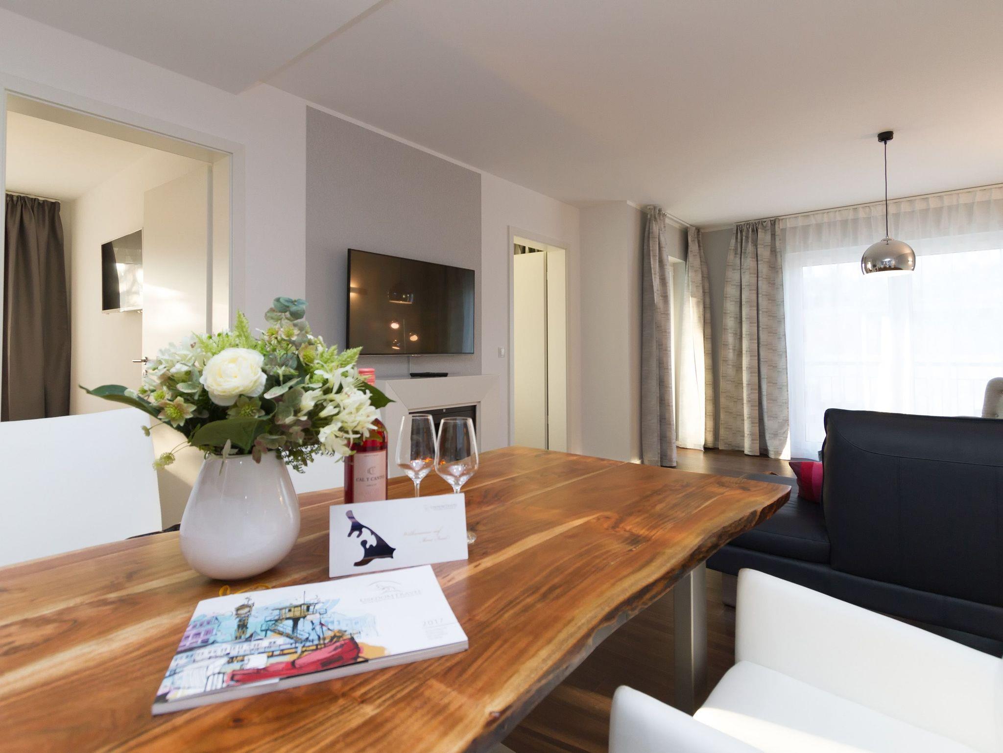 Eine frische [&] moderne Urlaubswelt, die durch ein geschmackvolles Design und die komfortable Ausstattung überzeugt, erwartet Sie im Appartement 14. In dem großzügigen 3-Raum-Appartement (68 qm), das von einem Inneneinrichter gestaltet wurde, finden 4 Personen und ein Kleinkind (im Babyreisebett) Platz zum Erholen. Der Eingangsbereich mit Flurgarderobe geht über in die offene, komplett ausgestattete Küche mit großem, schönen Essplatz. Hier schließt sich der gemütliche Wohnbereich an. Die loungige Couch ist für entspannte TV-Abende bestens geeignet, denn ein Flat-TV und eine Musikanlage mit Ipod-Docking-Station dürfen hier natürlich nicht fehlen. Ein moderner Elektrokamin sorgt per Knopfdruck für eine kuschlige Wohlfühlatmosphäre. Zwei Schlafzimmer mit bequemen Doppelboxspringbetten (1,80m x 2,00m), Flat-TV (1x mit DVD Player) und jeweils großem Schrank sorgen für erholsamen Schlaf. Auf dem Süd-Westbalkon (Zugang vom Wohnbereich und aus einem Schlafzimmer) genießen Sie in den Nachmittags- und Abendstunden die Usedomer Sonne. Ein großes Duschbad mit WC ergänzt das Domizil. Für Ihren Komfort sind die Betten bei der Anreise bezogen und Handtücher liegen bereit. Für kleine Gäste kann ein Kinderreisebett und ein Kinderhochstuhl ( gegen Gebühr) bestellt werden. Ein Pkw-Stellplatz steht in der Tiefgarage (max. Einfahrtshöhe 1,93 m) zur Verfügung. Das WAN-Netz kann kostenfrei genutzt werden.