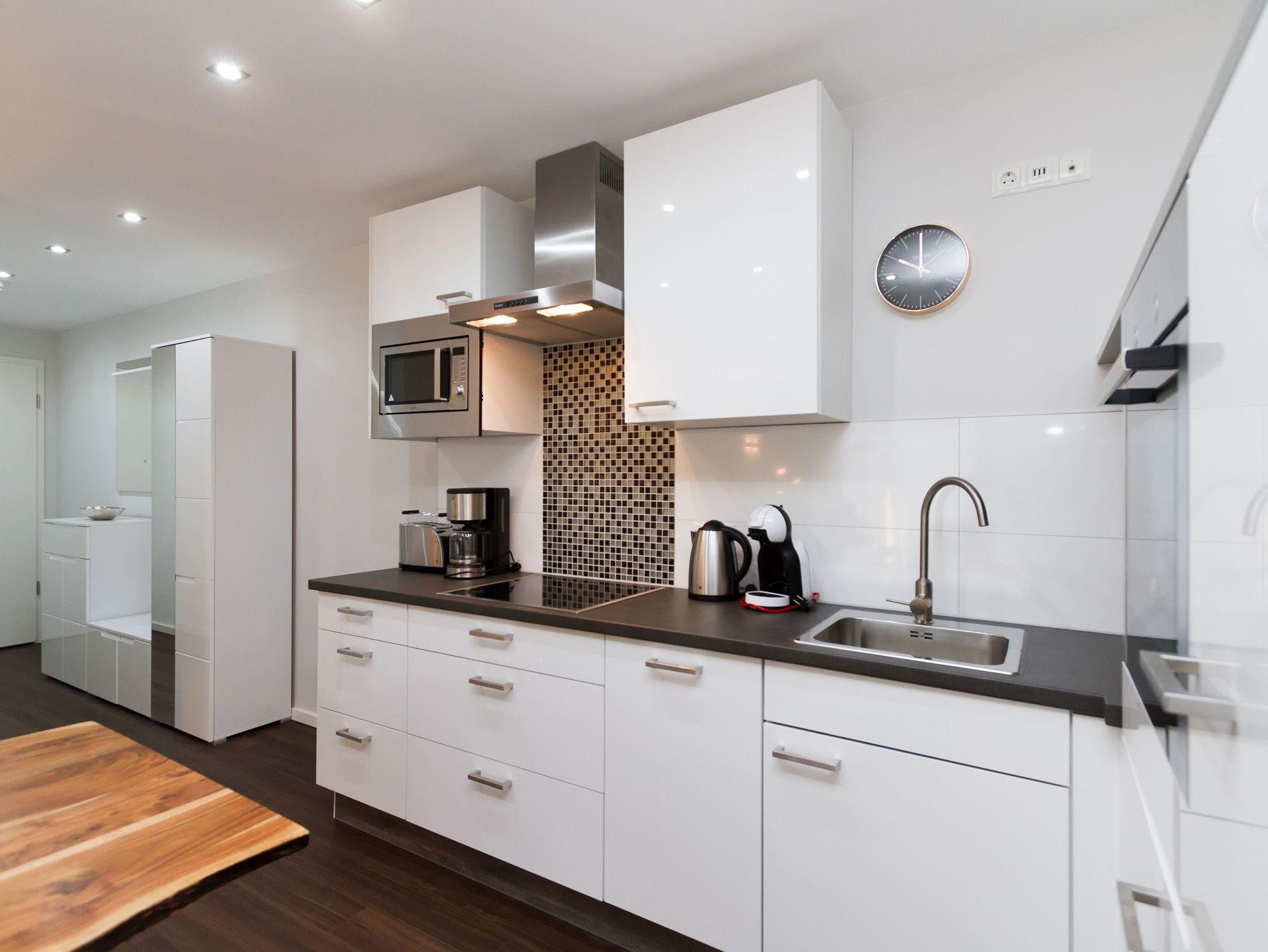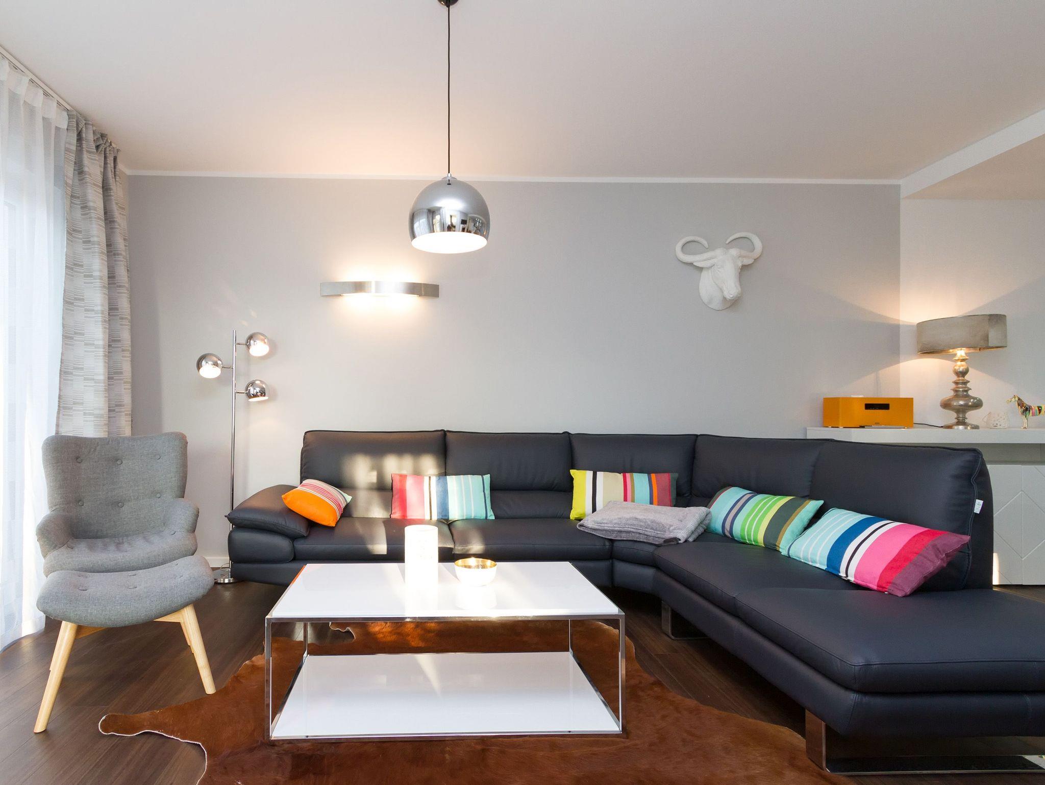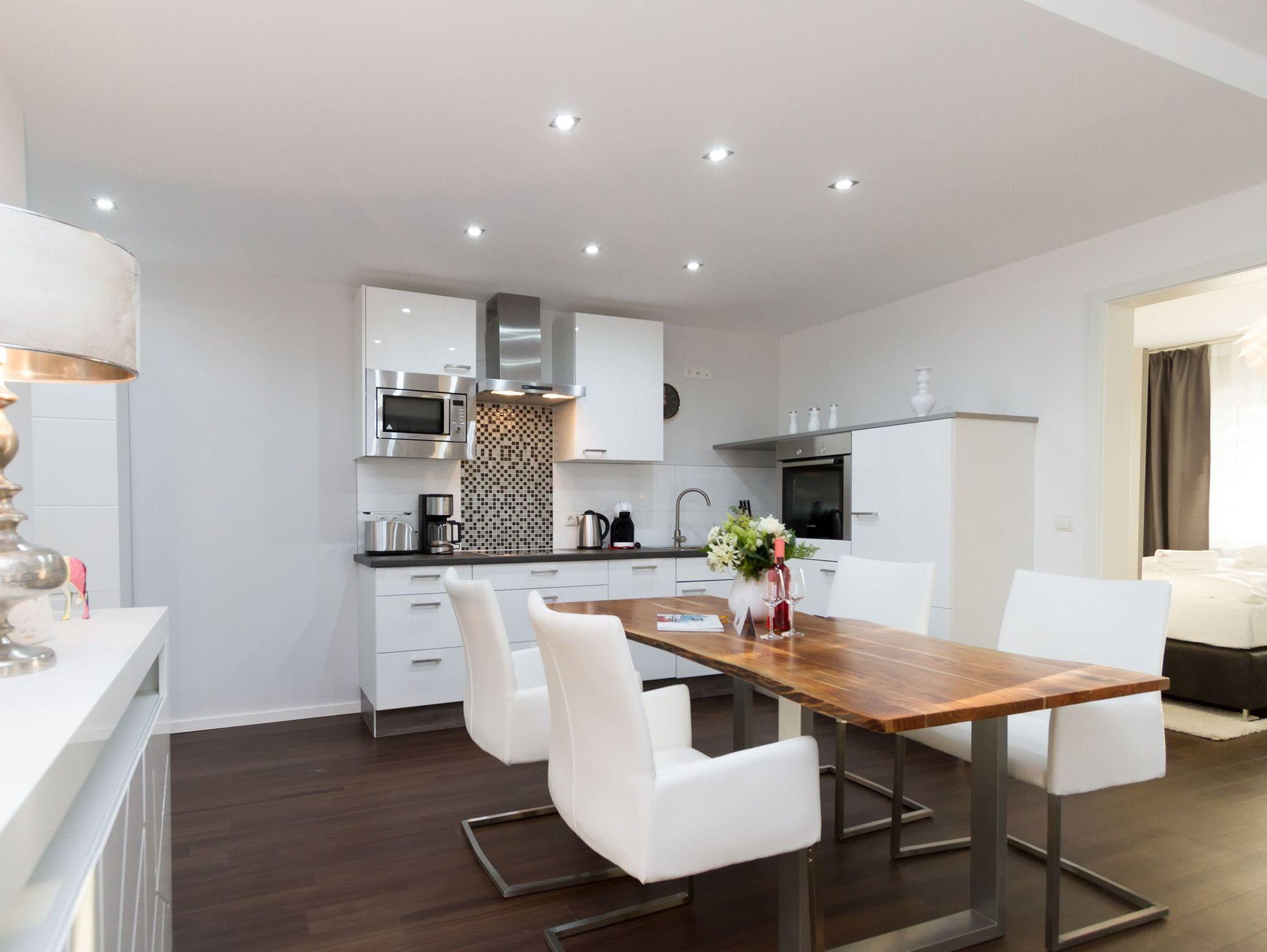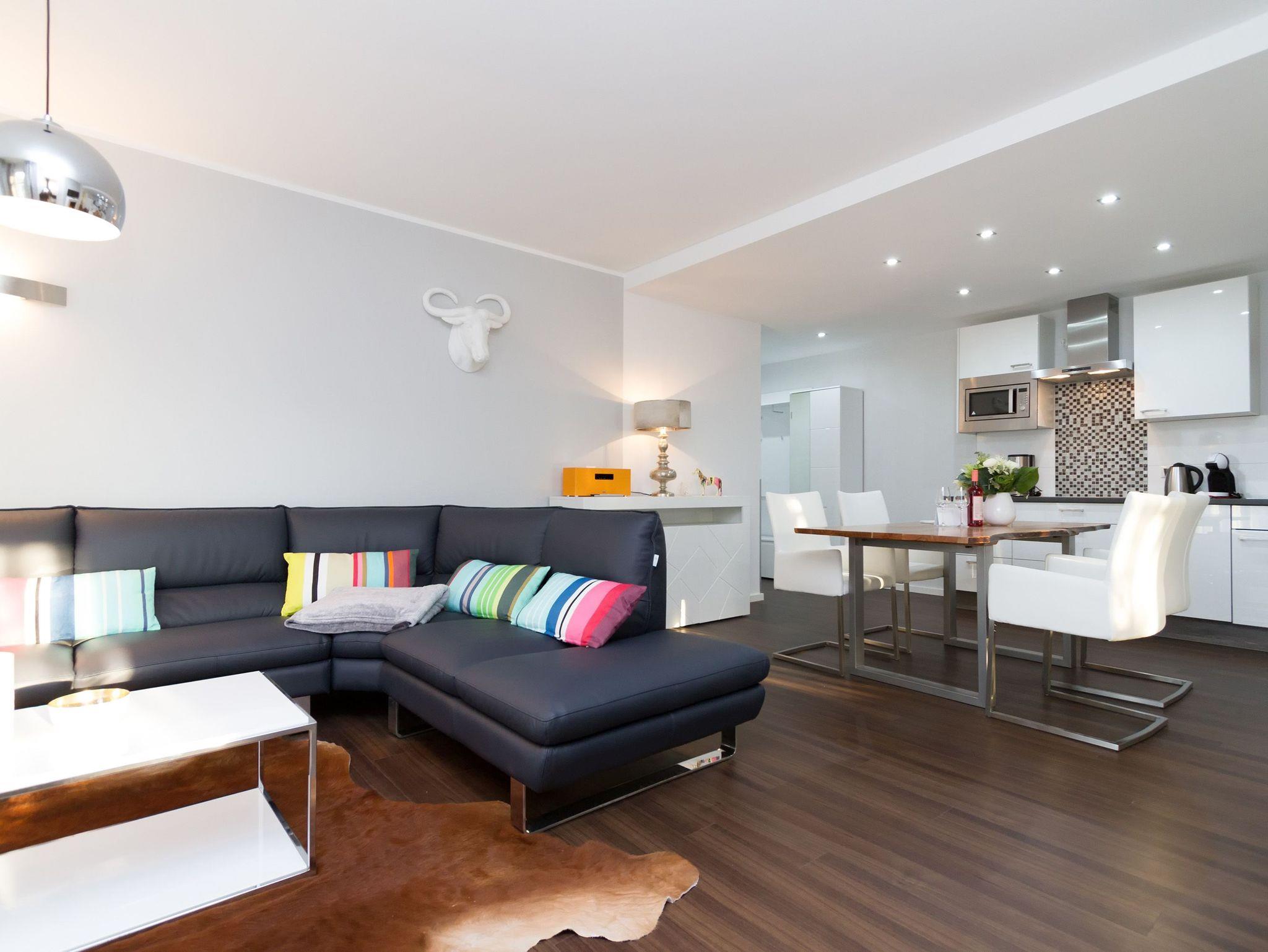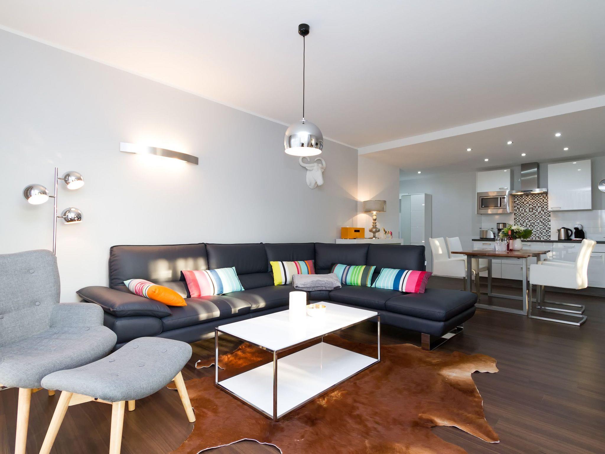 Eine frische [&] moderne Urlaubswelt, die durch ein geschmackvolles Design und die komfortable Ausstattung überzeugt, erwartet Sie im Appartement 14. In dem großzügigen 3-Raum-Appartement (68 qm), das von einem Inneneinrichter gestaltet wurde, finden 4 Personen und ein Kleinkind (im Babyreisebett) Platz zum Erholen. Der Eingangsbereich mit Flurgarderobe geht über in die offene, komplett ausgestattete Küche mit großem, schönen Essplatz. Hier schließt sich der gemütliche Wohnbereich an. Die loungige Couch ist für entspannte TV-Abende bestens geeignet, denn ein Flat-TV und eine Musikanlage mit Ipod-Docking-Station dürfen hier natürlich nicht fehlen. Ein moderner Elektrokamin sorgt per Knopfdruck für eine kuschlige Wohlfühlatmosphäre. Zwei Schlafzimmer mit bequemen Doppelboxspringbetten (1,80m x 2,00m), Flat-TV (1x mit DVD Player) und jeweils großem Schrank sorgen für erholsamen Schlaf. Auf dem Süd-Westbalkon (Zugang vom Wohnbereich und aus einem Schlafzimmer) genießen Sie in den Nachmittags- und Abendstunden die Usedomer Sonne. Ein großes Duschbad mit WC ergänzt das Domizil. Für Ihren Komfort sind die Betten bei der Anreise bezogen und Handtücher liegen bereit. Für kleine Gäste kann ein Kinderreisebett und ein Kinderhochstuhl ( gegen Gebühr) bestellt werden. Ein Pkw-Stellplatz steht in der Tiefgarage (max. Einfahrtshöhe 1,93 m) zur Verfügung. Das WAN-Netz kann kostenfrei genutzt werden.