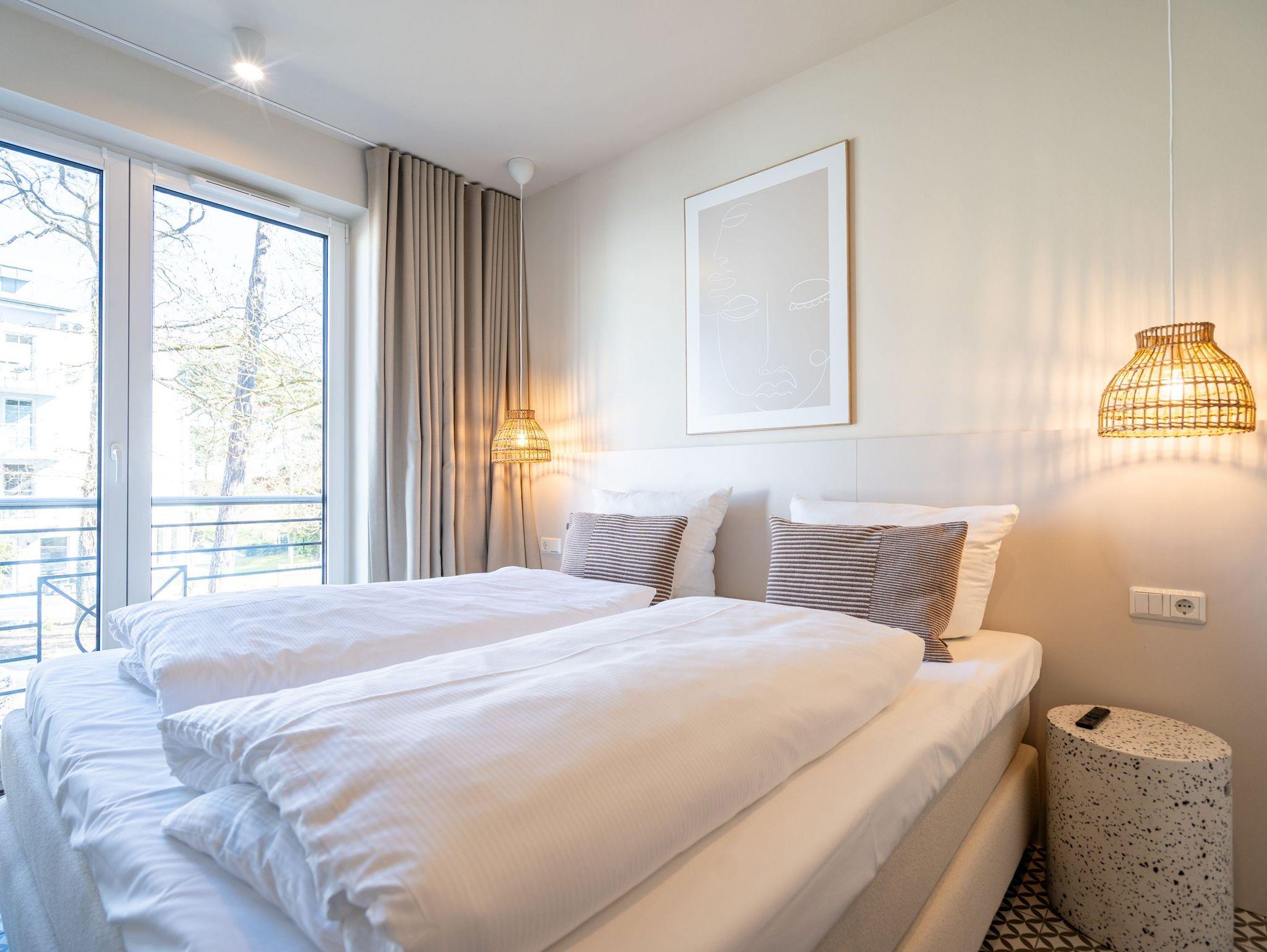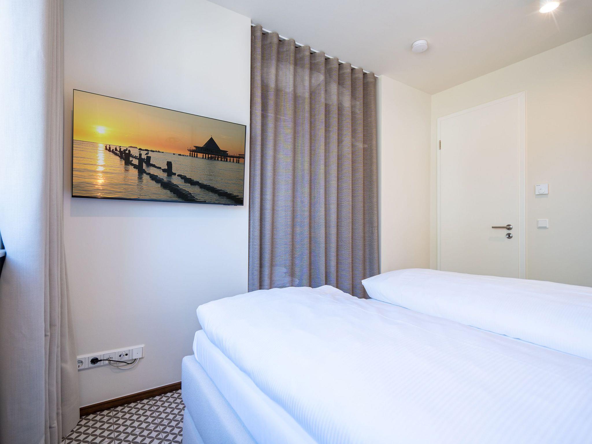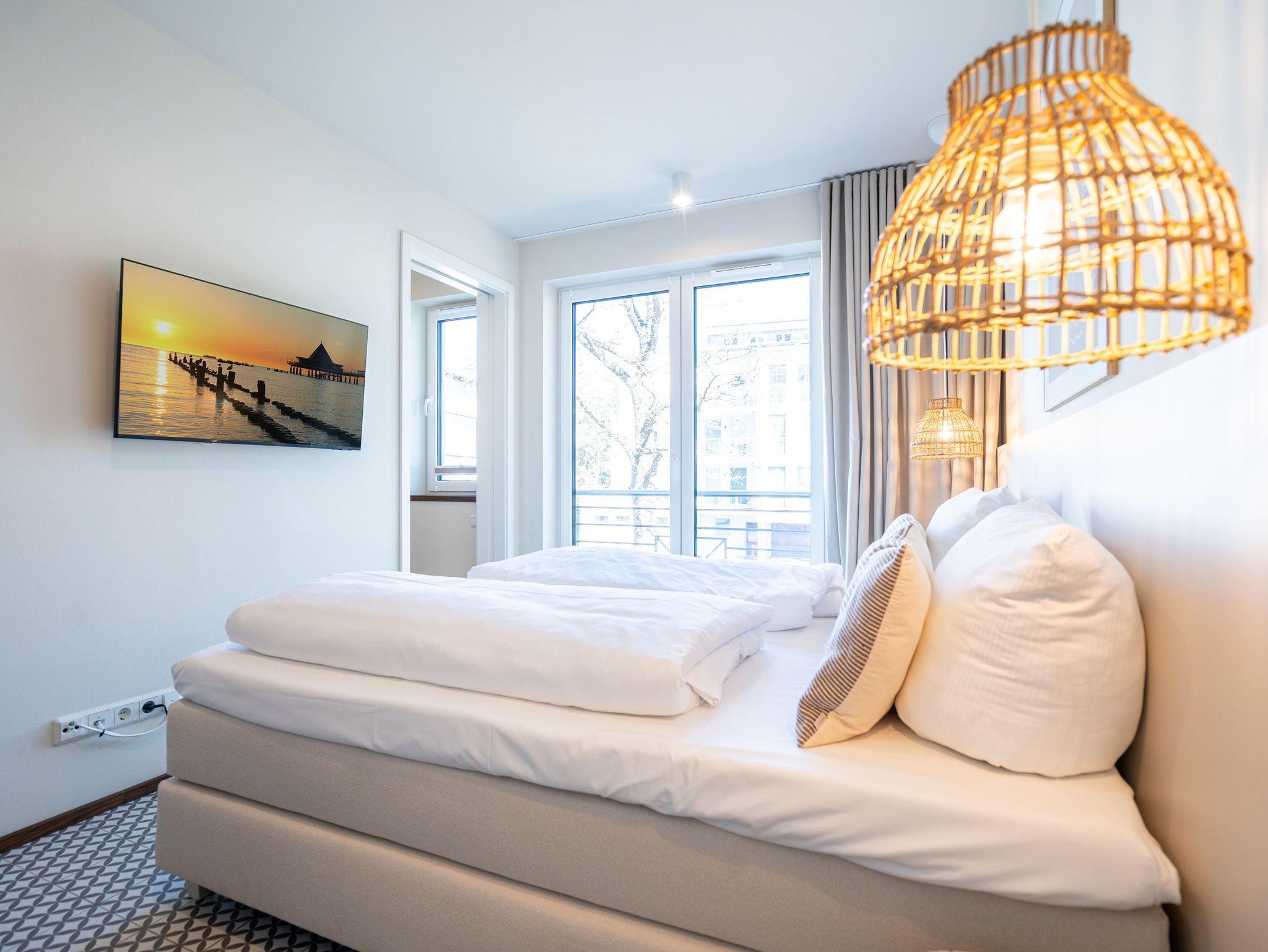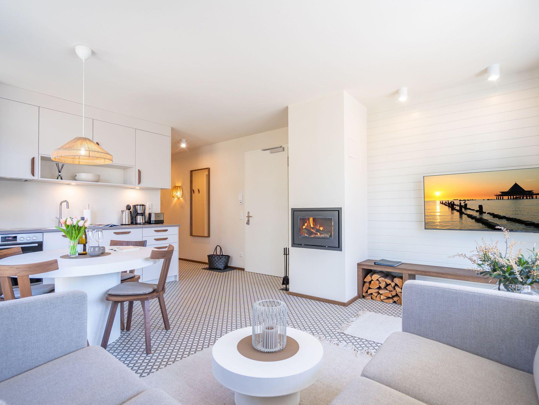 Willkommen im Quartier Maxim ? Ihre Ferienwohnung Nr. 4 für entspannte Tage an der Küste! Das moderne 3-Raum-Appartement im ersten Obergeschoss bietet mit 68 m² genug Platz für bis zu vier Personen und ist ideal für Familien oder kleine Gruppen, die Komfort und stilvolles Ambiente schätzen. Der offene Wohnbereich ist geschmackvoll eingerichtet und lädt mit einem gemütlichen Sofa, einem 55-Zoll-Flachbild-TV und einem Kaminofen zu entspannten Abenden ein. Die gut ausgestattete Küche bietet alles, was das Herz begehrt ? darunter einen Backofen, ein Induktionskochfeld, eine Spülmaschine sowie einen Kühlschrank mit Gefrierfach. Vom Wohnbereich aus gelangen Sie direkt auf den 8 m² großen Süd-Ost-Balkon, der für sonnige Frühstücke oder entspannte Stunden im Freien wie geschaffen ist. Das Appartement verfügt über zwei großzügige Schlafzimmer, die jeweils mit einem komfortablen Boxspring-Doppelbett (1,80 m x 2,00 m), einem Kleiderschrank und einem weiteren Flachbild-TV ausgestattet sind ? ideal für erholsamen Schlaf. Für zusätzlichen Komfort sorgen zwei Badezimmer: Das erste, innenliegende Bad bietet eine Dusche, einen Waschtisch und eine finnische Sauna, die für wohltuende Entspannung sorgt. Das zweite, helle Tageslichtbad ist direkt vom zweiten Schlafzimmer aus zugänglich und ebenfalls mit Dusche, Waschtisch und WC ausgestattet. Zusätzliche Annehmlichkeiten wie ein Waschtrockner im Flureinbauschrank und kostenfreies WLAN runden das Angebot ab. Ein abschließbarer Kellerraum bietet Platz für Fahrräder. Ein PKW-Stellplatz in der Tiefgarage gehört ebenfalls zur Wohnung. Genießen Sie erholsame Tage im stilvollen Quartier Maxim und lassen Sie den Alltag hinter sich ? hier wurde an alles gedacht!