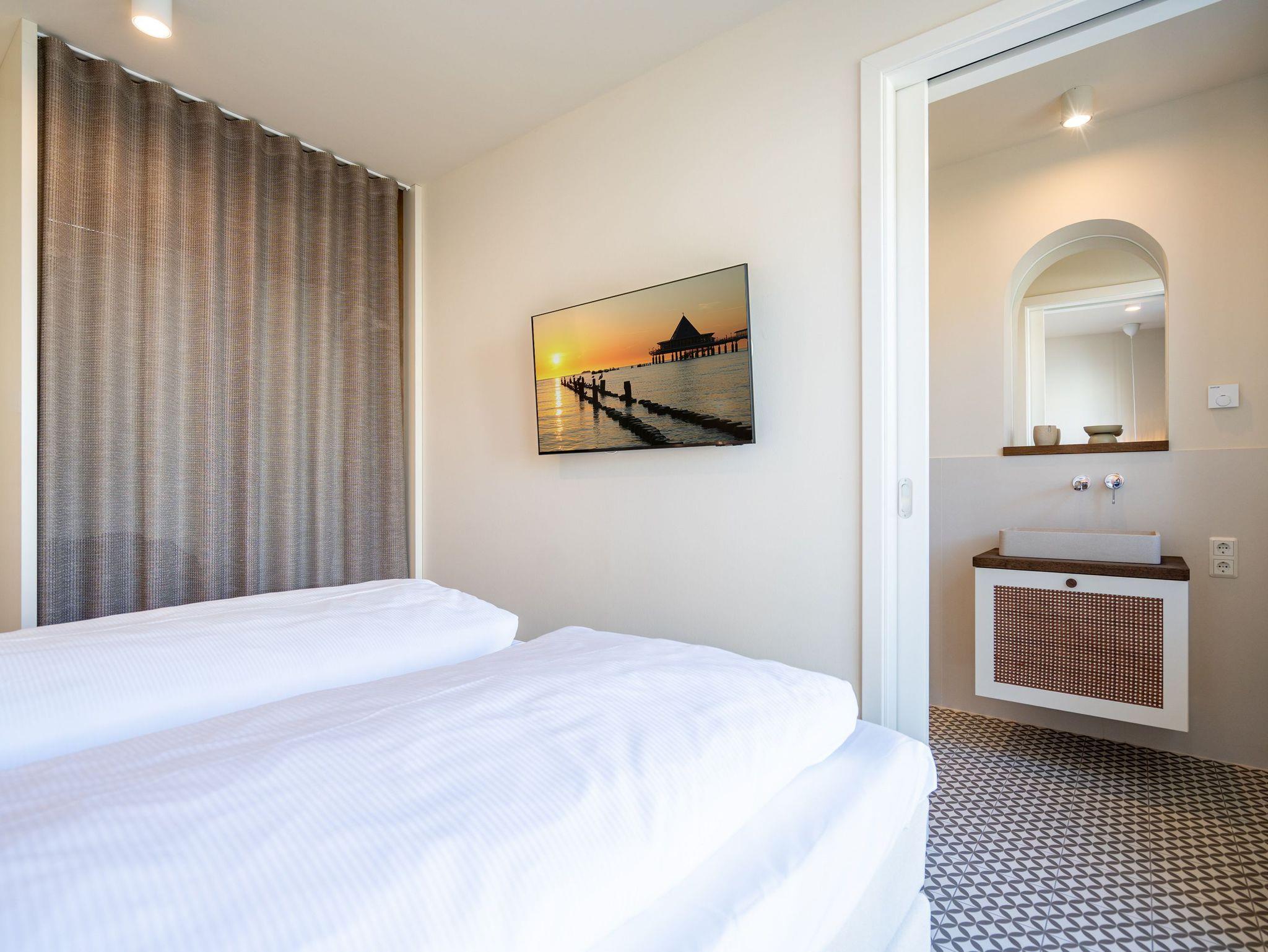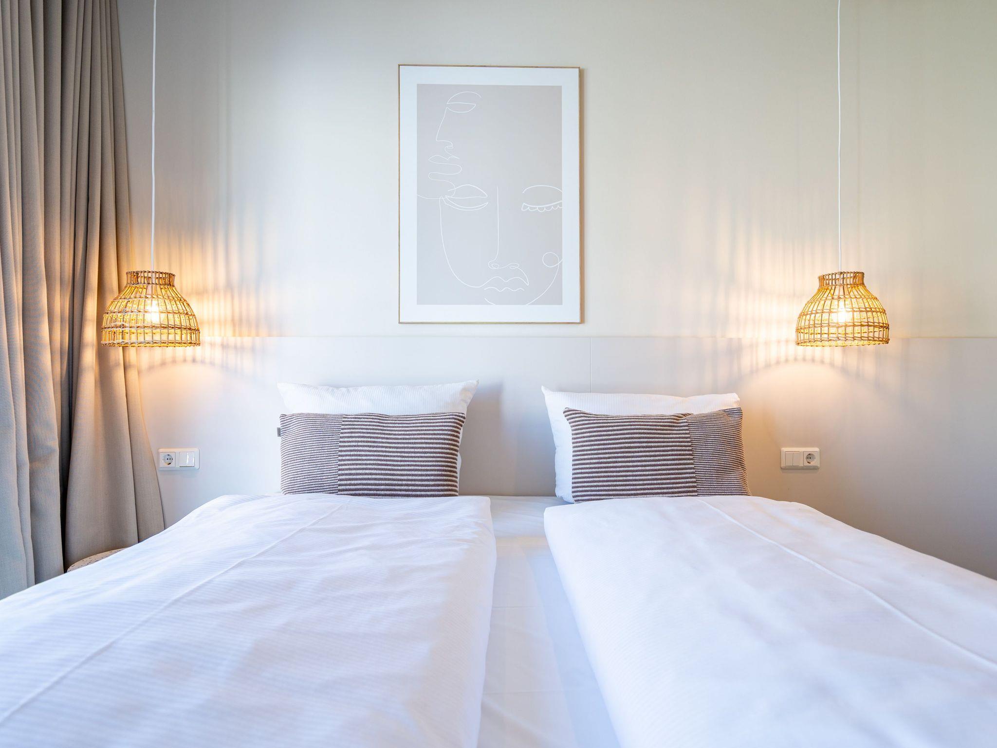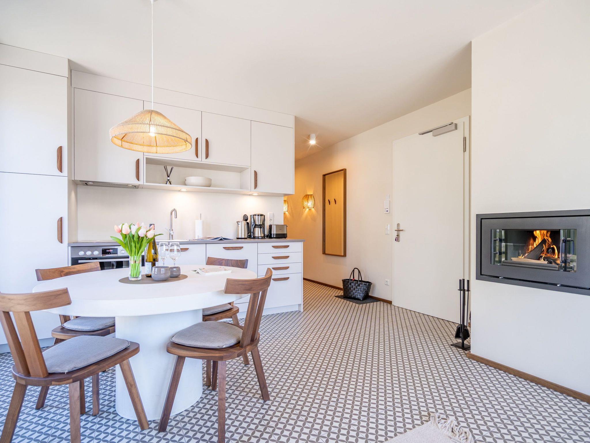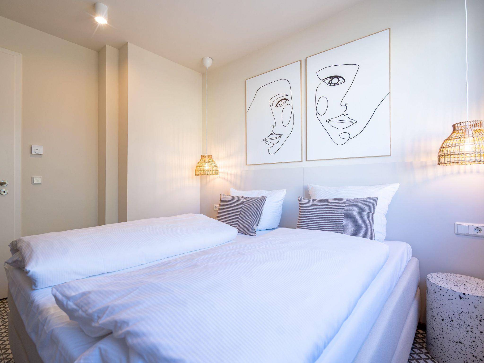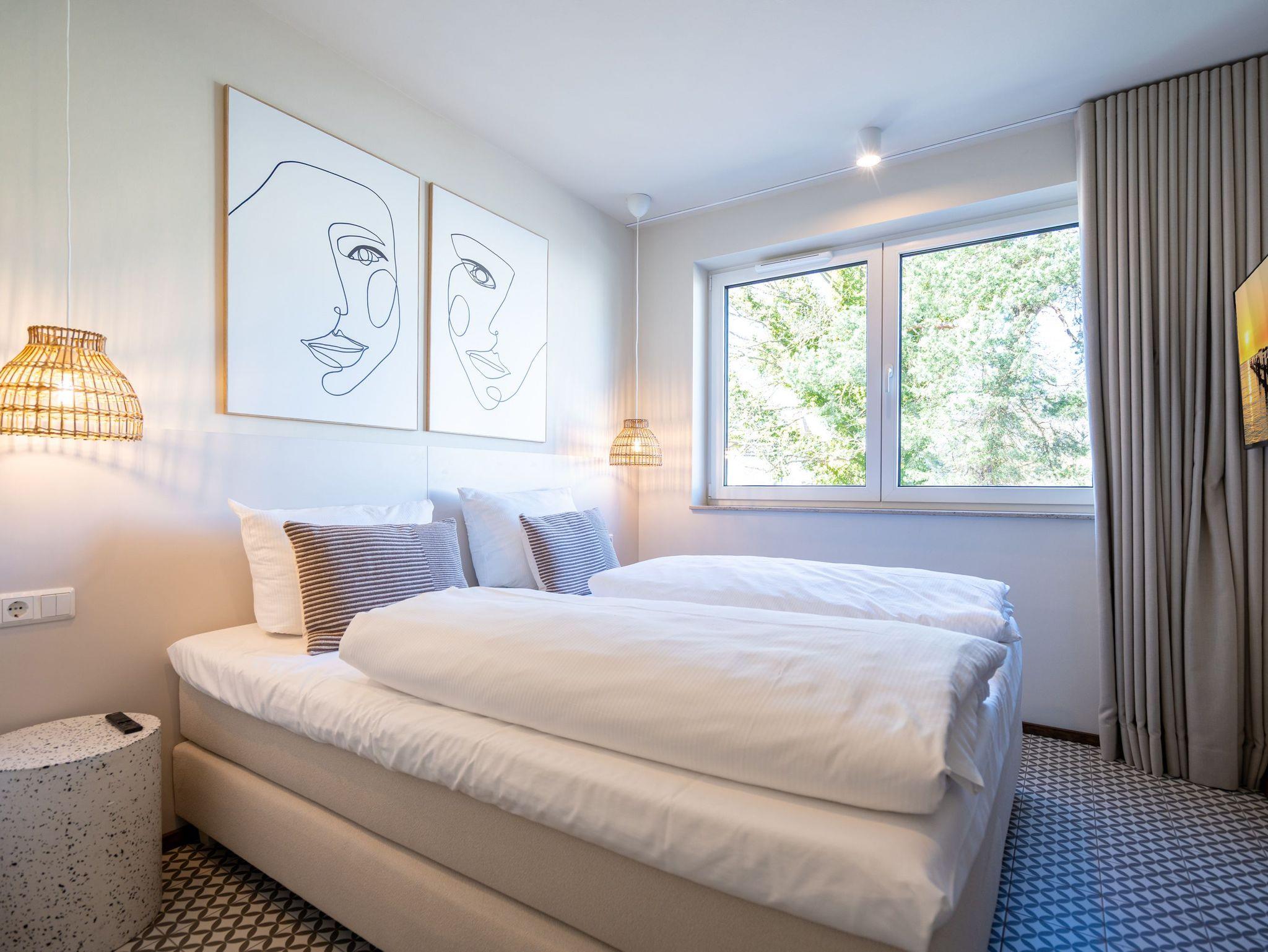 Willkommen im Quartier Maxim ? Ihre Ferienwohnung Nr. 4 für entspannte Tage an der Küste! Das moderne 3-Raum-Appartement im ersten Obergeschoss bietet mit 68 m² genug Platz für bis zu vier Personen und ist ideal für Familien oder kleine Gruppen, die Komfort und stilvolles Ambiente schätzen. Der offene Wohnbereich ist geschmackvoll eingerichtet und lädt mit einem gemütlichen Sofa, einem 55-Zoll-Flachbild-TV und einem Kaminofen zu entspannten Abenden ein. Die gut ausgestattete Küche bietet alles, was das Herz begehrt ? darunter einen Backofen, ein Induktionskochfeld, eine Spülmaschine sowie einen Kühlschrank mit Gefrierfach. Vom Wohnbereich aus gelangen Sie direkt auf den 8 m² großen Süd-Ost-Balkon, der für sonnige Frühstücke oder entspannte Stunden im Freien wie geschaffen ist. Das Appartement verfügt über zwei großzügige Schlafzimmer, die jeweils mit einem komfortablen Boxspring-Doppelbett (1,80 m x 2,00 m), einem Kleiderschrank und einem weiteren Flachbild-TV ausgestattet sind ? ideal für erholsamen Schlaf. Für zusätzlichen Komfort sorgen zwei Badezimmer: Das erste, innenliegende Bad bietet eine Dusche, einen Waschtisch und eine finnische Sauna, die für wohltuende Entspannung sorgt. Das zweite, helle Tageslichtbad ist direkt vom zweiten Schlafzimmer aus zugänglich und ebenfalls mit Dusche, Waschtisch und WC ausgestattet. Zusätzliche Annehmlichkeiten wie ein Waschtrockner im Flureinbauschrank und kostenfreies WLAN runden das Angebot ab. Ein abschließbarer Kellerraum bietet Platz für Fahrräder. Ein PKW-Stellplatz in der Tiefgarage gehört ebenfalls zur Wohnung. Genießen Sie erholsame Tage im stilvollen Quartier Maxim und lassen Sie den Alltag hinter sich ? hier wurde an alles gedacht!