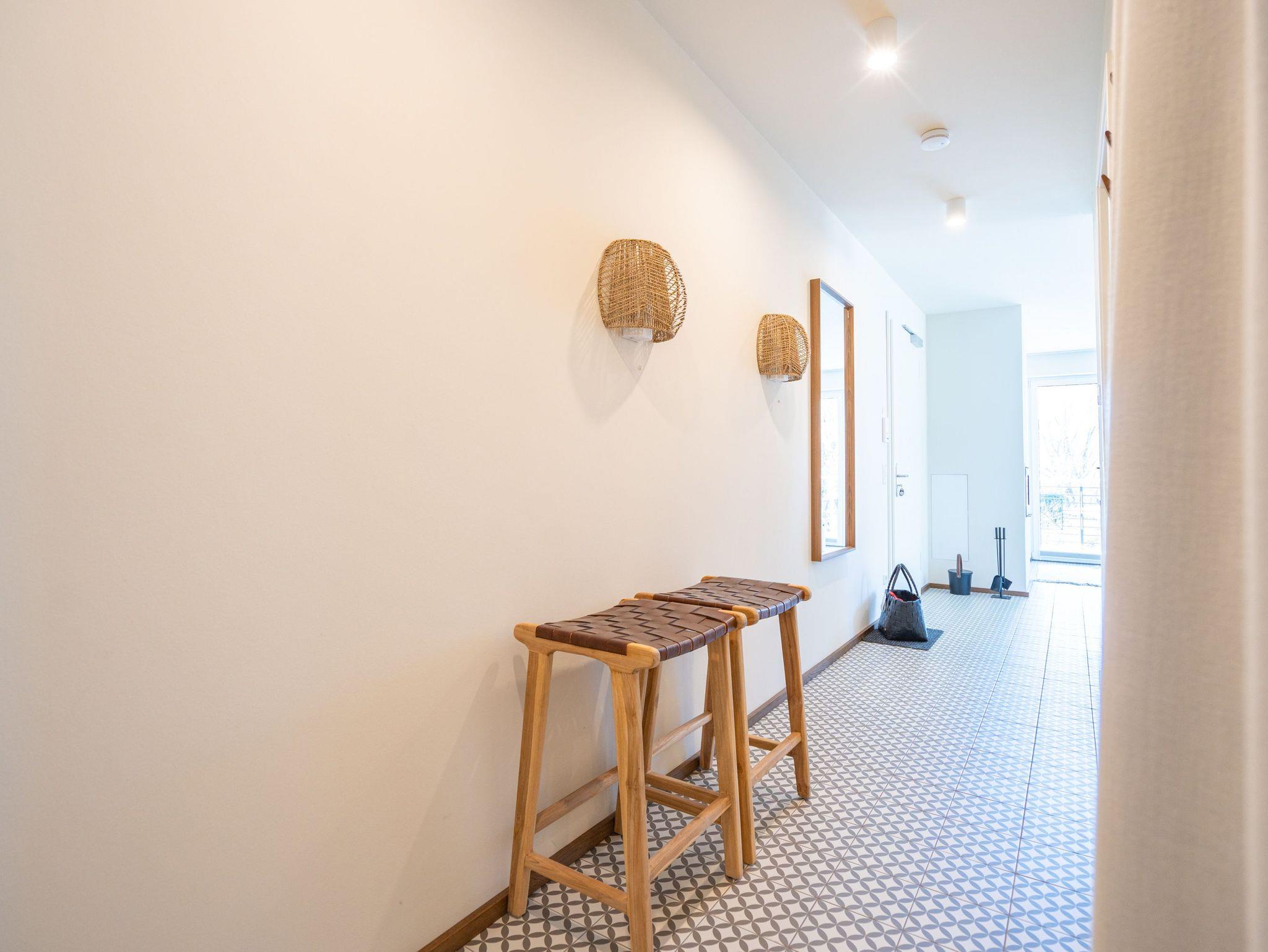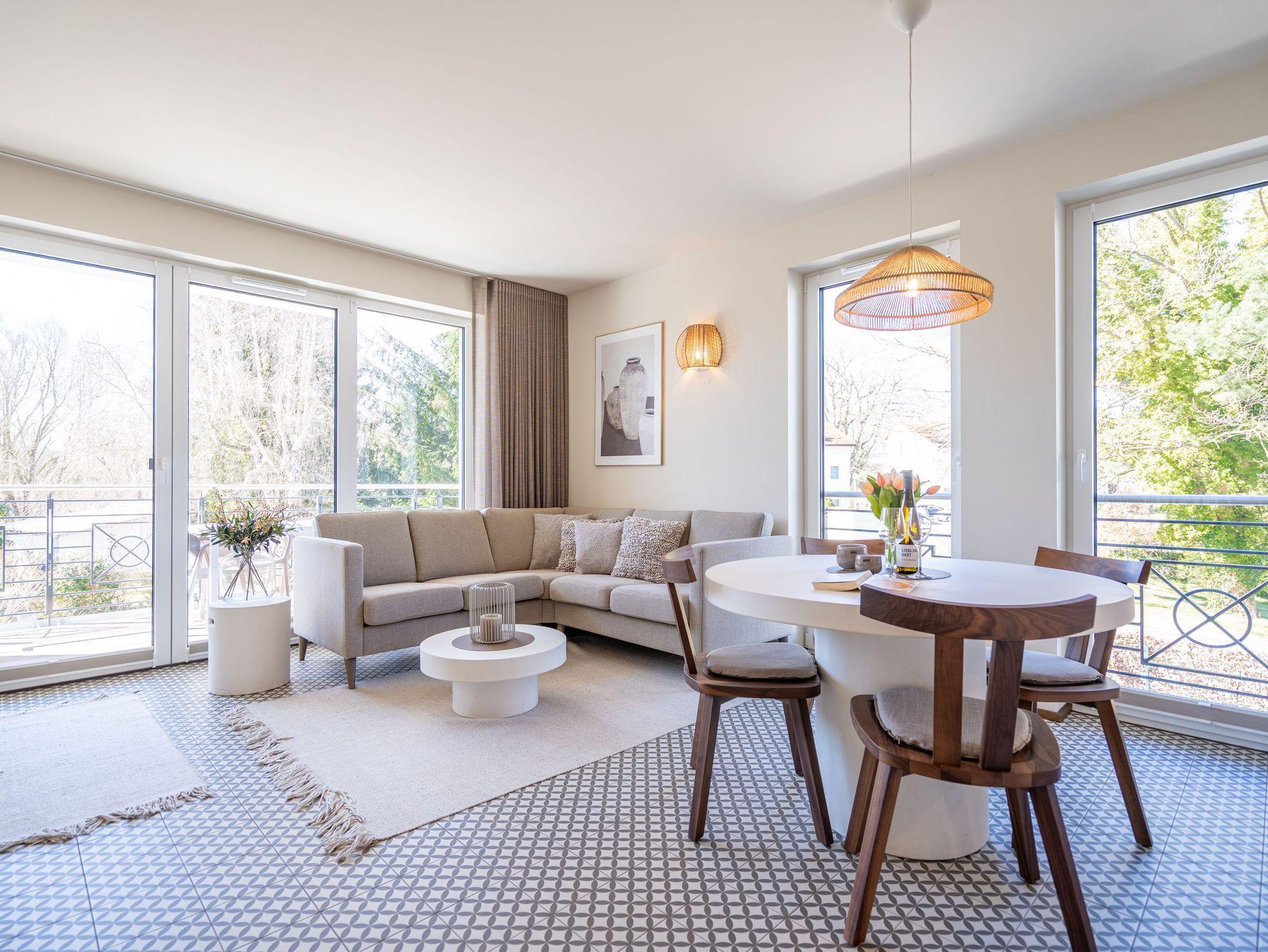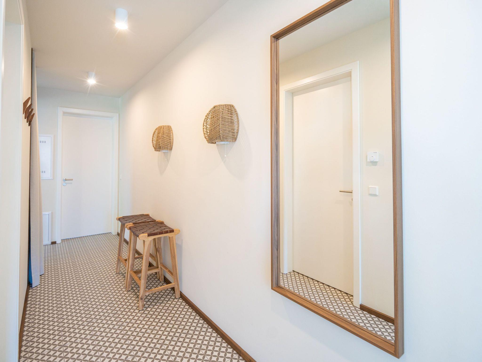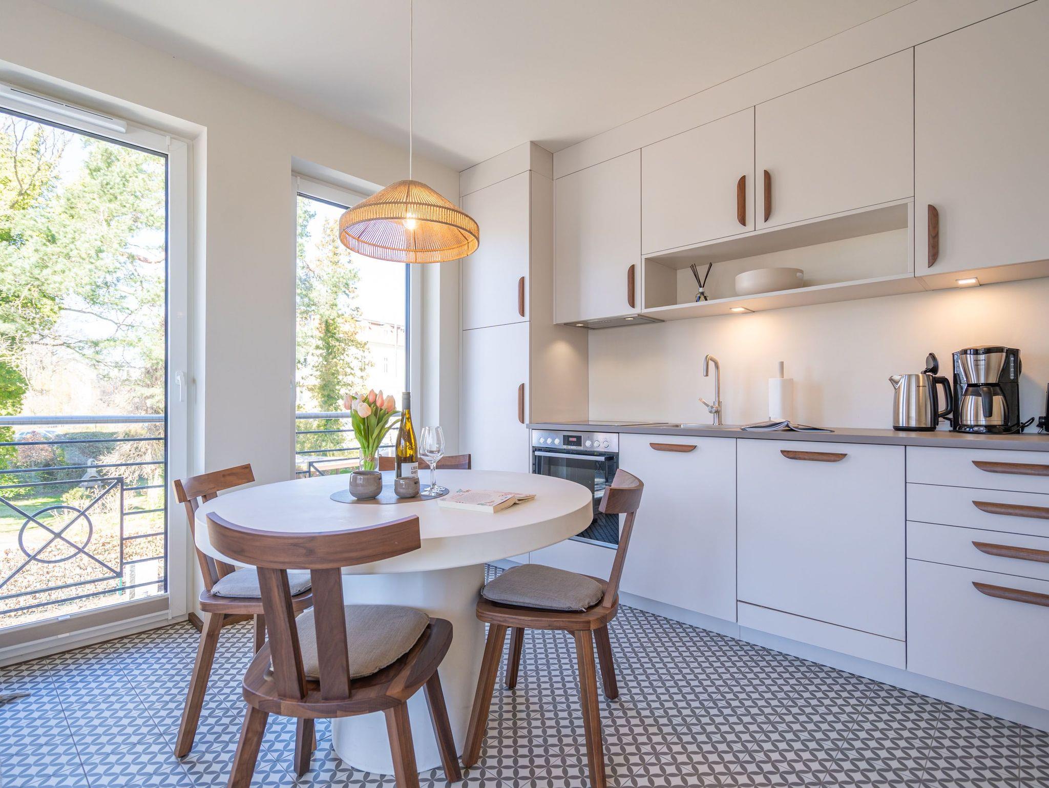 Willkommen im Quartier Maxim ? Ihre Ferienwohnung Nr. 4 für entspannte Tage an der Küste! Das moderne 3-Raum-Appartement im ersten Obergeschoss bietet mit 68 m² genug Platz für bis zu vier Personen und ist ideal für Familien oder kleine Gruppen, die Komfort und stilvolles Ambiente schätzen. Der offene Wohnbereich ist geschmackvoll eingerichtet und lädt mit einem gemütlichen Sofa, einem 55-Zoll-Flachbild-TV und einem Kaminofen zu entspannten Abenden ein. Die gut ausgestattete Küche bietet alles, was das Herz begehrt ? darunter einen Backofen, ein Induktionskochfeld, eine Spülmaschine sowie einen Kühlschrank mit Gefrierfach. Vom Wohnbereich aus gelangen Sie direkt auf den 8 m² großen Süd-Ost-Balkon, der für sonnige Frühstücke oder entspannte Stunden im Freien wie geschaffen ist. Das Appartement verfügt über zwei großzügige Schlafzimmer, die jeweils mit einem komfortablen Boxspring-Doppelbett (1,80 m x 2,00 m), einem Kleiderschrank und einem weiteren Flachbild-TV ausgestattet sind ? ideal für erholsamen Schlaf. Für zusätzlichen Komfort sorgen zwei Badezimmer: Das erste, innenliegende Bad bietet eine Dusche, einen Waschtisch und eine finnische Sauna, die für wohltuende Entspannung sorgt. Das zweite, helle Tageslichtbad ist direkt vom zweiten Schlafzimmer aus zugänglich und ebenfalls mit Dusche, Waschtisch und WC ausgestattet. Zusätzliche Annehmlichkeiten wie ein Waschtrockner im Flureinbauschrank und kostenfreies WLAN runden das Angebot ab. Ein abschließbarer Kellerraum bietet Platz für Fahrräder. Ein PKW-Stellplatz in der Tiefgarage gehört ebenfalls zur Wohnung. Genießen Sie erholsame Tage im stilvollen Quartier Maxim und lassen Sie den Alltag hinter sich ? hier wurde an alles gedacht!
