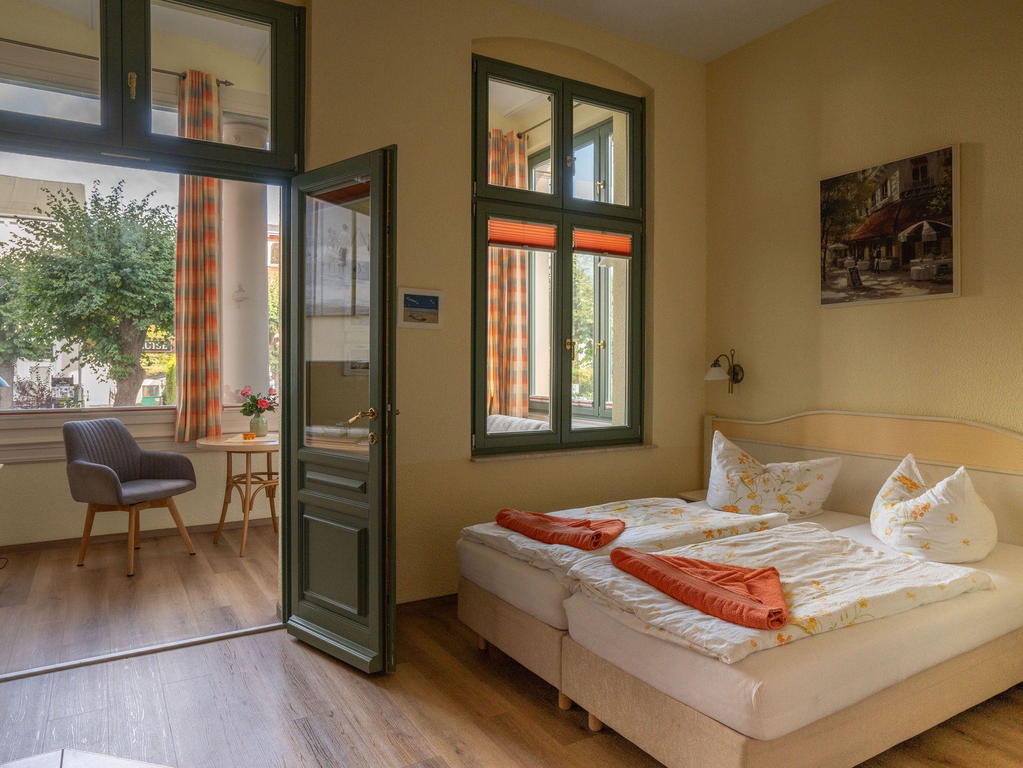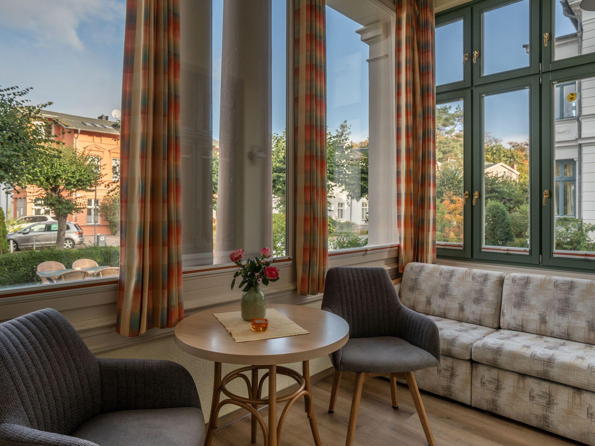 Auf der Terrasse vor dem Haus (Gemeinschaftsnutzung) haben Sie einen herrlichen Blick auf die alten Villen im Stil der Bäderarchitektur.
