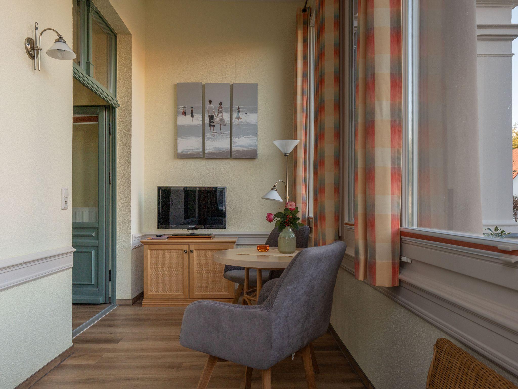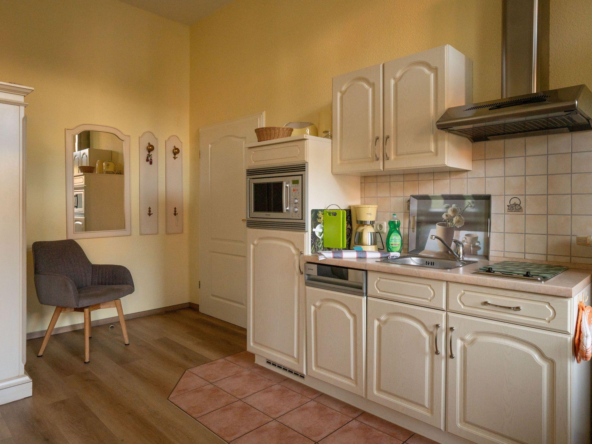 Das 30 qm große Zweiraumappartement im Hochparterre verfügt über eine Veranda mit Sitzgelegenheit und Schlafcouch (Aufbettung für 1 Person), TV und Radio einen Wohn-Schlafraum mit Doppelbett und Küchenzeile mit Geschirrspüler,