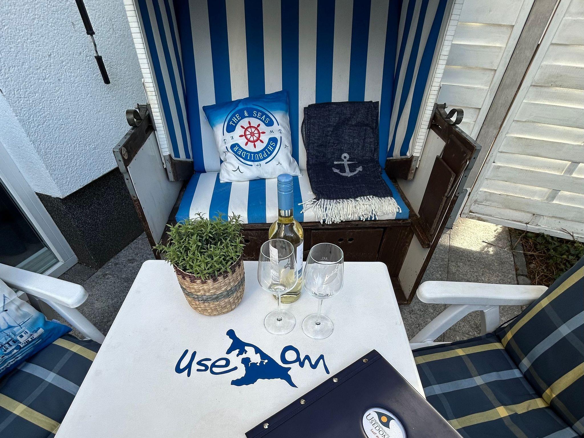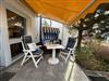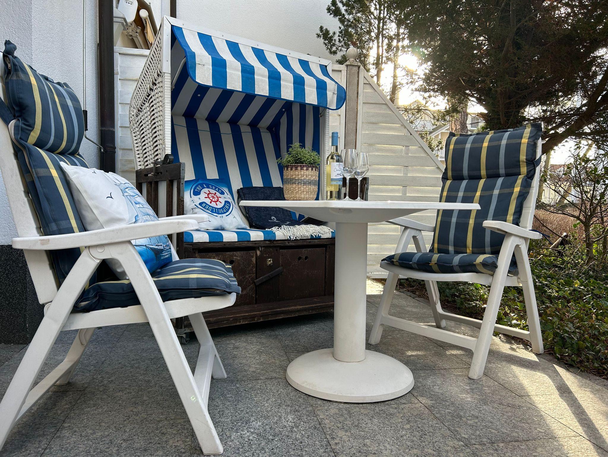 Vor der Wohnung befindet sich zur Sonnenseite, die Terrasse mit bequemen Gartenmöbel und gemütlichen Auflagen; die Markise spendet den gewünschten Schatten. Ein Strandkorb steht Ihnen auf der Terrasse ebenfalls zur Verfügung.