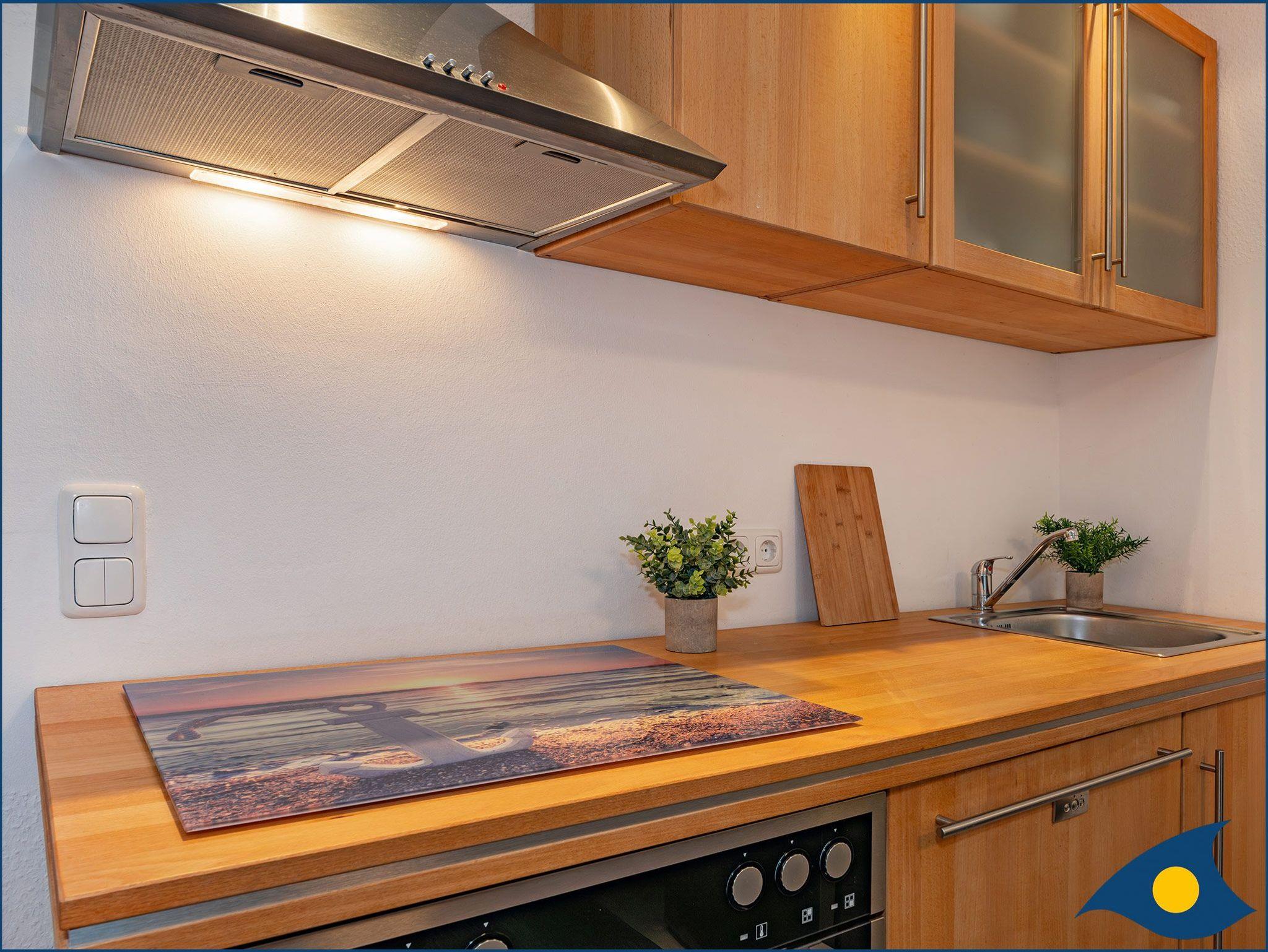 Es erwartet Sie ein gemütlicher Wohnbereich mit einer Küchenzeile und Essbereich. In der Wohnküche befinden sich ein freistehender Kühlschrank mit Gefrierfach, 1 großes Ceran-Kochfeld mit Backofen und eine Spülmaschine.