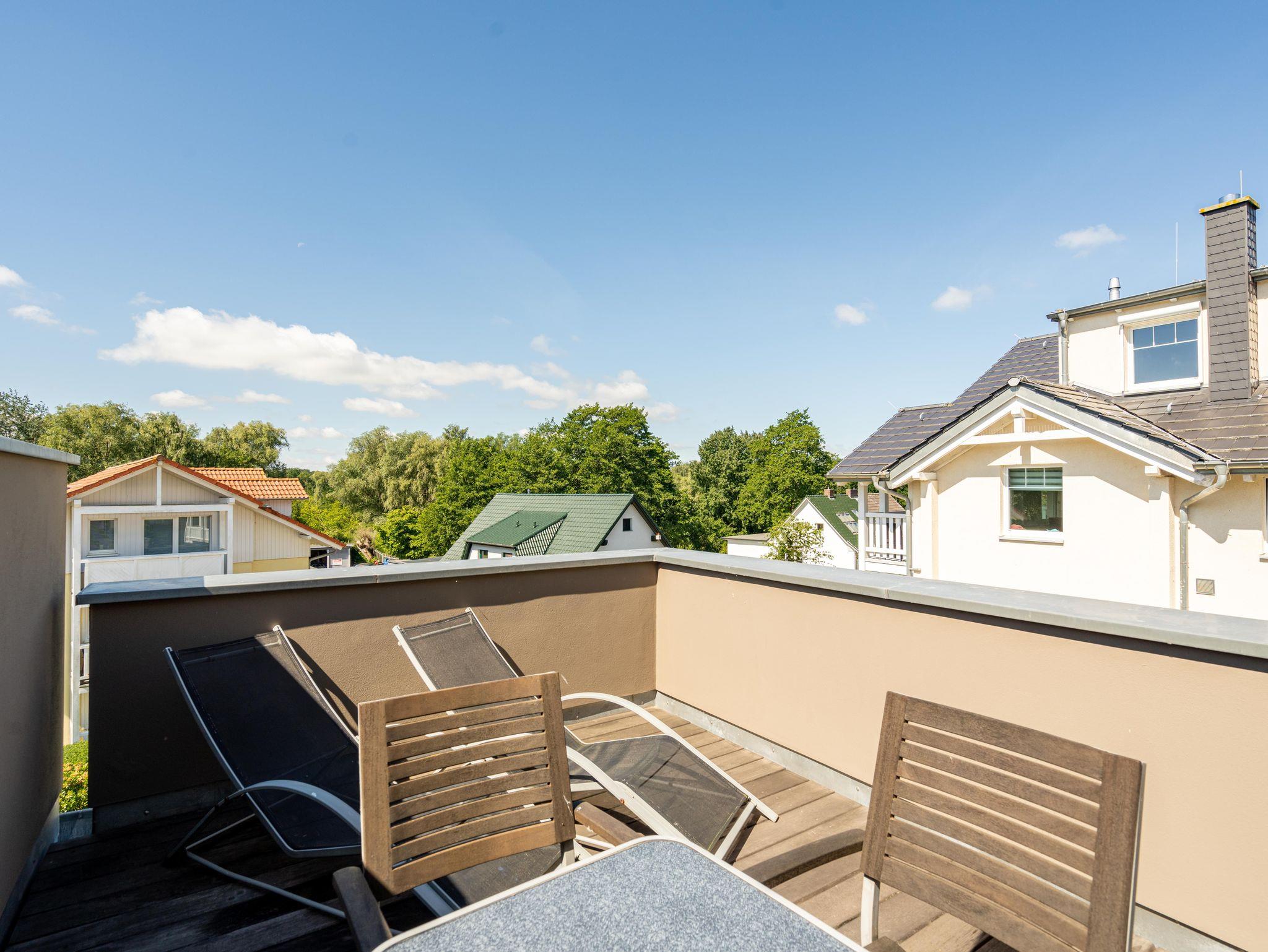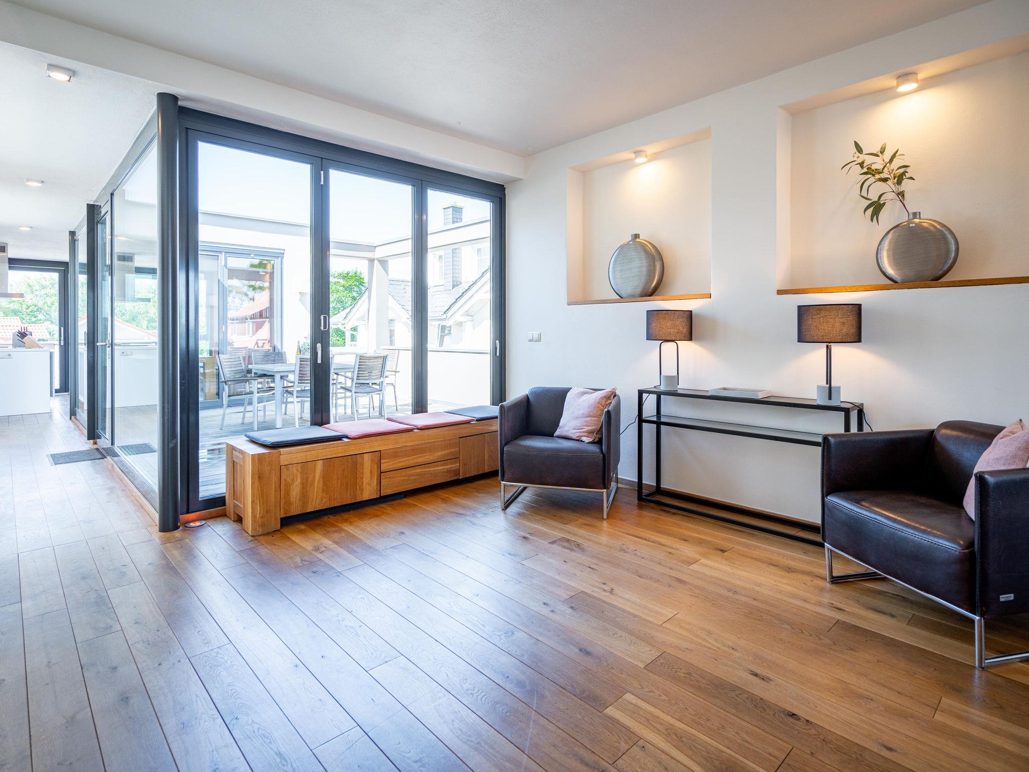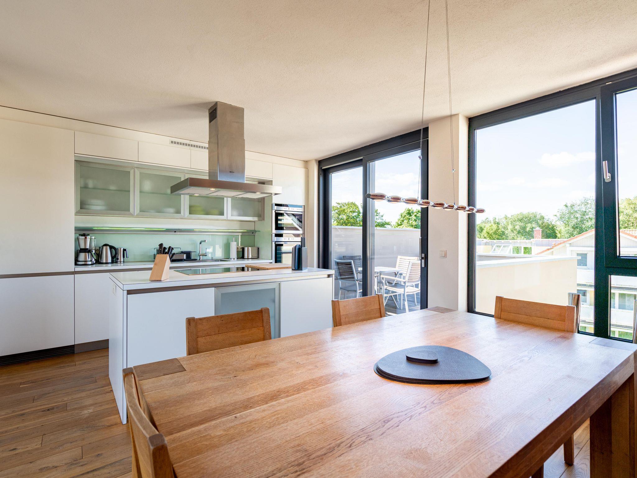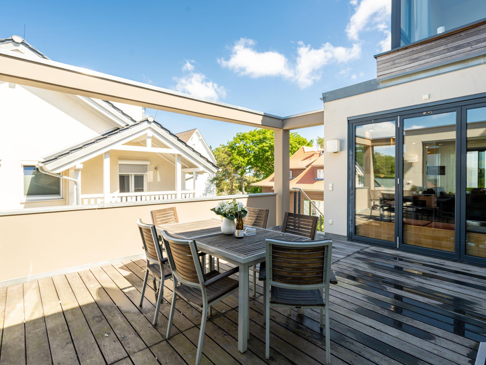 Residieren wie einst berühmte Persönlichkeiten des 20. Jahrhunderts mit dem gehobenen Standard von heute, so empfängt Sie das Penthouse im Quartier 47. Die moderne und stilvolle Stadtvilla befindet sich in der ersten Reihe zur Strandpromenade und ist umgeben von kaiserlichen Villen im Bäderarchitekturstil. Abseits der mondänen Ortsmitte und doch zentral gelegen, können Sie zwischen Strandtag (30m entfernt) und Stadtbummel (Ortskern 1,5km entfernt) wählen. Ob zu Fuß oder über den Radweg - von der Strandpromenade aus gelangen Sie begleitet vom Rauschen der Ostsee sowohl nach Heringsdorf als auch in den Nachbarort Bansin. Genießen Sie die frische Brise oder genehmigen Sie sich am Fischerstrand von Heringsdorf ein Fischbrötchen, bevor es zurück in das 98qm große Feriendomizil geht. Über insgesamt 2 Etagen erstreckt sich das Penthouse und bietet ausreichend Platz für bis zu 4 Erwachsene und ein Kleinkind (bis 2 Jahre im Kinderreisebett). Beginnen Sie Ihren Urlaub bereits beim Betreten des im Sommer 2022 renovierten [&] neu möblierten 4-Zimmer-Appartements. Große Fensterfronten und drei Dachterrassen, davon eine mit direktem Blick auf die Ostsee, machen diese Strandvilla zu einem besonderen Urlaubsdomizil. Hochwertiges und stilvoll abgestimmtes Interieur wie Ledersofas und -sessel gepaart mit Echtholzmöbeln und Vollholz-Eichendielen sorgen für ein exklusives Ambiente, klimaregulierender Lehmputz auch an heißen Sommertagen für angenehme Temperaturen. Lassen Sie Ihren Abend vor dem 55-Zoll Flat-TV ausklingen oder machen Sie es sich vor dem Kaminofen gemütlich. Auf der 24qm großen Dachterrasse in Westausrichtung finden bis zu 6 Personen Platz für ein Glas Wein oder ein ausgedehntes Urlaubsfrühstück, da die Terrasse sowohl vom Wohnzimmer als auch von der angrenzenden Küche begehbar ist. In der neu ausgestatteten Küche sorgen neben der Kochinsel ein Backofen und ein Dampfgarer in Augenhöhe für entspanntes Zubereiten Ihrer Speisen. Spülmaschine, Kühlschrank, separater Gefrierschrank, Waschtrockner sowie Kleinküchengeräte (Toaster, Kaffeemaschine, Wasserkocher und Mixer) und eine Nespresso/Delonghi-Maschine runden den hochwertigen Küchenbereich ab. Genehmigen Sie sich nach dem Kochen ein ausgiebiges Sonnenbad auf der zweiten Dachterrasse mit 12qm in Südausrichtung, die direkt von der Küche zugänglich ist. Für die kühleren Tage bietet sich ein Saunagang in der Finnischen Sauna für bis zu 2 Personen an, die auf der selben Etage ins Badezimmer integriert wurde und an die Dachterrasse mit Strandzugang angrenzt. Eine begehbare Dusche sowie ein Waschtisch und WC runden das Badezimmer auf dieser Etage ab. Die Schlafräume befinden sich im Obergeschoss und sind mit bequemen Boxspringbetten (1,80m x 2,00m) sowie modernen Einbauschränken ausgestattet. Mückengitter an den Fenstern erlauben jederzeit sorgloses Lüften. Kann ein Urlaubstag schöner beginnen, als mit dem Blick auf die Ostsee, den sie aus einem der beiden Schlafzimmer von der 14qm großen Süd-Terrasse und seitlichem Blick auf das Meer haben? Auch ein Start mit einem ausgiebigen Bad ist im Badezimmer mit Badewanne möglich. Ein Stellplatz in der Tiefgarage, von der aus der Penthouse-Fahrstuhl direkt in die Wohnung fährt, komplettiert dieses Appartement. Eine Erstausstattung Bettwäsche und Handtücher liegen für Sie bei Anreise bereit.