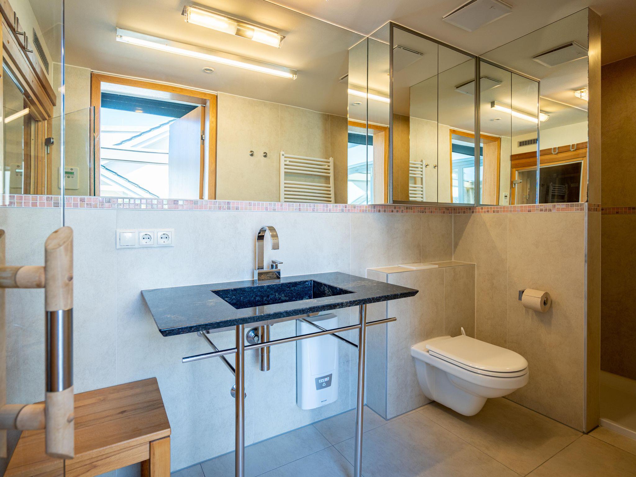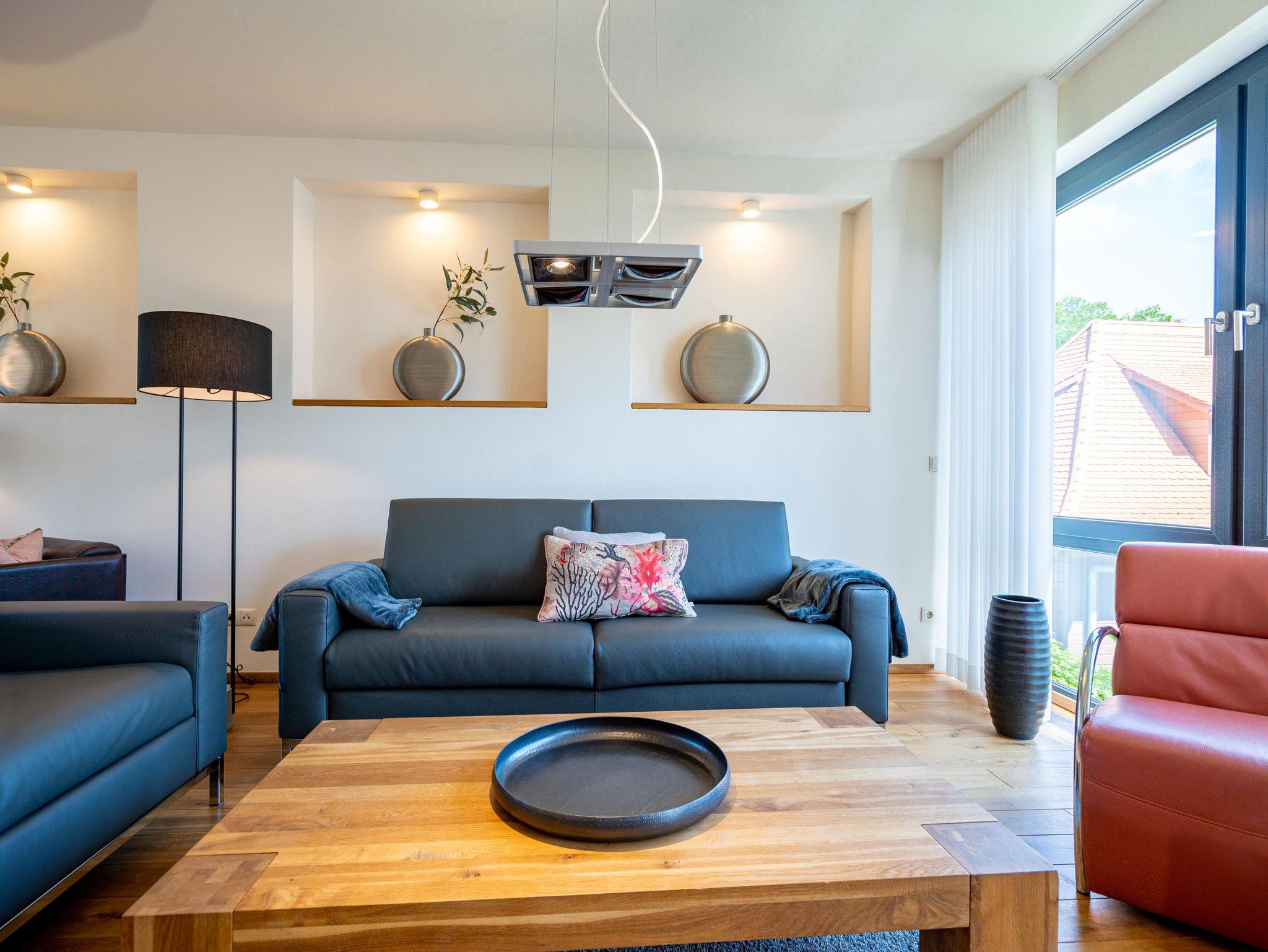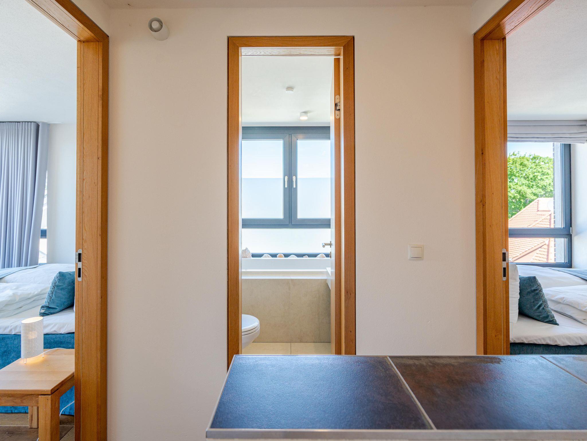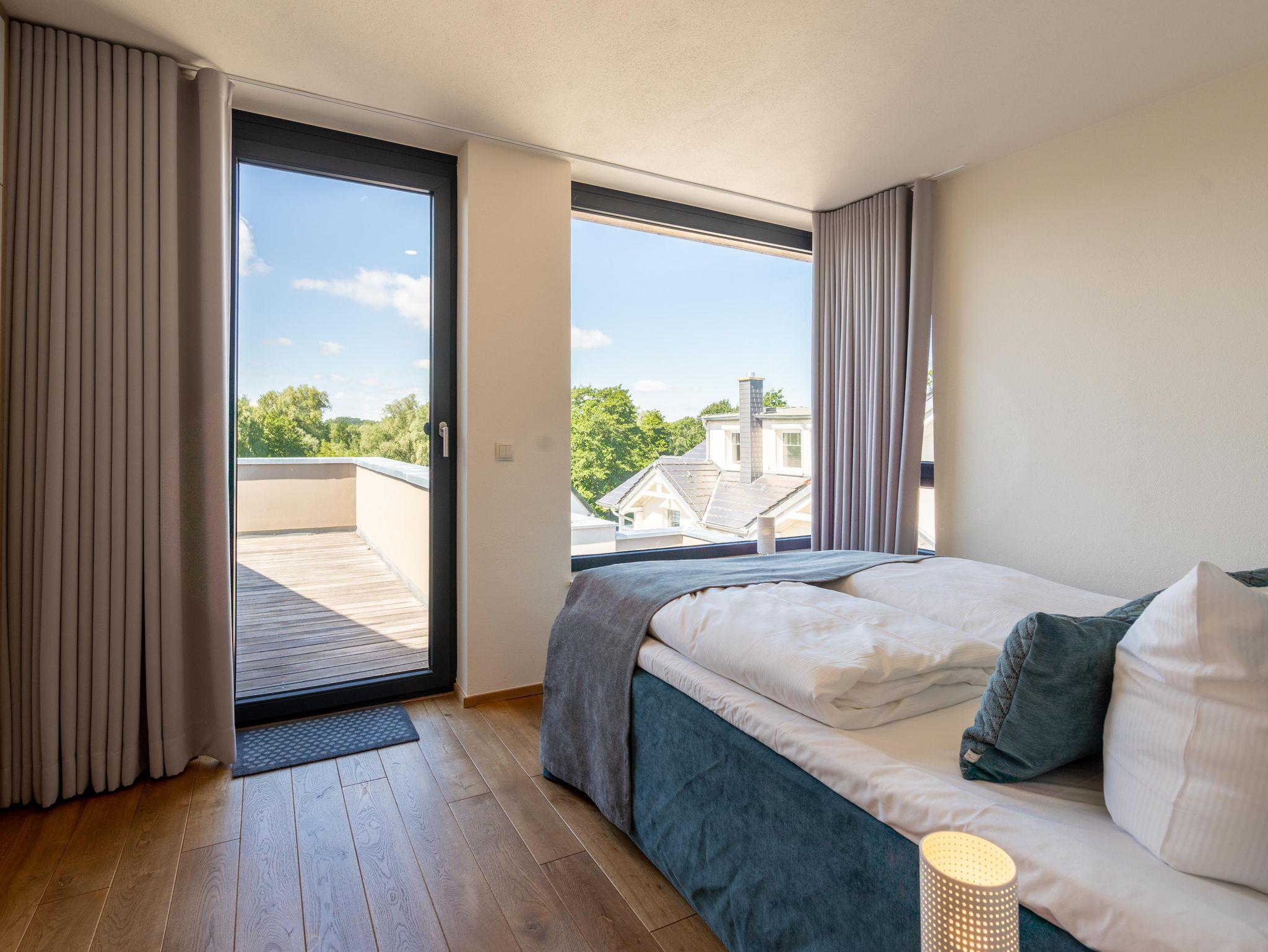 Residieren wie einst berühmte Persönlichkeiten des 20. Jahrhunderts mit dem gehobenen Standard von heute, so empfängt Sie das Penthouse im Quartier 47. Die moderne und stilvolle Stadtvilla befindet sich in der ersten Reihe zur Strandpromenade und ist umgeben von kaiserlichen Villen im Bäderarchitekturstil. Abseits der mondänen Ortsmitte und doch zentral gelegen, können Sie zwischen Strandtag (30m entfernt) und Stadtbummel (Ortskern 1,5km entfernt) wählen. Ob zu Fuß oder über den Radweg - von der Strandpromenade aus gelangen Sie begleitet vom Rauschen der Ostsee sowohl nach Heringsdorf als auch in den Nachbarort Bansin. Genießen Sie die frische Brise oder genehmigen Sie sich am Fischerstrand von Heringsdorf ein Fischbrötchen, bevor es zurück in das 98qm große Feriendomizil geht. Über insgesamt 2 Etagen erstreckt sich das Penthouse und bietet ausreichend Platz für bis zu 4 Erwachsene und ein Kleinkind (bis 2 Jahre im Kinderreisebett). Beginnen Sie Ihren Urlaub bereits beim Betreten des im Sommer 2022 renovierten [&] neu möblierten 4-Zimmer-Appartements. Große Fensterfronten und drei Dachterrassen, davon eine mit direktem Blick auf die Ostsee, machen diese Strandvilla zu einem besonderen Urlaubsdomizil. Hochwertiges und stilvoll abgestimmtes Interieur wie Ledersofas und -sessel gepaart mit Echtholzmöbeln und Vollholz-Eichendielen sorgen für ein exklusives Ambiente, klimaregulierender Lehmputz auch an heißen Sommertagen für angenehme Temperaturen. Lassen Sie Ihren Abend vor dem 55-Zoll Flat-TV ausklingen oder machen Sie es sich vor dem Kaminofen gemütlich. Auf der 24qm großen Dachterrasse in Westausrichtung finden bis zu 6 Personen Platz für ein Glas Wein oder ein ausgedehntes Urlaubsfrühstück, da die Terrasse sowohl vom Wohnzimmer als auch von der angrenzenden Küche begehbar ist. In der neu ausgestatteten Küche sorgen neben der Kochinsel ein Backofen und ein Dampfgarer in Augenhöhe für entspanntes Zubereiten Ihrer Speisen. Spülmaschine, Kühlschrank, separater Gefrierschrank, Waschtrockner sowie Kleinküchengeräte (Toaster, Kaffeemaschine, Wasserkocher und Mixer) und eine Nespresso/Delonghi-Maschine runden den hochwertigen Küchenbereich ab. Genehmigen Sie sich nach dem Kochen ein ausgiebiges Sonnenbad auf der zweiten Dachterrasse mit 12qm in Südausrichtung, die direkt von der Küche zugänglich ist. Für die kühleren Tage bietet sich ein Saunagang in der Finnischen Sauna für bis zu 2 Personen an, die auf der selben Etage ins Badezimmer integriert wurde und an die Dachterrasse mit Strandzugang angrenzt. Eine begehbare Dusche sowie ein Waschtisch und WC runden das Badezimmer auf dieser Etage ab. Die Schlafräume befinden sich im Obergeschoss und sind mit bequemen Boxspringbetten (1,80m x 2,00m) sowie modernen Einbauschränken ausgestattet. Mückengitter an den Fenstern erlauben jederzeit sorgloses Lüften. Kann ein Urlaubstag schöner beginnen, als mit dem Blick auf die Ostsee, den sie aus einem der beiden Schlafzimmer von der 14qm großen Süd-Terrasse und seitlichem Blick auf das Meer haben? Auch ein Start mit einem ausgiebigen Bad ist im Badezimmer mit Badewanne möglich. Ein Stellplatz in der Tiefgarage, von der aus der Penthouse-Fahrstuhl direkt in die Wohnung fährt, komplettiert dieses Appartement. Eine Erstausstattung Bettwäsche und Handtücher liegen für Sie bei Anreise bereit.