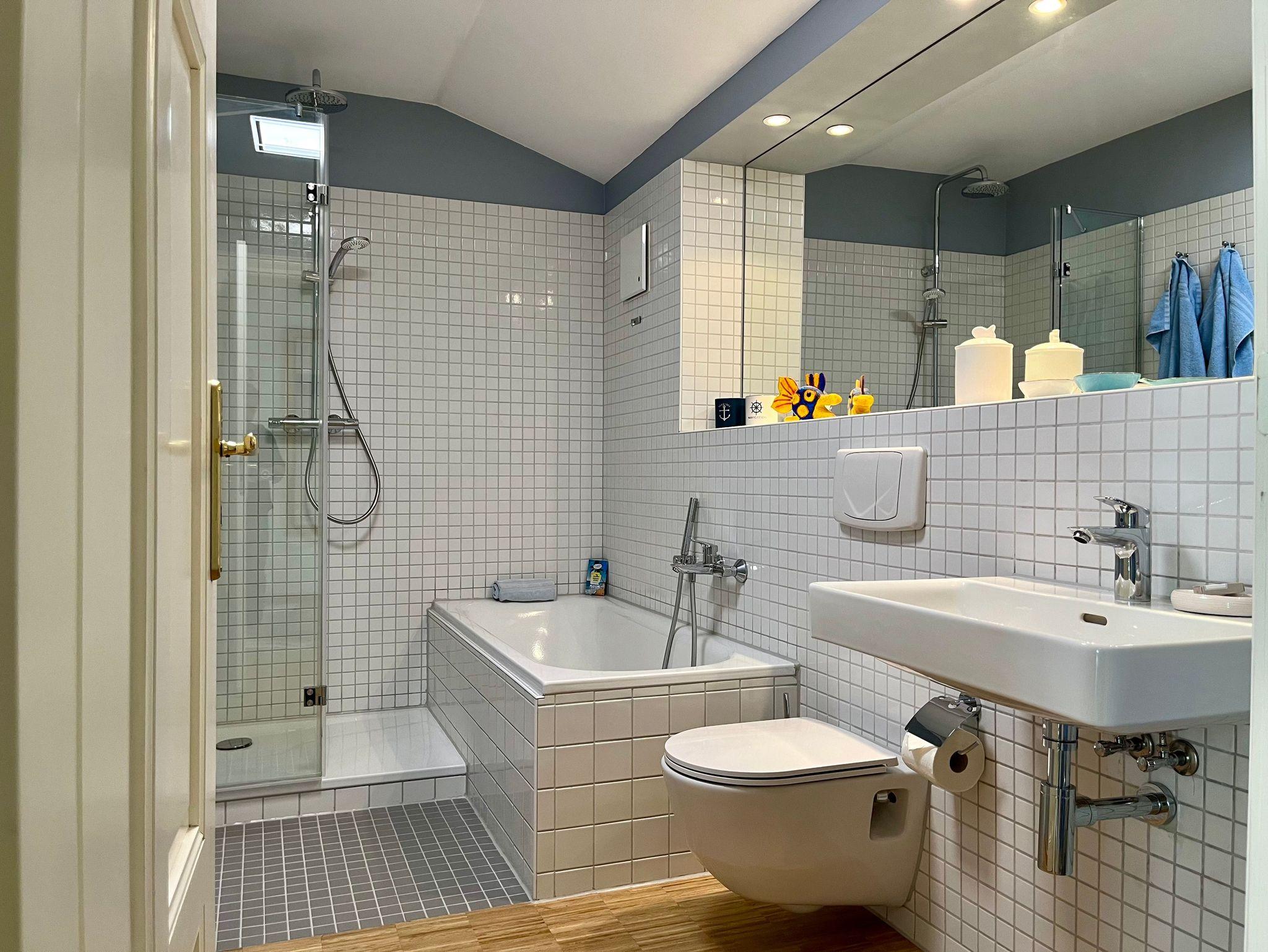 Das Badezimmer ist mit Badewanne und Dusche ausgestattet.