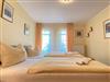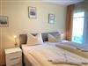 Im Schlafzimmer befindet sich ein Boxspringbett und ein Kleiderschrank.