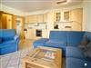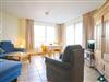 Der großzügige Wohnbereich besticht durch seine geschmackvolle Einrichtung und eine offene, voll ausgestattete Küche, perfekt für kulinarische Erlebnisse. Von hier aus haben Sie direkten Zugang zum großen überdachten Balkon, in Süd-West Ausrichtung. Eine gemütliche große Eckcouch mit Schlaffunktion für die 3. Person, ein komfortable Sessel und ein Flachbild-TV laden zu entspannten Abenden ein. Die Essecke am Fenster bietet ausreichend Platz für gemeinsame Mahlzeiten.