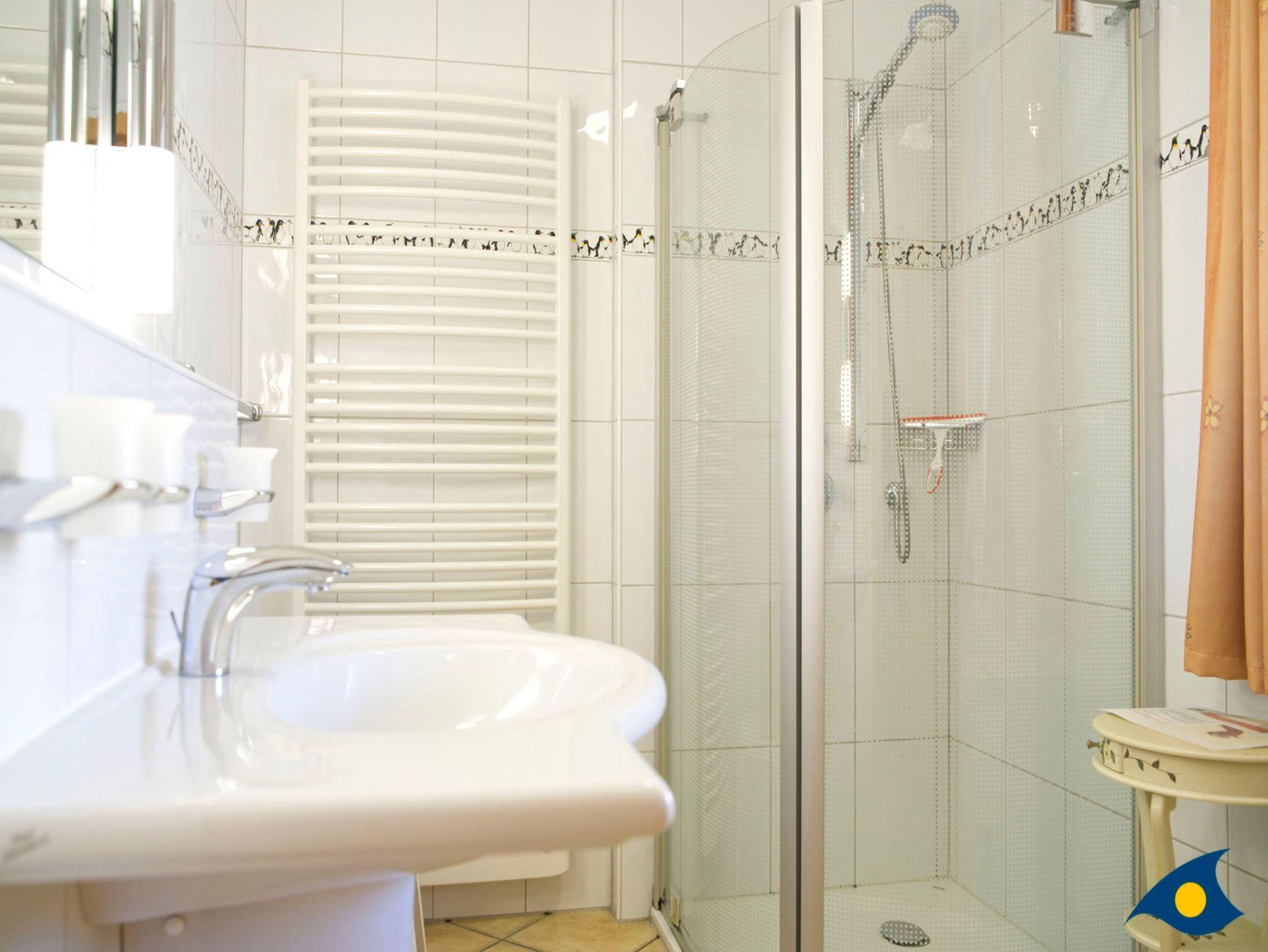 Das Tageslichtbad ist modern gestaltet und mit einer ebenerdigen Dusche ausgestattet, die höchsten Komfort bietet.