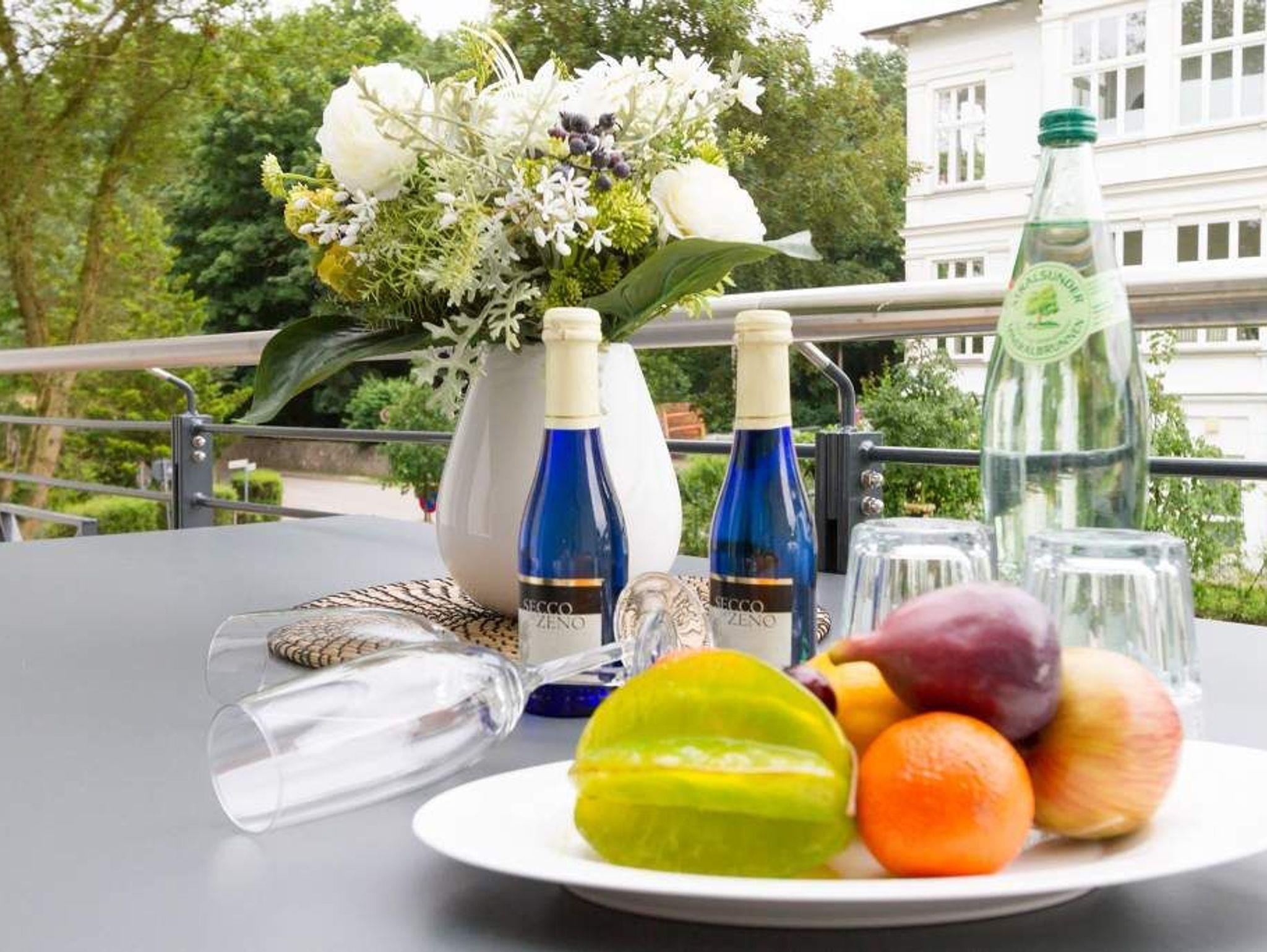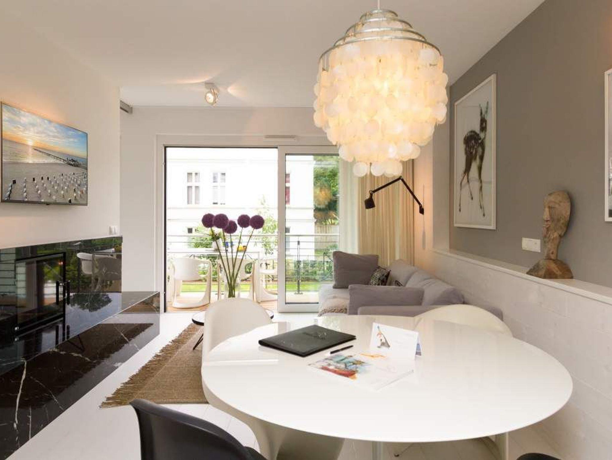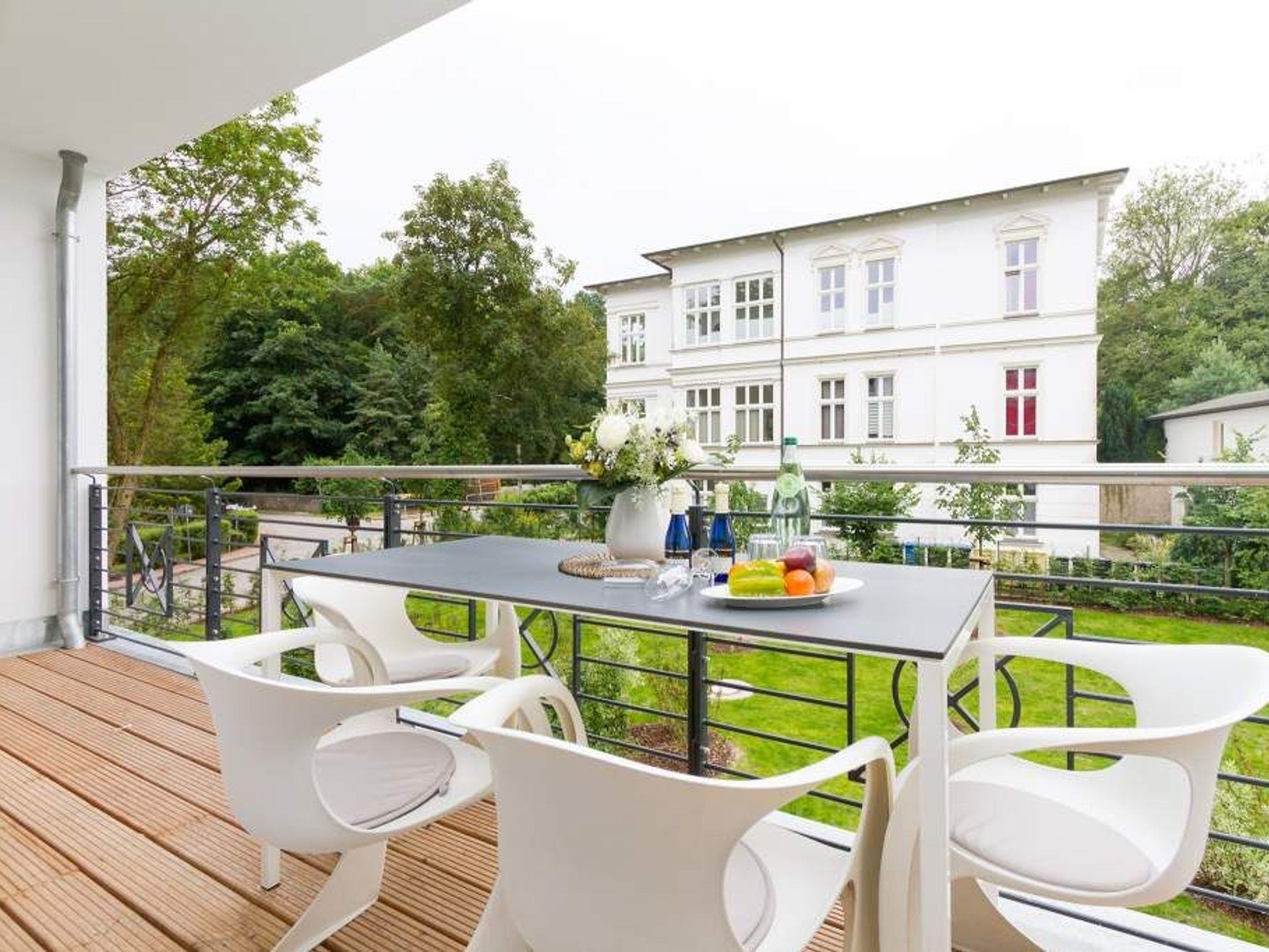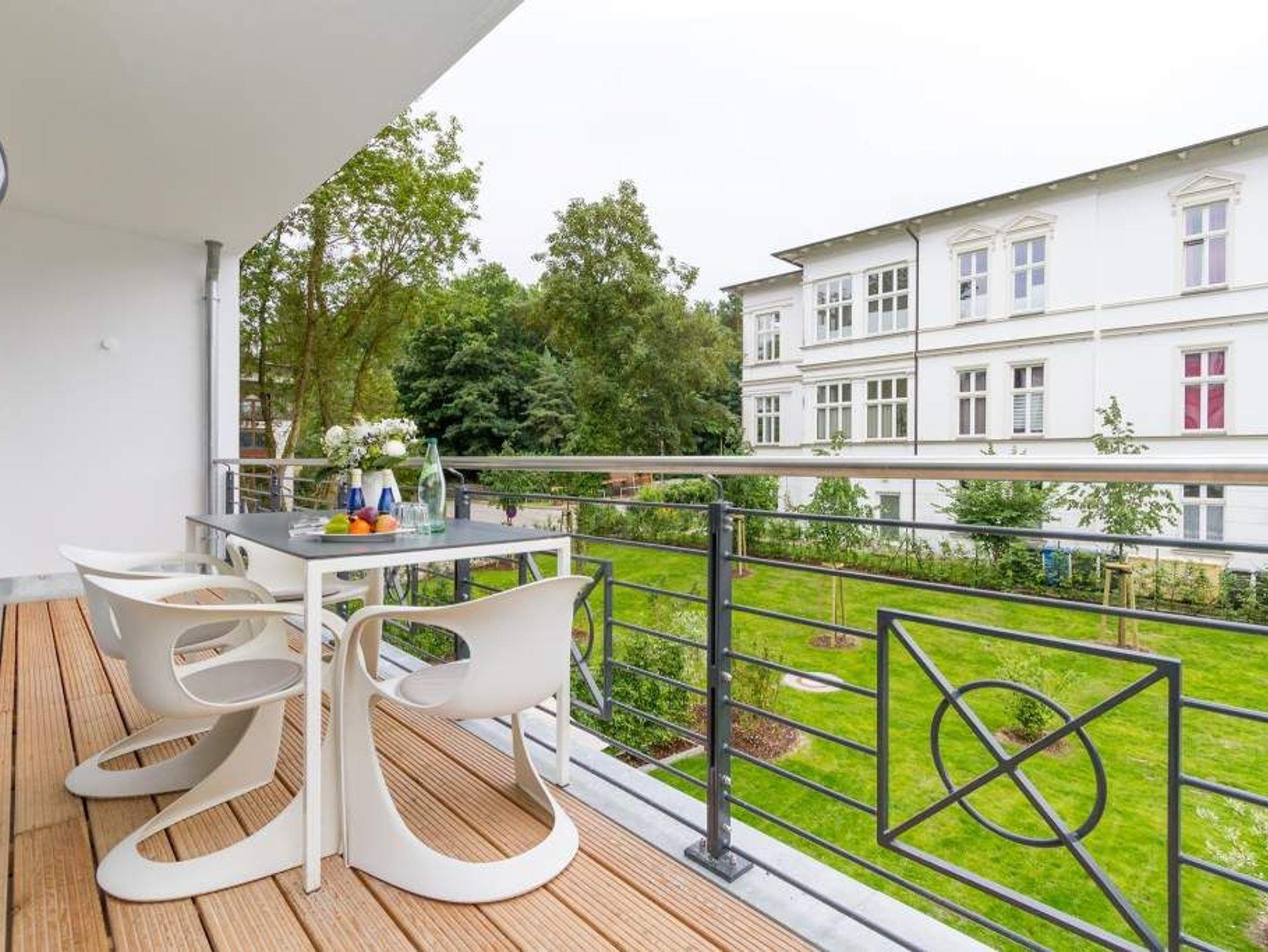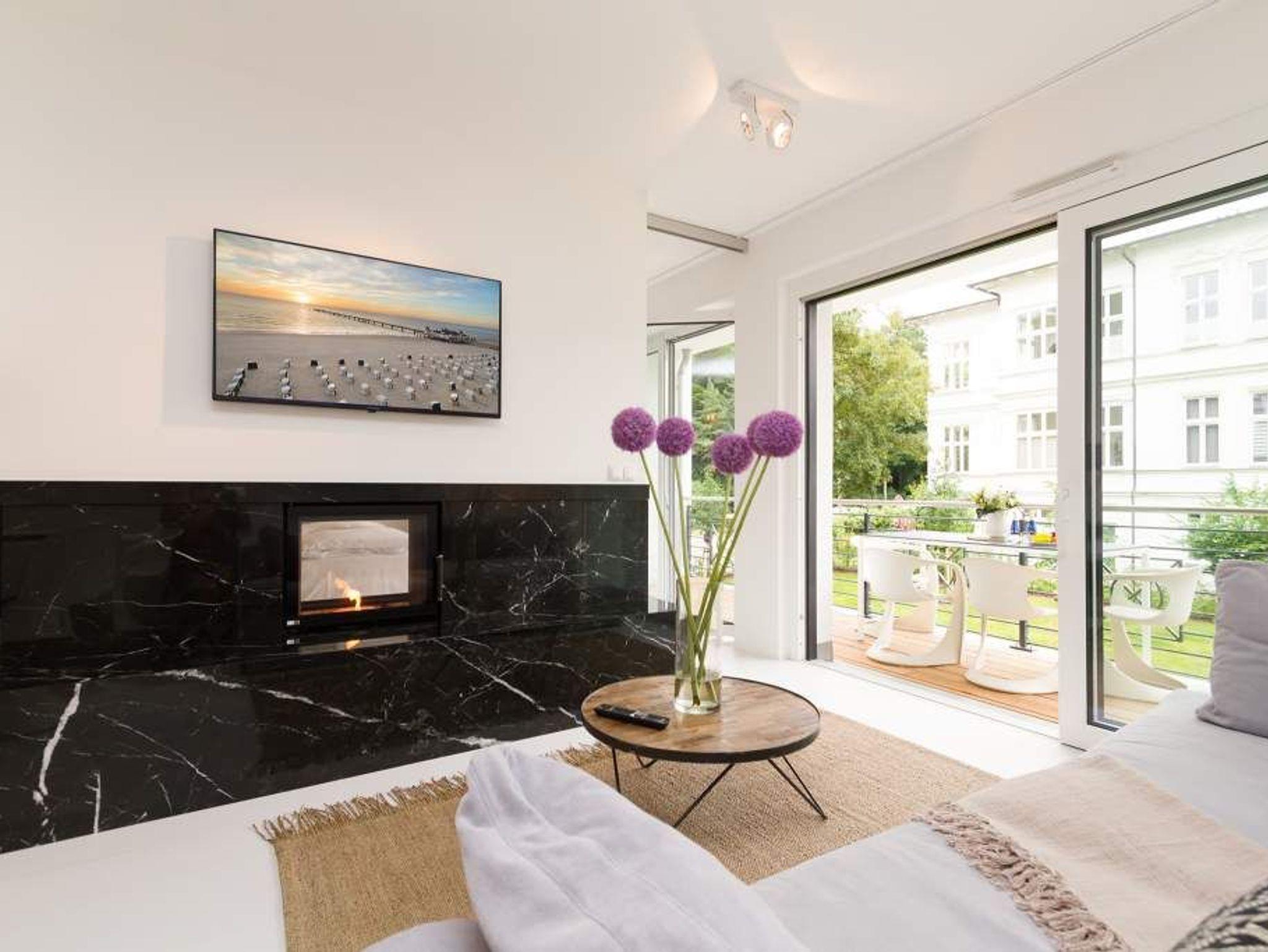 Vogelzwitschern und das sanfte Rauschen der Ostsee: Umgeben von wunderschönen, alten Bäumen atmet die 2017 fertig gestellte Villa Strandgrün das Flair der sie umgebenden Bädervillen. Mit seinen Balkonen und Erkern, die die Fassade untergliedern und auflockern, passt sich das strandnahe (100 Meter) Urlaubsdomizil angenehm in das Bild der aufwendig sanierten Villen um sie herum ein und wirkt selbst wie eine Weiterführung der einst mondänen Architektur des 19. Jahrhunderts. Das stilvolle Äußere setzt sich im exklusiven und eleganten Wohndesign im Inneren fort. Jede Ferienwohnung verfügt über eine Sonnenterrasse oder mehrere Balkone. Besondere Highlights eines jeden Appartements sind der Kamin, eine Sauna und je zwei Bäder bzw. ein zusätzliches Gäste WC. Die großzügigen 3- und 4-Raum-Suiten wurden mit allem Komfort konzipiert und ausgestattet. Vom ASA-Geschirr bis zu den hochwertigen Designmöbeln steht das Wohlfühlen an erster Stelle. In der Tiefgarage gibt es für jedes Appartement einen Stellplatz. Außerdem steht für jede Wohnung ein Briefkasten am Haus zur Verfügung.