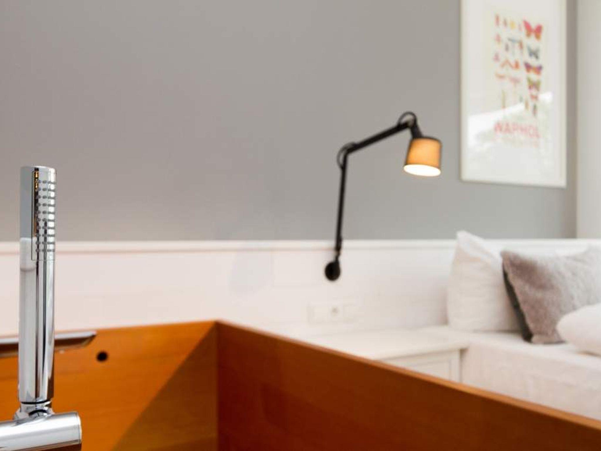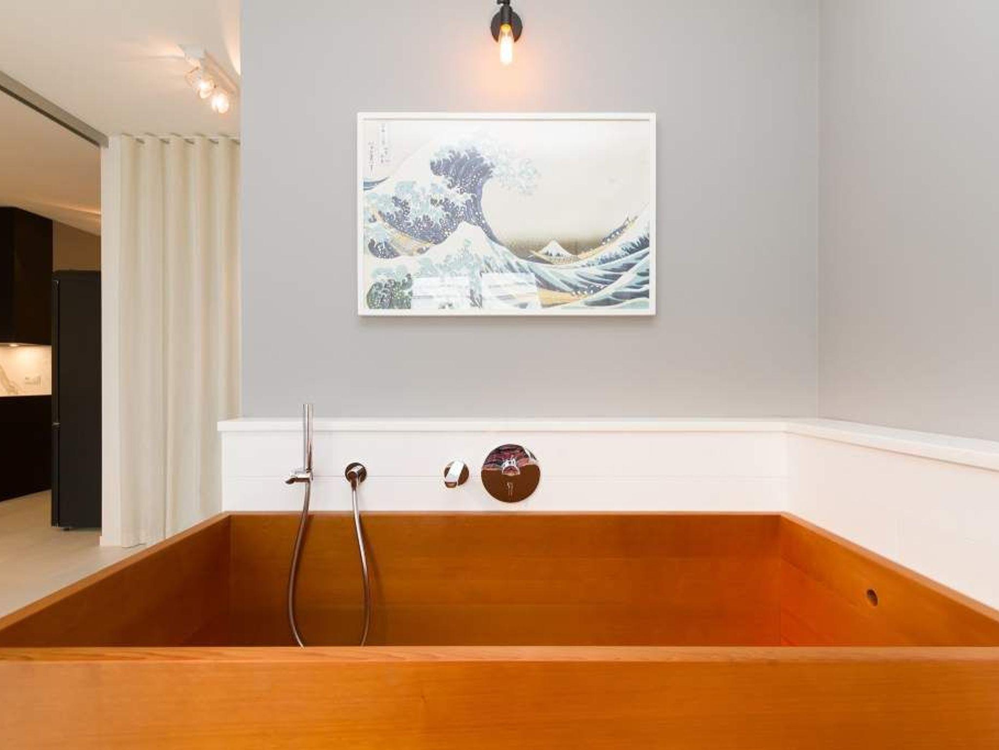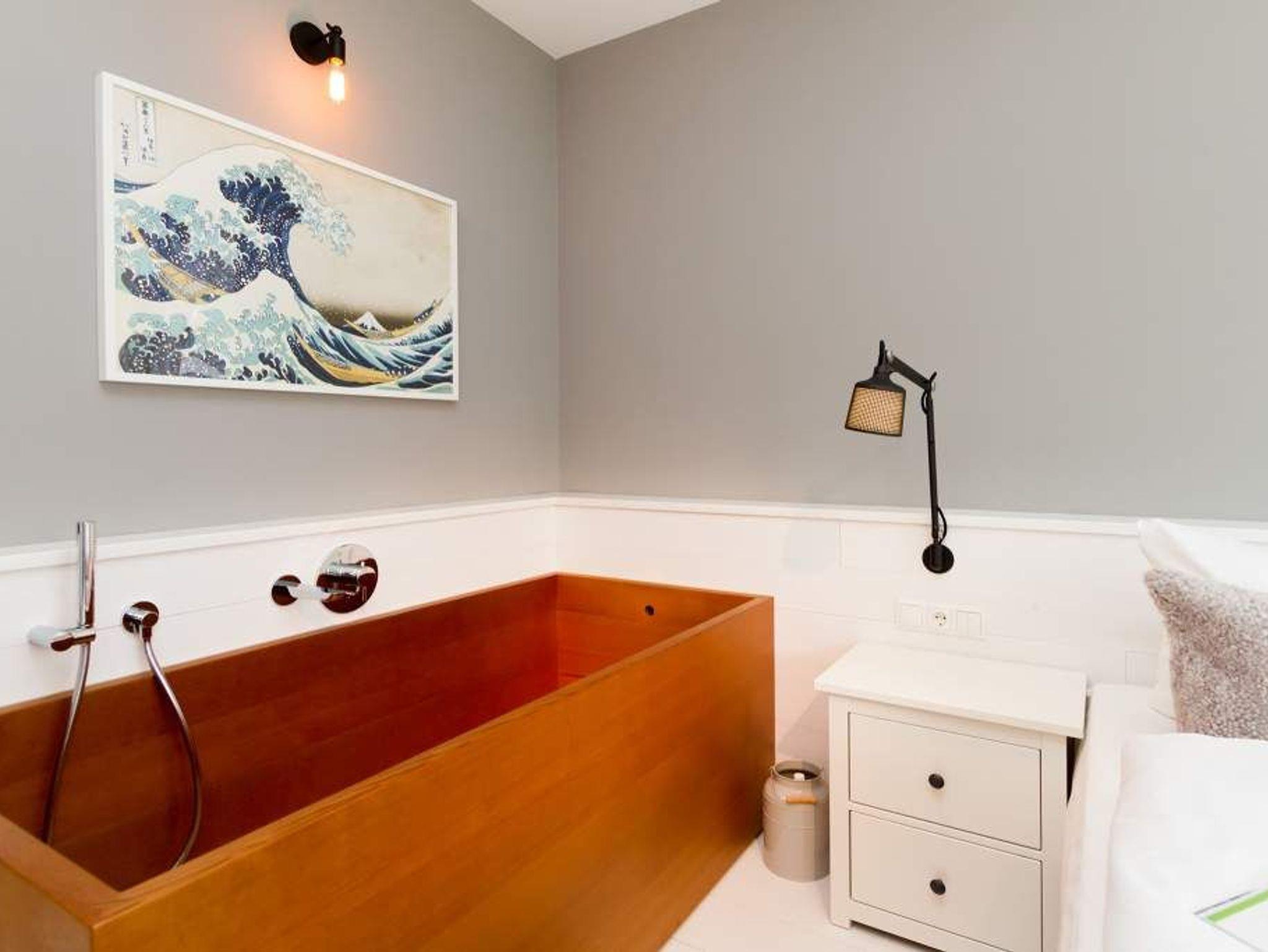 Der Urlaub ist die schönste Zeit des Jahres. Und die verbringt man natürlich gern in einer ganz besonders schönen Umgebung. Ein echter Wohlfühlort für eine solche Auszeit ist die Design-Wohnung Nummer 05 im ersten Obergeschoss der Villa Strandgrün in Heringsdorf. Drei bis vier Personen bieten die 68 Quadratmeter Platz zum Abschalten und Energietanken. Ein stilvolles Designkonzept durchzieht hier jeden Raum. Stimmig und harmonisch bis ins Detail der Lampen und Wohn-Accessoires. Das wunderschöne Wohn-Esszimmer mit der offenen, mit hochwertigen Geräten ausgestatteten und in modernem Anthrazit gehaltenen Küche ist eine absolute Wohlfühlzone. Ein Hingucker ist der große, freistehende Vintage-Kühlschrank. Exklusive und komfortable Designmöbel wie der Esstisch mit seinen vier Stühlen oder das große Sofa, das auch als Schlafmöglichkeit für eine Person fungieren kann, verleihen dem Zimmer ein elegantes Flair. Zur besonderen Atmosphäre trägt auch das Marmorboard mit dem Kamin bei. Der so genannte Tunnelkamin kann auch vom Schlafzimmer aus betrachtet werden. Außergewöhnlich und extravagant ist die freistehende Badewanne aus Zedernholz im Schlafzimmer. So können Sie vom entspannten Im-Wasser-Liegen nahtlos zur Entspannung ins große Doppelbett (1,80 m x 2,00 m) überwechseln. Eine kuschelige Schlafkoje (1,47 m x 1,97 m) grenzt unmittelbar an das Schlafzimmer, kann aber durch einen Vorhang und Schiebetüren verschlossen werden. Wohn- und Schlafzimmer sind mit Flat-TVs ausgestattet. Sowohl vom Schlafzimmer als auch vom Wohnzimmer gelangt man auf den geräumigen Süd-West-Balkon mit Schalenstühlen und einem Esstisch. Beim Blick in den begrünten Garten und auf die benachbarten wunderschön sanierten Bädervillen sind Alltagsstress und Hektik schnell vergessen. Die Wohnung verfügt über ein großes Bad mit Dusche, Waschtisch, WC und Panoramasauna. Handtücher, die Ausstattung mit Bettwäsche und kostenfreies WLAN sind in dieser Urlaubsauszeit inklusive. Die Wohnung hat einen Pkw-Stellplatz in der Tiefgarage.
