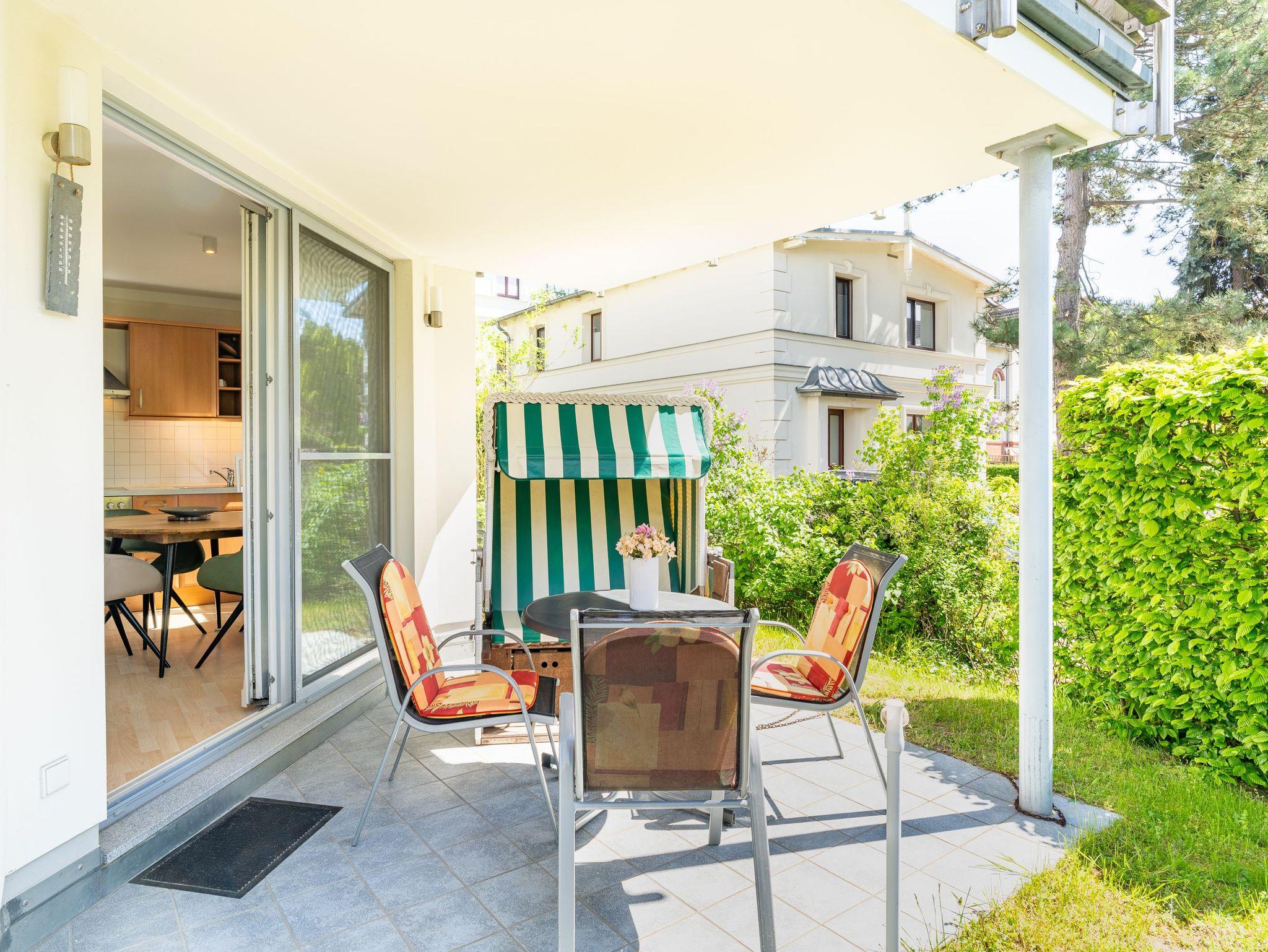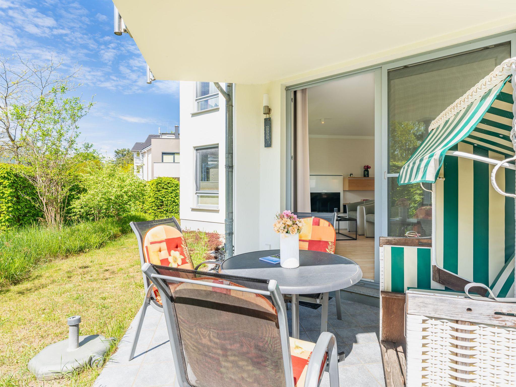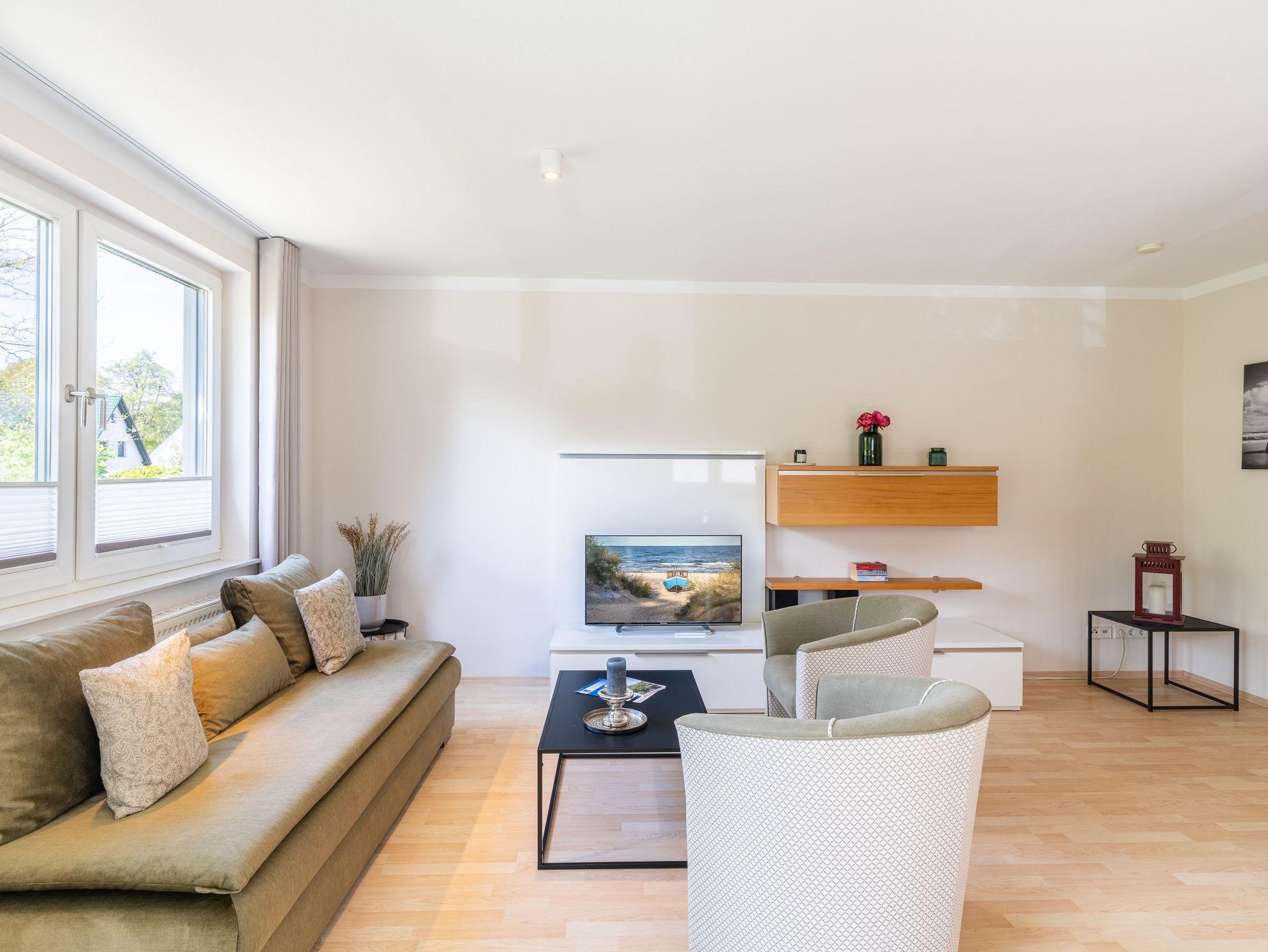 Modern und gemütlich zugleich: Auf Ihrer Terrasse im Grünen können Sie bereits beim morgendlichen Kaffee das Rauschen der Ostsee genießen. Der stilvoll gestaltete Wohnbereich ist mit einem bequemen Sofa und einem Flat-TV ausgestattet. Die integrierte Küchenzeile lässt keine Wünsche offen und bietet alles, was Sie für die Zubereitung Ihrer Lieblingsspeisen benötigen (inkl. Ceranfeld, Backofen, Mikrowelle, Kühlschrank mit Gefrierfach, Geschirrspüler, Wasserkocher, Toaster und Kaffeemaschine). Am Esstisch kann die ganze Familie in geselliger Runde speisen. Vom Wohnzimmer aus gelangen Sie auf Ihre private Terrasse, die zum Sonnenbaden oder abendlichen Spielen mit Blick ins Grüne einlädt. Das freundlich gestaltete Schlafzimmer verfügt über ein bequemes Doppelbett. Zwei weitere Gäste können es sich auf der ausziehbaren Schlafcouch im Wohnbereich für eine erholsame Nacht gemütlich machen.