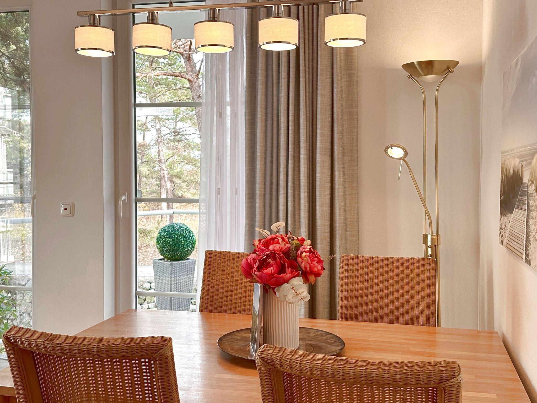 Der Wohn- und Essbereich versprüht mit seinen Holzmöbeln behagliche Gemütlichkeit. Das Ledersofa lädt nach einem erlebnisreichen Tag zum Entspannen ein. Vom Wohnbereich gelangen Sie auf den Balkon, dem idealen Ort zum Frühstücken in der Morgensonne mit Blick auf die Heringsdorfer Promenade. Sämtliche Köstlichkeiten können in der eleganten Küche zubereitet werden, die jeglichen Komfort (Backofen, Kühlschrank mit Gefrierfach, Geschirrspüler, Mikrowelle, Wasserkocher, Toaster, Kaffeemaschine) bietet und somit das Kochherz höher schlagen lässt.