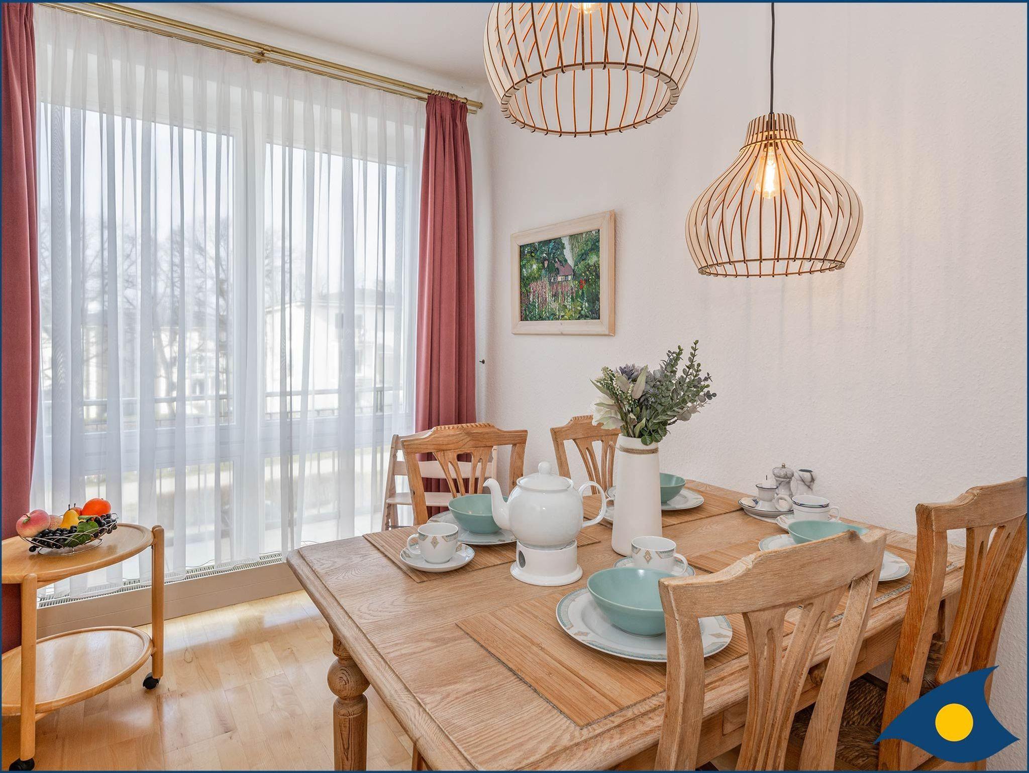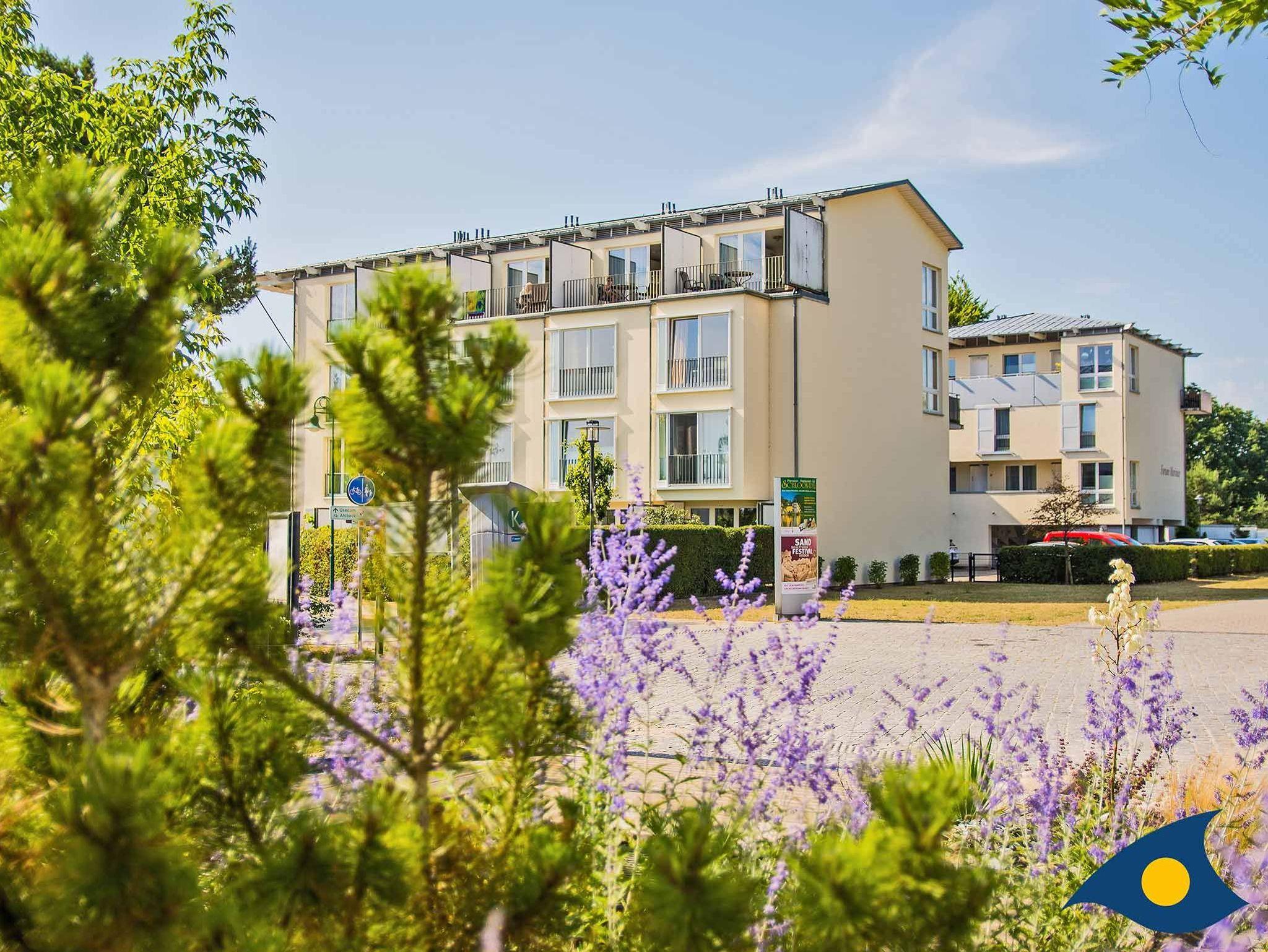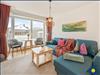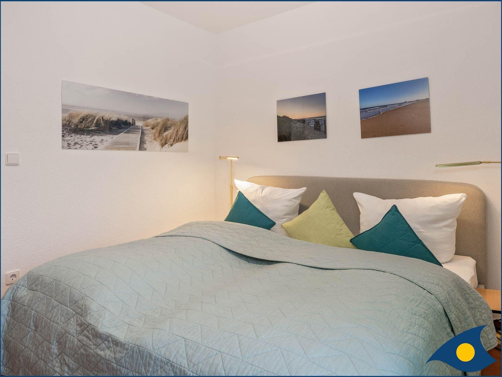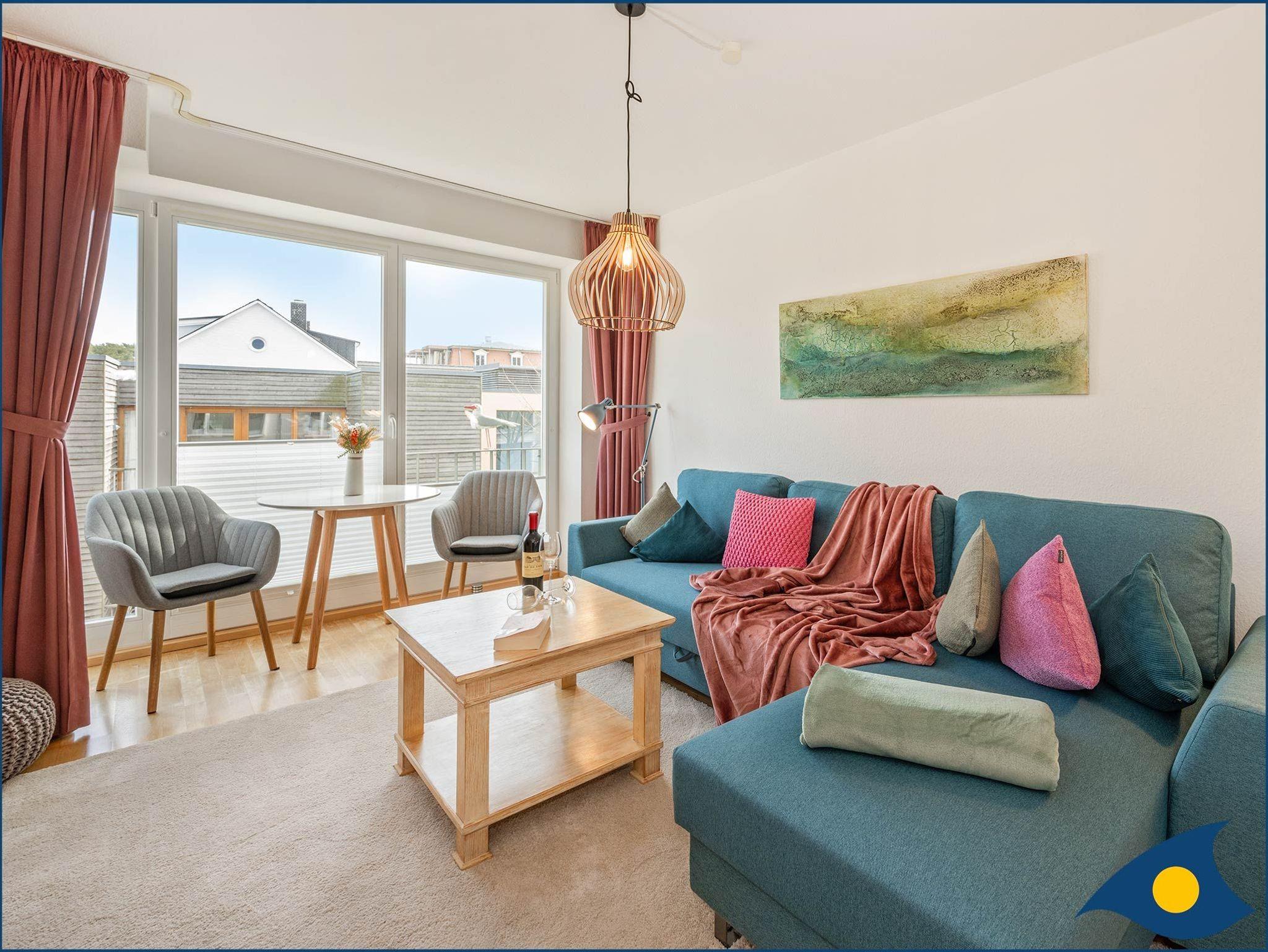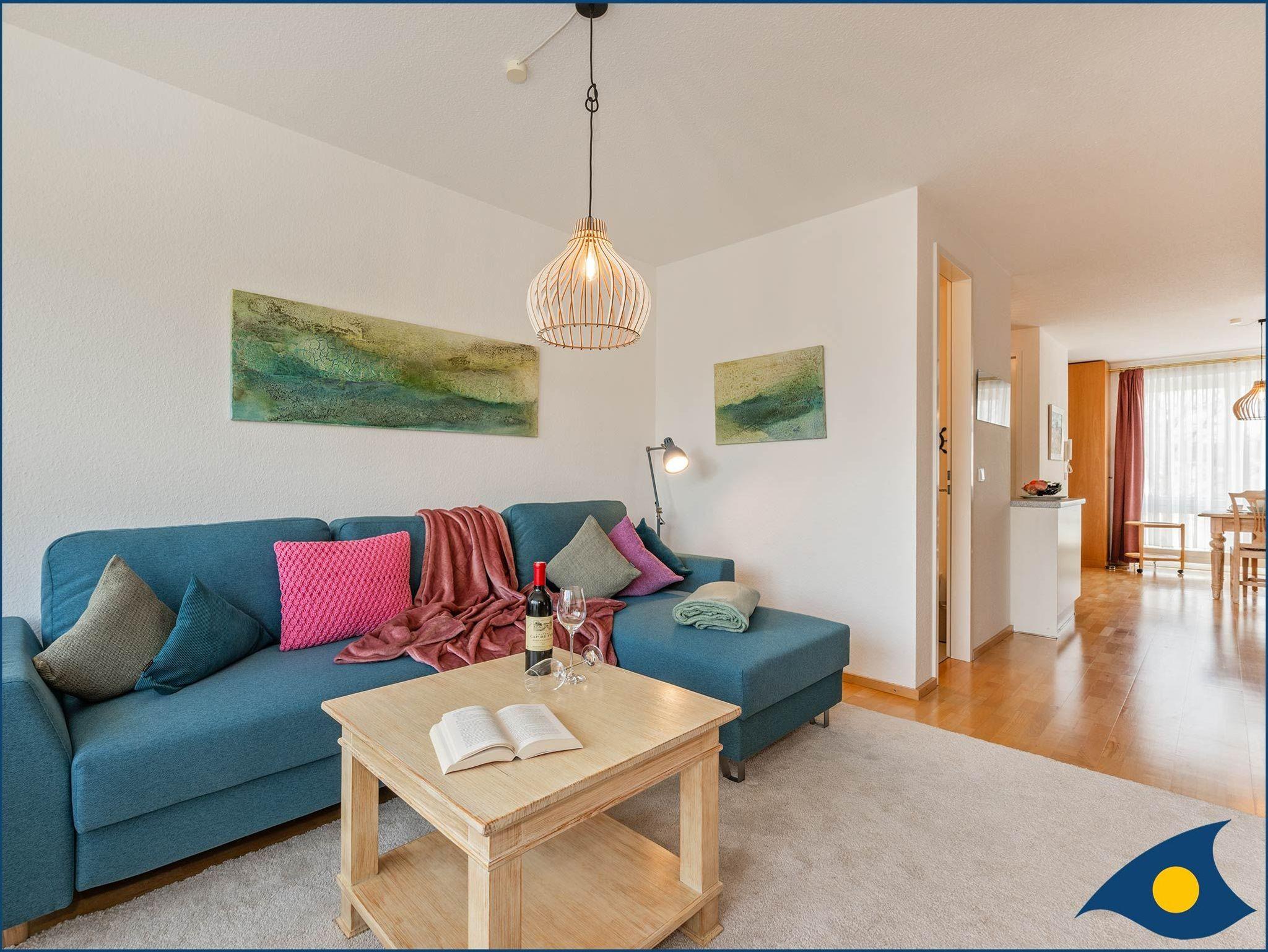 Des Weiteren finden Sie hier eine gemütliche Sitzecke, bestehend aus Sofa und Sessel direkt an dem französischen Balkon. Seitlich zur Ostsee gelegen, haben Sie von hier aus sogar Meerblick. Abgerundet wird die Ausstattung durch einen Smart-TV.