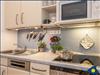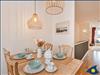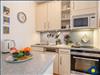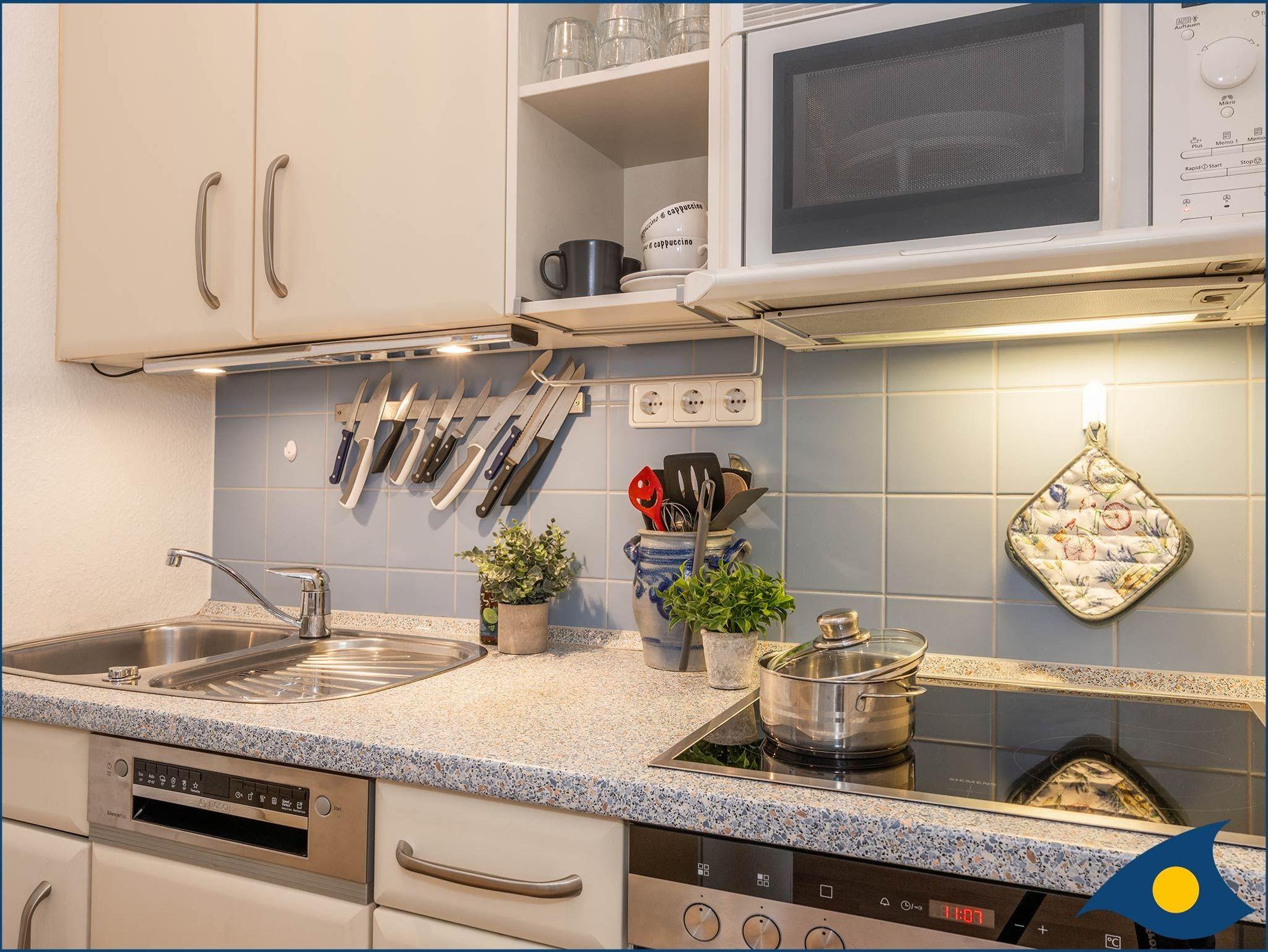 Der Eingangs- und Wohnbereich des Appartements befindet sich in der 2. Etage des Hauses. Hier gibt es neben dem Essbereich eine vollausgestattete offene Küche mit Geschirrspüler, Backofen, großem Ceran-Kochfeld, Mikrowelle und Kühlschrank mit Gefriermöglichkeit.