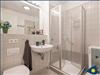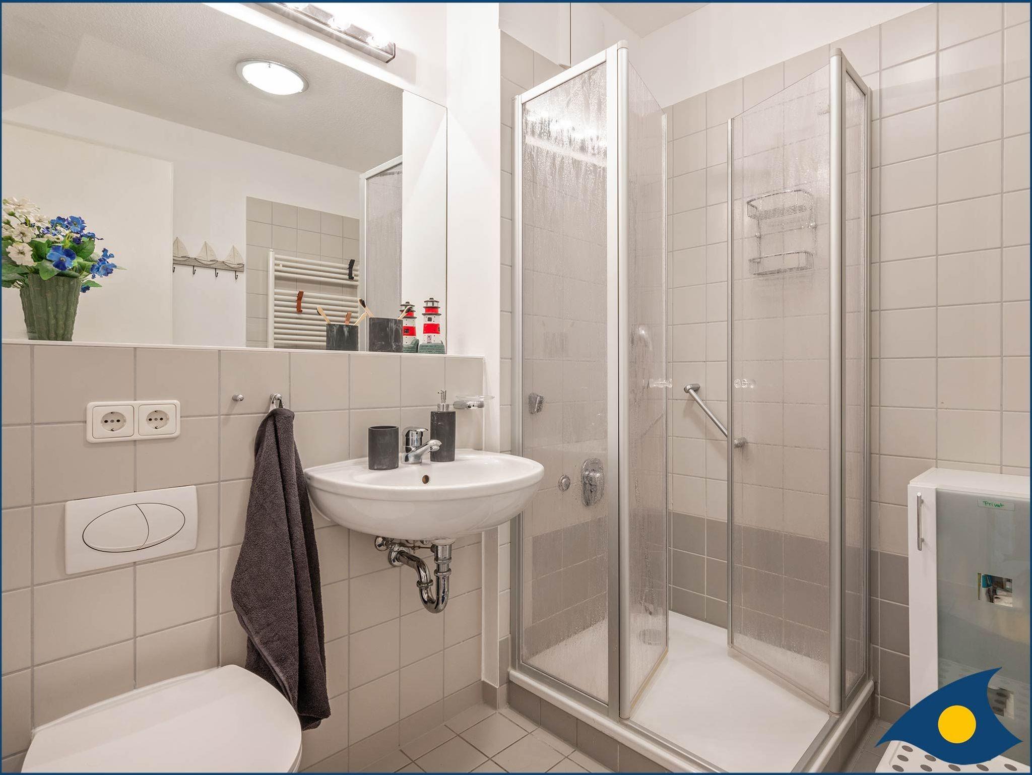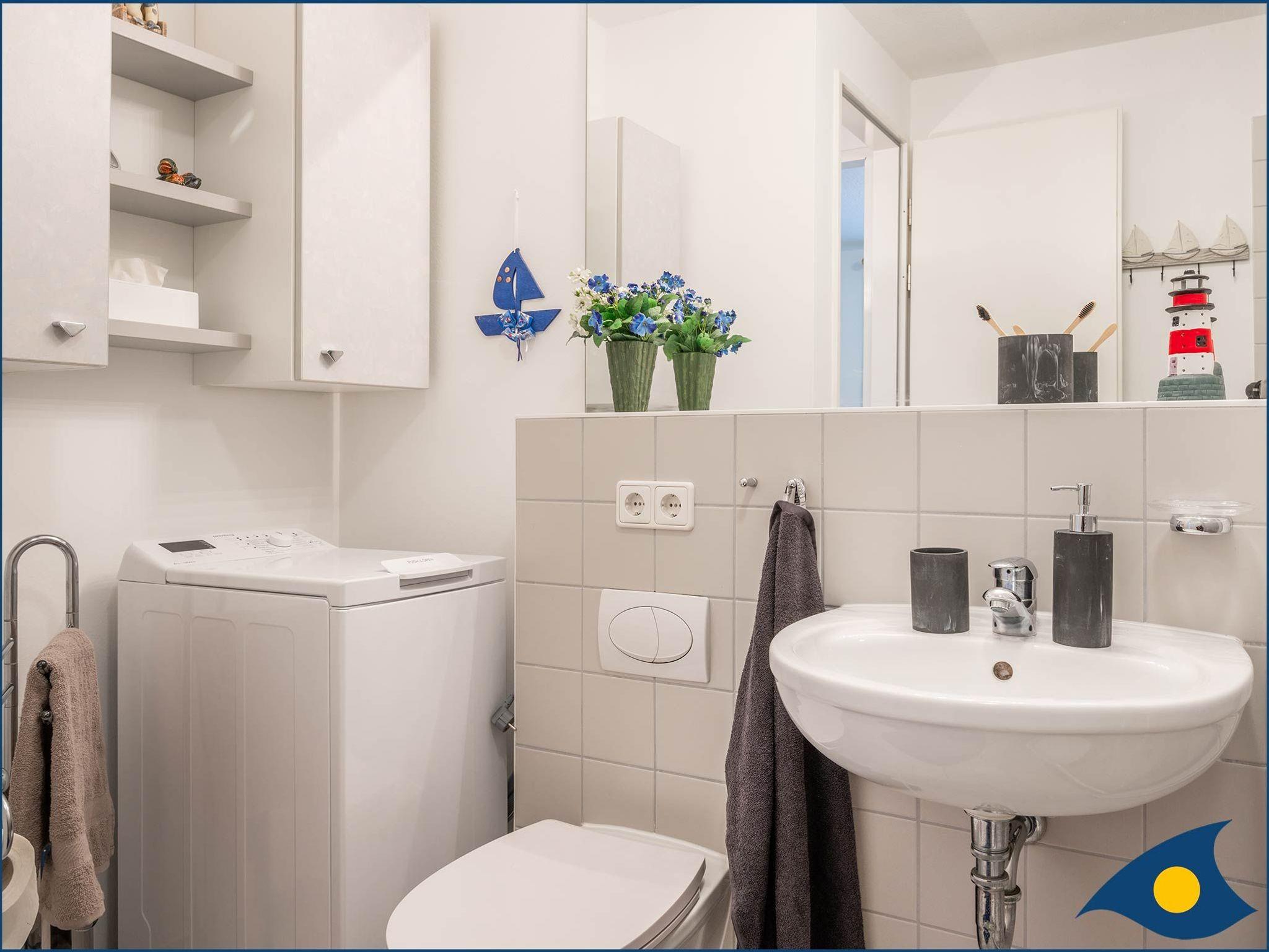 Das innenliegende Badezimmer verfügt über eine Dusche, sowie über eine Waschmaschine.