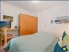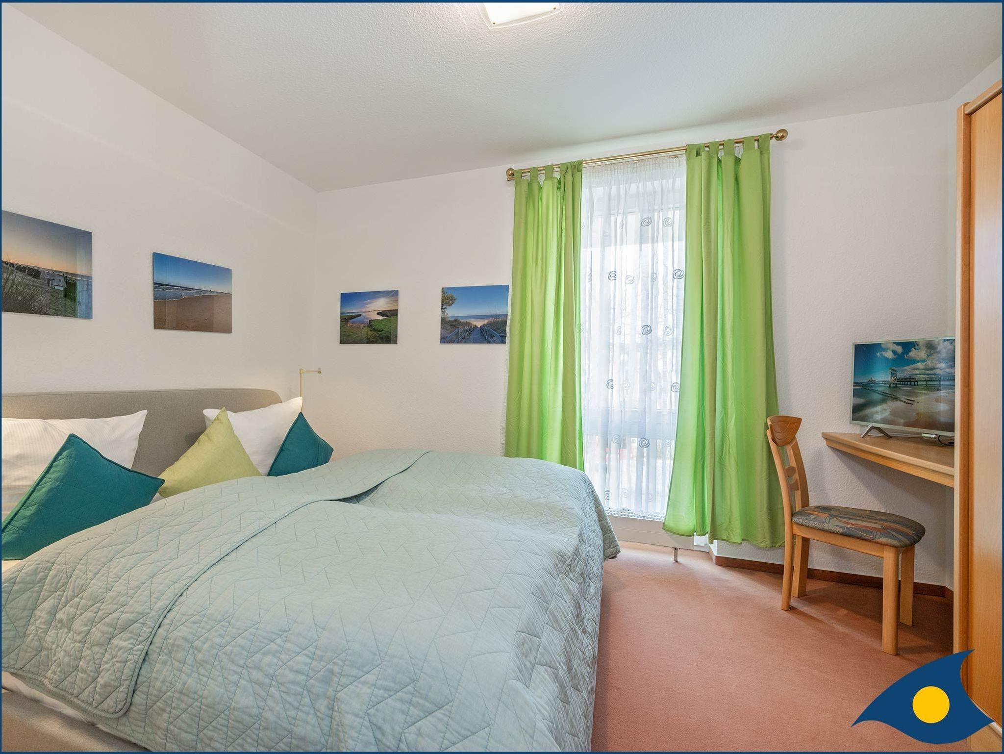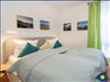 Über eine Treppe gelangen Sie in den unteren Bereich der Maisonette-Wohnung, in dem sich das Schlafzimmer mit einem bequemen Doppelbett, sowie einem weiteren TV-Gerät befindet.