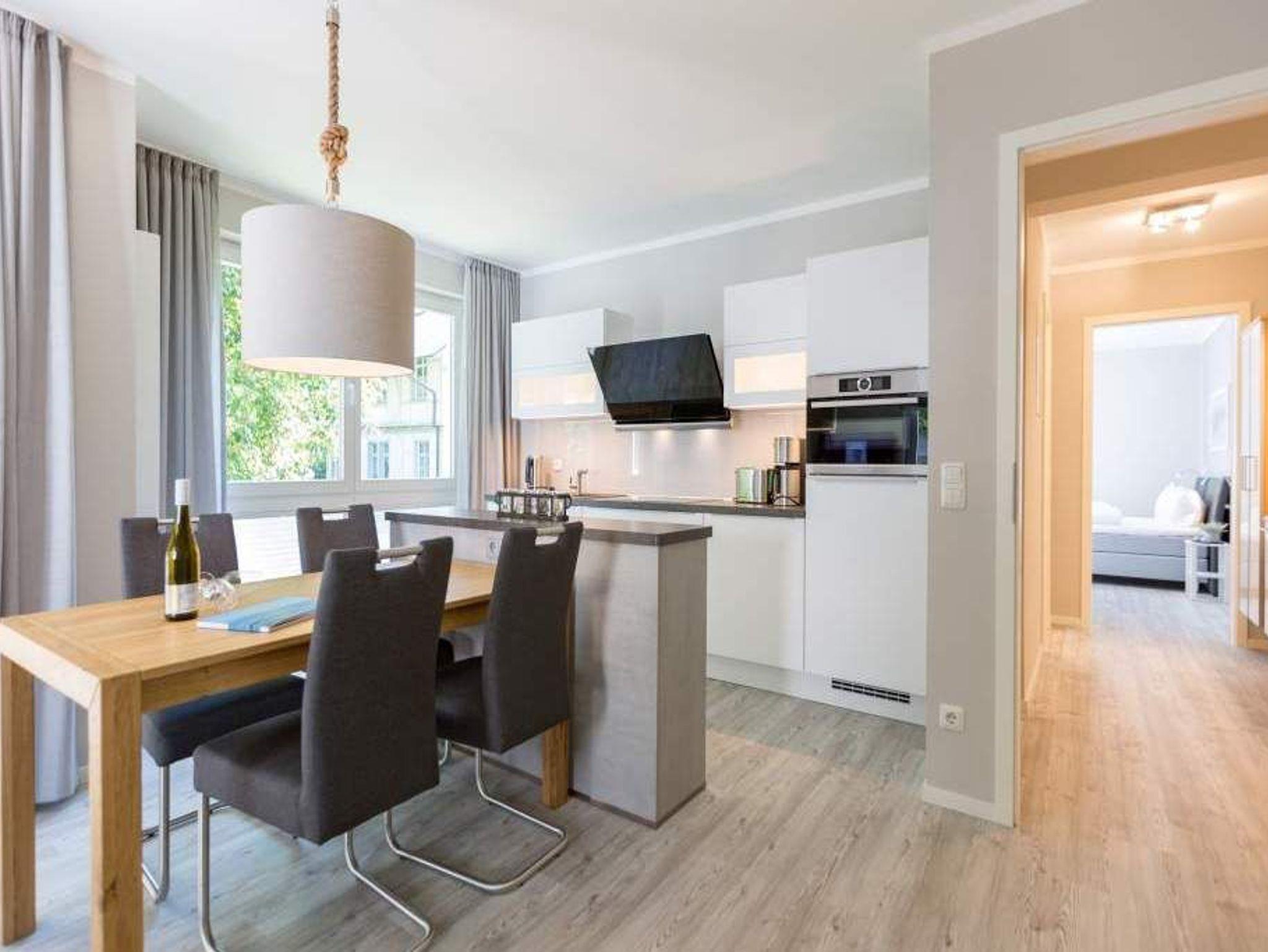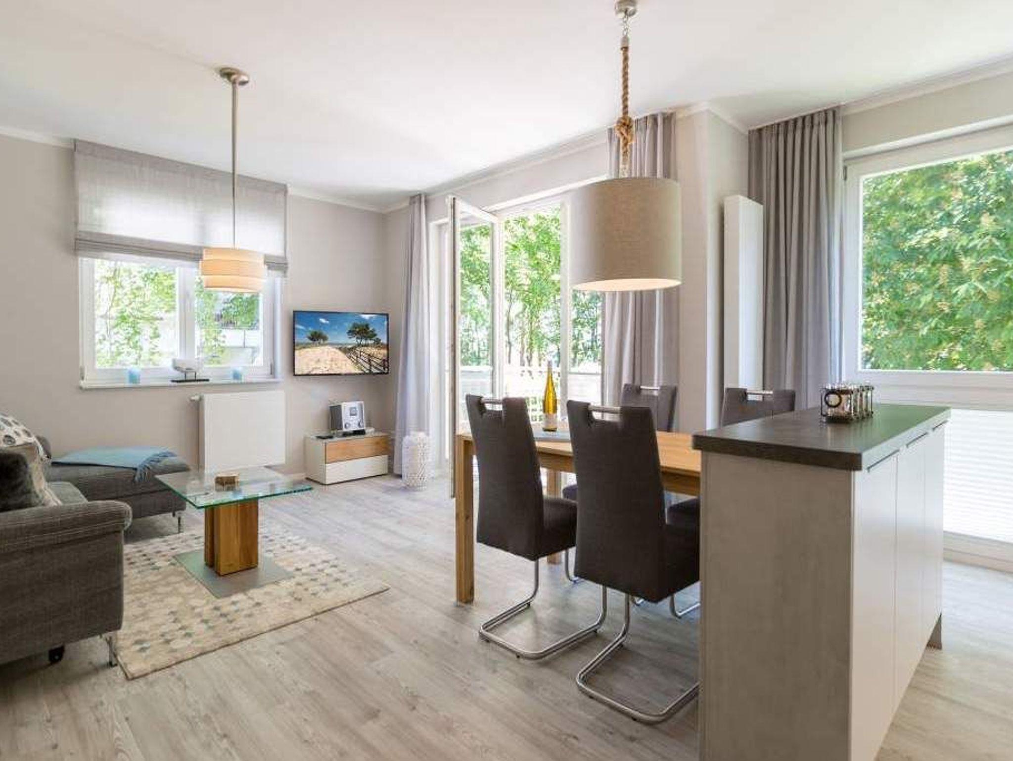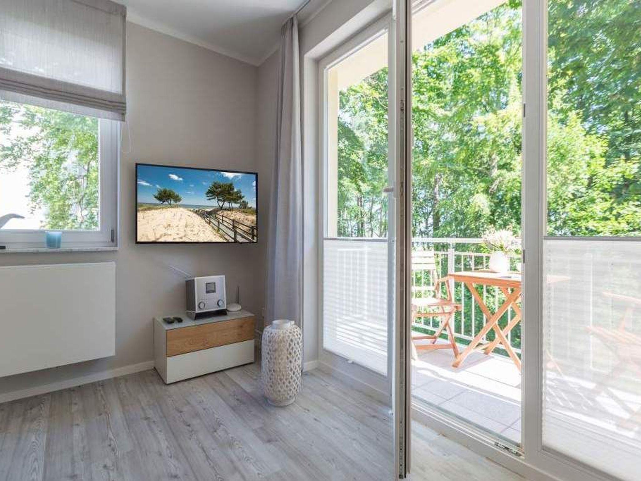 Durch das satte Grün der Bäume schimmert glitzernd blau die Ostsee hindurch. Morgens bei Sonnenschein auf dem Balkon zu sitzen, den Vögeln und dem Meeresrauschen zu lauschen, ist ein perfekter Start in den Urlaubstag. Ob allein oder zweit ? in diesem exklusiven und modernen Ferienappartement wird Ihre Erholung zum entspannten Genuss. Denn viel Platz, Leichtigkeit und Stil prägen die schick eingerichtete, 66 Quadratmeter große Wohnung. Hier gibt es nicht nur ein Highlight, das Ihre Ostseeauszeit zu etwas ganz Besonderem macht. Neben den beiden Balkonen ? vom Wohnzimmer aus und vom Schlafzimmer aus begehbar ? erwartet Sie hier eine kleine Wohlfühloase, die das ganze Jahr über ihre Reize hat. Gerade auch im Winter bietet dieses Urlaubsdomizil die Möglichkeit zur Entspannung. Wenn die Bäume kahl und starr vom kalten Nordost klirren und den Blick auf die schier endlose, in manchen Jahren sogar zugefrorene Ostsee frei geben, können Sie sich diese Landschaft aus dem Wohn- und dem Schlafzimmer, aber auch aus der kuschelig warmen Panorama-Sauna heraus anschauen. Denn auch die mit einem LED-Farblichtsystem versehene Sauna ( für finnischen Saunabetrieb und BIO-Betrieb mit Verdampfer) gehört zu der Wohnung Nummer 7 im 2. Obergeschoss der Villa Barbara dazu. Die unterschiedlichen Lichtstimmungen sorgen zusätzlich für Entspannung pur. Ruhe und Erholung finden Sie zudem in dem geräumigen Wohn-Esszimmer. Eine gemütliche Sofalandschaft lädt zum Relaxen vor dem großen Flat-TV ein. Eine Media-Anlage offeriert Internet Radio und Bluetooth Streaming. Das WLAN ist kostenfrei. Die offene Küche ist mit hochwertigen Geräten und Geschirr voll ausgestattet. Essen können Sie am schönen Echtholztisch. Die große, bodentiefe Fensterfront lässt viel Licht hinein. Echtes Schlafvergnügen gewährleistet im ebenso schönen Schlafzimmer ein komfortables Boxspringdoppelbett (1,60 m x 2,00 m). Viel Ablage bietet der große Kleiderschrank. Auch in diesem Zimmer befindet sich ein Flat-TV. Von hier aus haben Sie Zugang zu einem zweiten Balkon. Genießen Sie hier auf den Sonnenliegen den Sommer. Im Badezimmer steht Ihnen neben dem Zugang zur Sauna eine ebenerdige und sehr geräumige Regendusche, ein Waschtisch und ein WC zur Verfügung. Bei Ihrer Anreise liegen die Handtücher für Sie bereit und das Bett ist bezogen. Ein Pkw-Stellplatz befindet sich am Haus. Für den Tag am Strand steht Ihnen in den Sommermonaten ein Strandkorb (je nach Witterung) zur Verfügung.