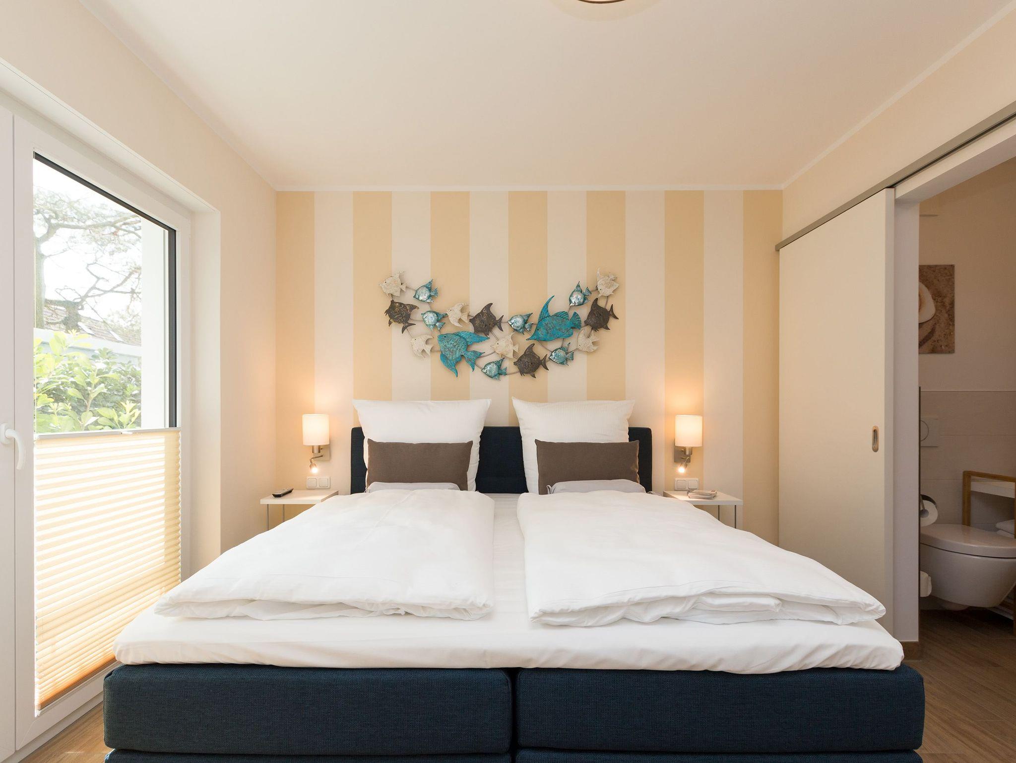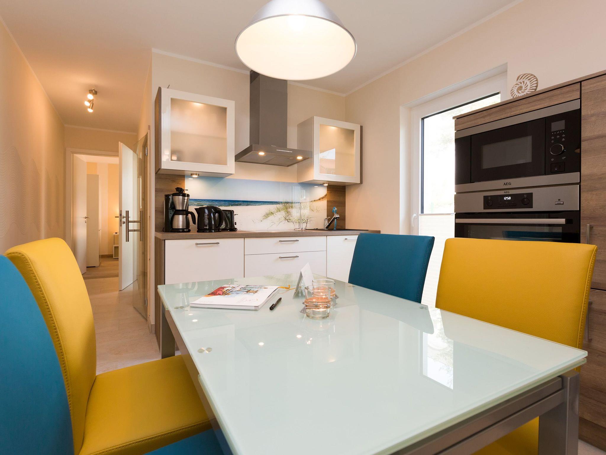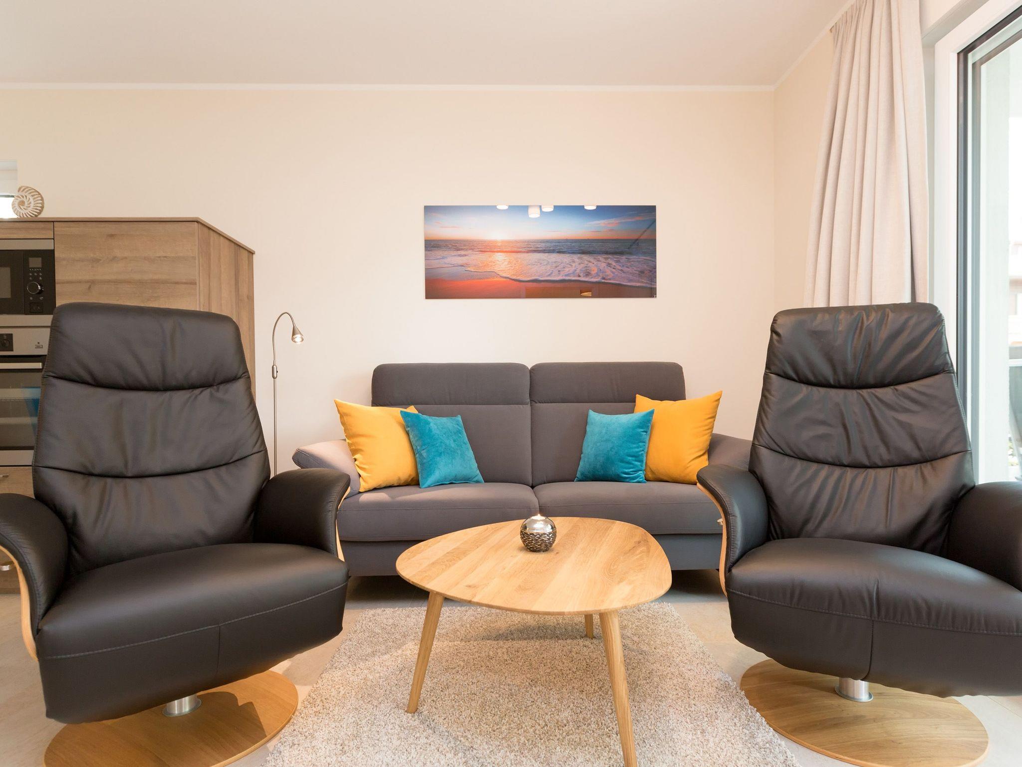 Modern wohnen - schöner Urlauben! Im neuen 3-Raum-Appartement 6 (67 qm) im Erdgeschoss der Dünenresidenz werden Sie erholsame Urlaubstage verleben. Bis zu 4 Personen und ein Kleinkind (als Aufbettung im Babyreisebett) finden hier Platz. Die geschmackvolle Einrichtung, abgestimmte Farben und Materialen und ausgesuchte Dekorationen schaffen ein wunderschönes Urlaubsdomizil. Schon beim Eintreten öffnet sich der helle Wohnbereich mit bequemer Sitzgruppe, Elektro-Kamin mit Fernbedienung und Flat-TV, die komplett ausgestattete Küchenzeile und der Essbereich schließen sich an. Zwei Schlafzimmer mit komfortablen Doppelboxspringbetten (1,80 m x 2,00 m und 1,60 m x 2,00 m) und eigenem Flat-TV sowie zwei Bäder mit Dusche und WC und einer Waschmaschine ergänzen die Wohnung. Selbstverständlich darf die wohnungseigene Sauna nicht fehlen! Ein weiteres Highlight des Appartements ist die großzügige Nord-Ost-Terrasse mit Gartenmöbeln (Zugang vom Wohnbereich und von einem Schlafzimmer). Bevor der Strand lockt, genießt man bei Meeresrauschen hier sein Frühstück in der Morgensonne. Für Ihren Komfort sind bei der Anreise die Betten bezogen und die Erstausstattung Handtücher liegt bereit. Das kostenfreie WLAN steht Ihnen zur Verfügung. Ein Pkw-Stellplatz befindet sich in der Tiefgarage (max. Einfahrtshöhe 1,85 m) und für Fahrräder gibt es einen separaten Abstellraum im Keller.