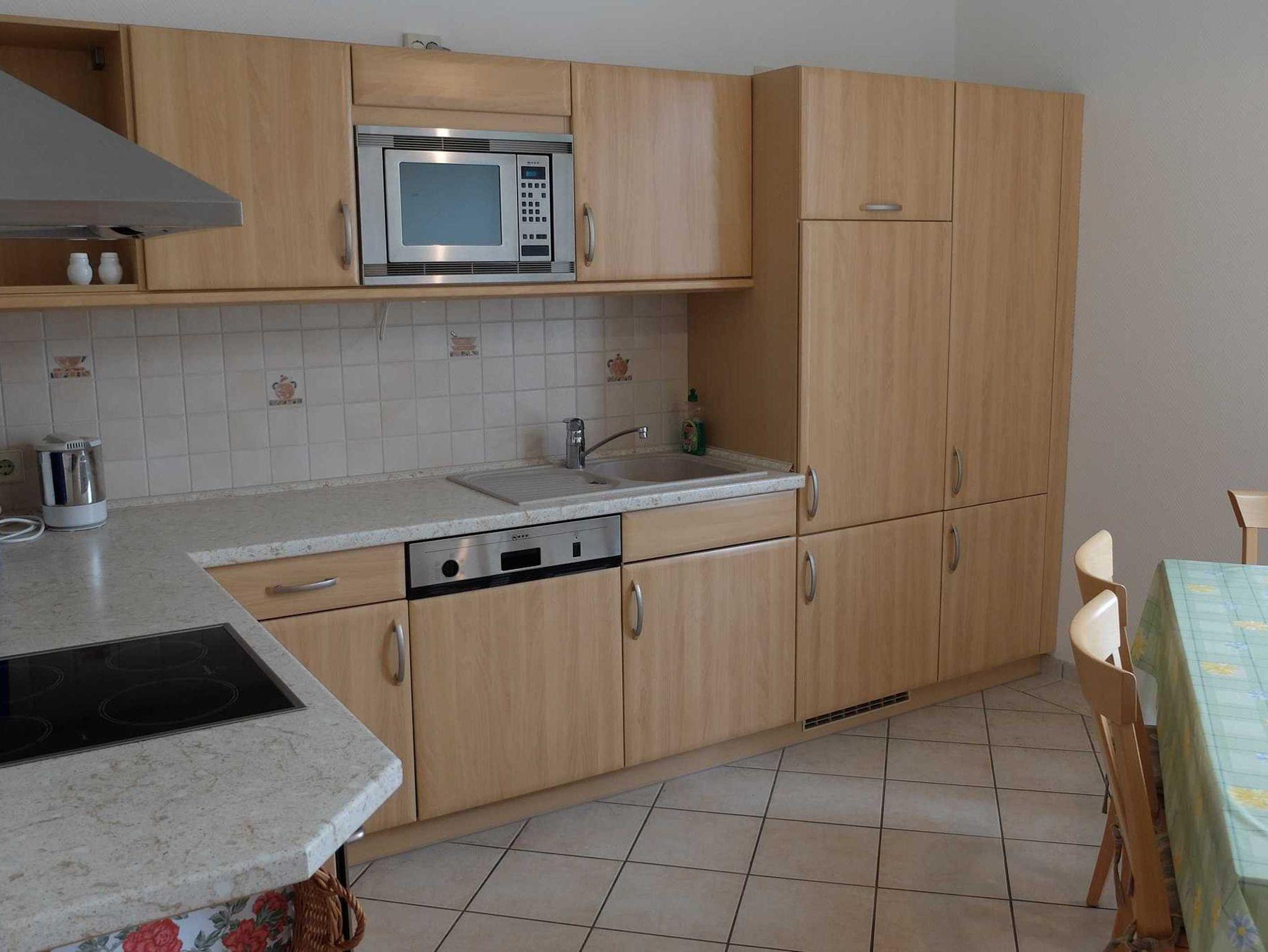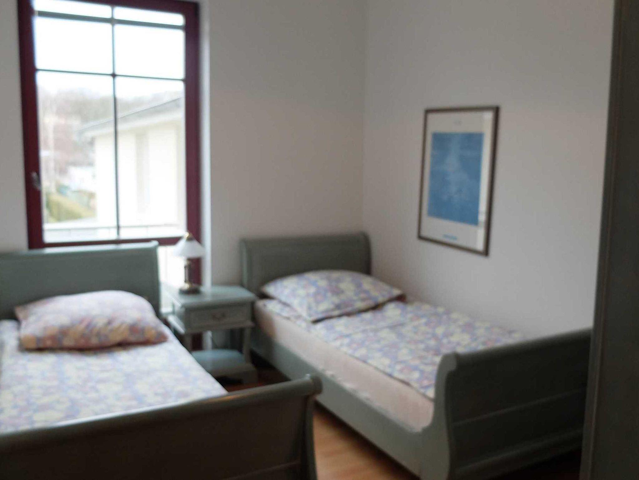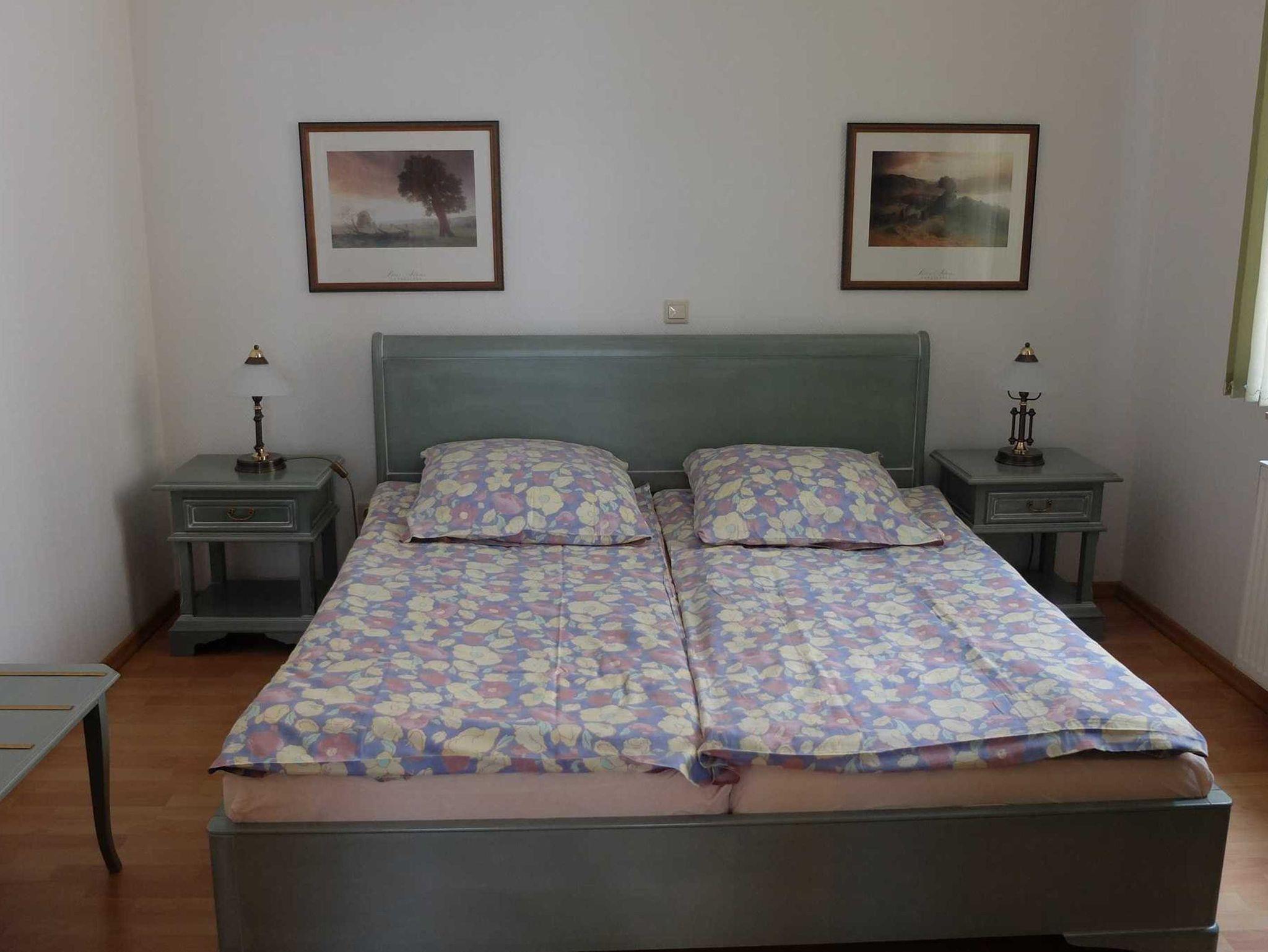 Die moderne großzügige 3 Raum Ferienwohnung befindet sich im 1. OG. (85 m²). Sie verfügt über zwei separate Schlafzimmer. Das 1. Schlafzimmer ist mit einem Doppelbett ausgestattet. Im 2. Schlafzimmer befinden sich zwei Einzelbetten. Im Wohnzimmer befindet sich eine Schlafcouch. Eine Aufbettung ist auf Anfrage möglich. Zur weiteren Ausstattung gehört eine komplette Küchenzeile (mit Geschirrspüler, Cerankochfeldherd, Backofen und Mikrowelle), Sat-TV und Radio. Das Bad ist mit einer Dusche und WC ausgestattet. Erstausstattung Bettwäsche und Handtücher sind inklusive.