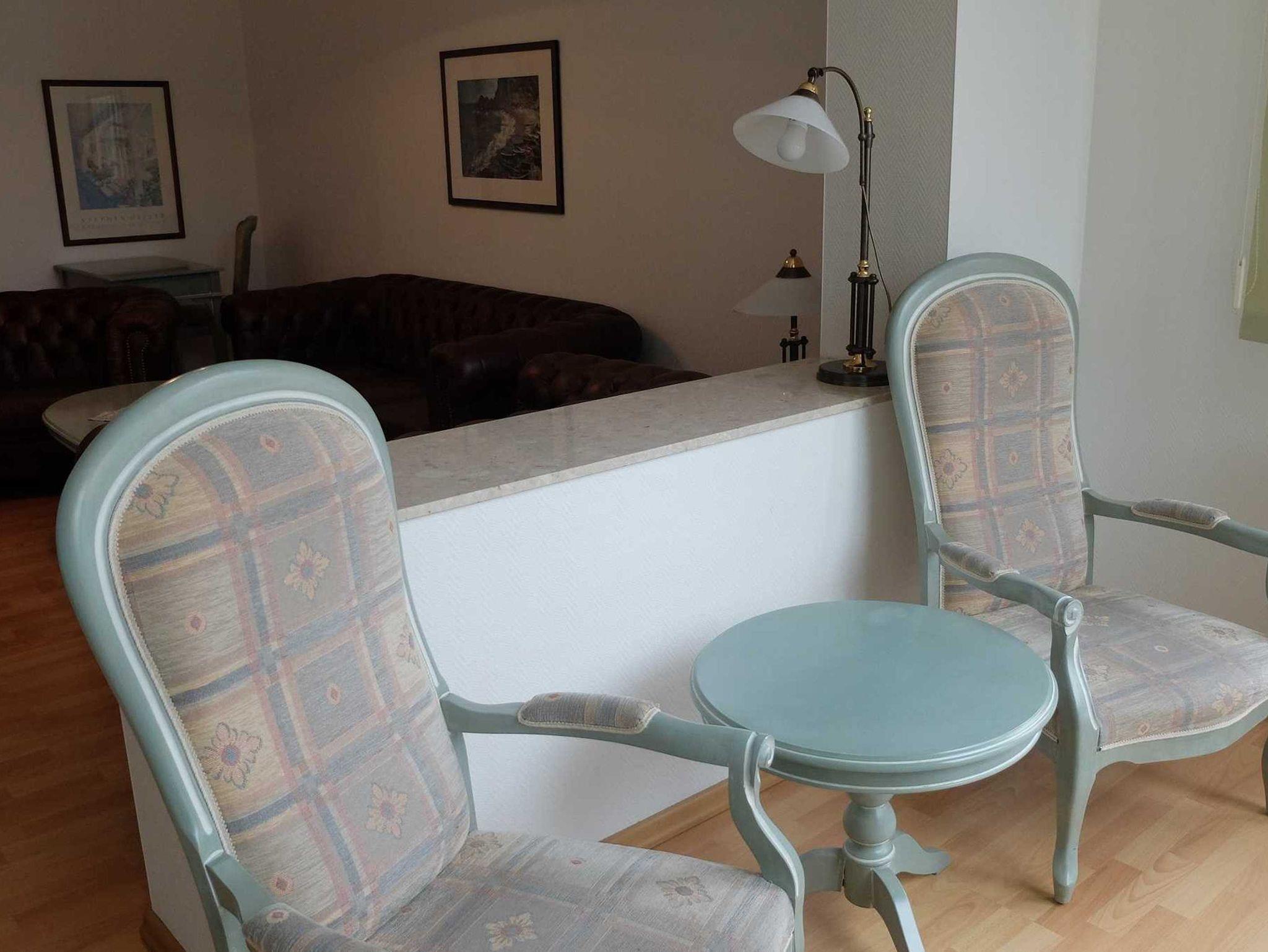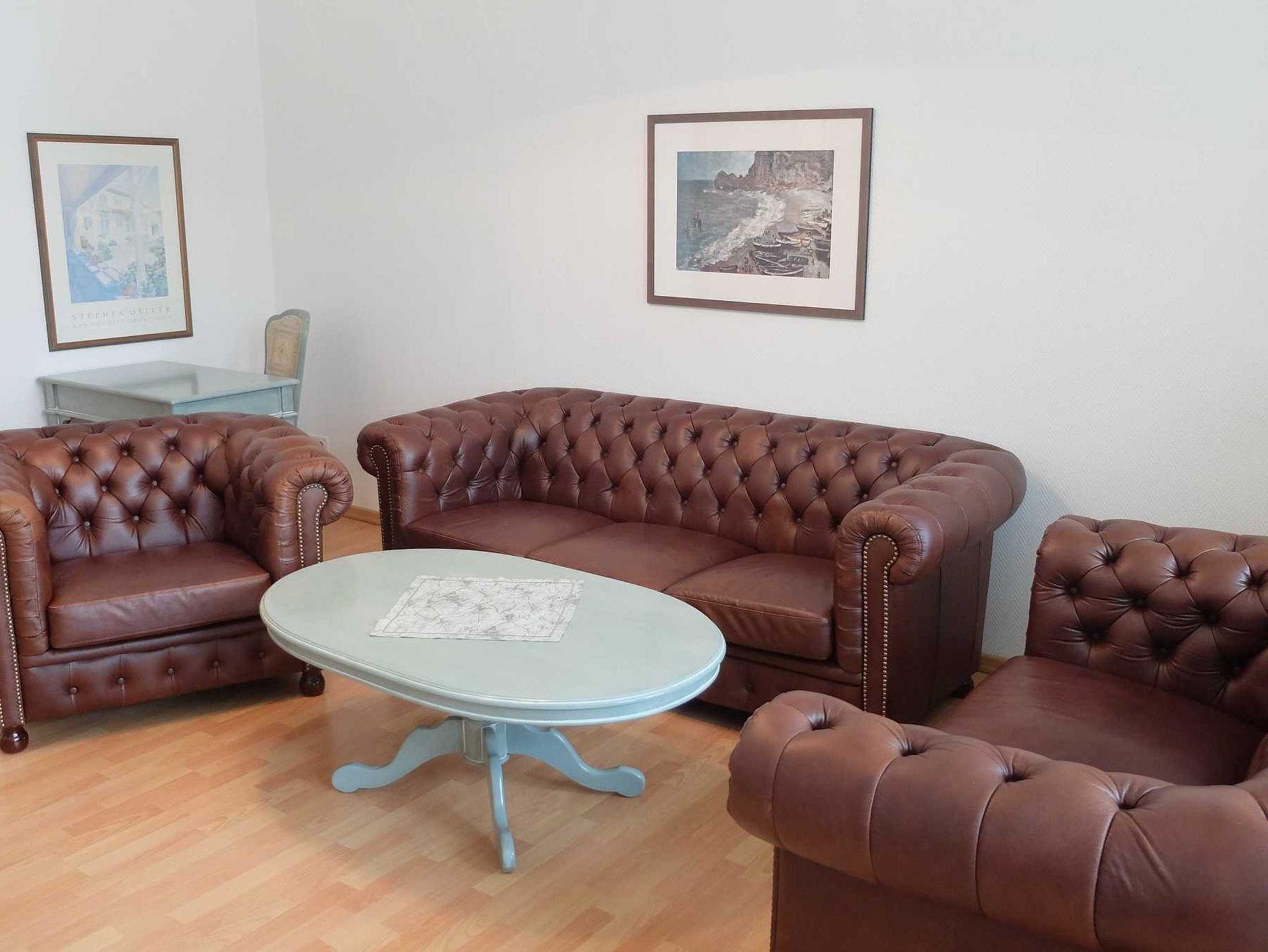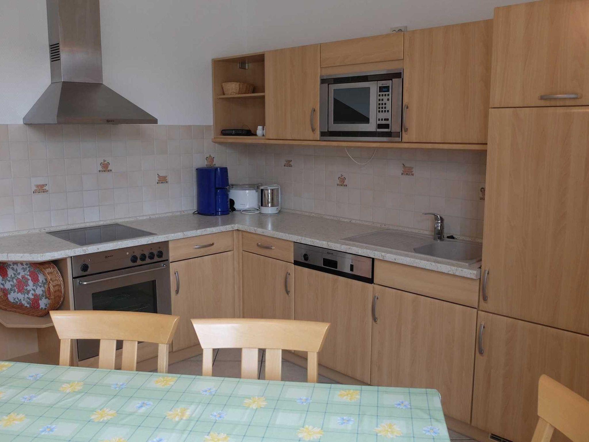 Die moderne großzügige 3 Raum Ferienwohnung befindet sich im 1. OG. (85 m²). Sie verfügt über zwei separate Schlafzimmer. Das 1. Schlafzimmer ist mit einem Doppelbett ausgestattet. Im 2. Schlafzimmer befinden sich zwei Einzelbetten. Im Wohnzimmer befindet sich eine Schlafcouch. Eine Aufbettung ist auf Anfrage möglich. Zur weiteren Ausstattung gehört eine komplette Küchenzeile (mit Geschirrspüler, Cerankochfeldherd, Backofen und Mikrowelle), Sat-TV und Radio. Das Bad ist mit einer Dusche und WC ausgestattet. Erstausstattung Bettwäsche und Handtücher sind inklusive.