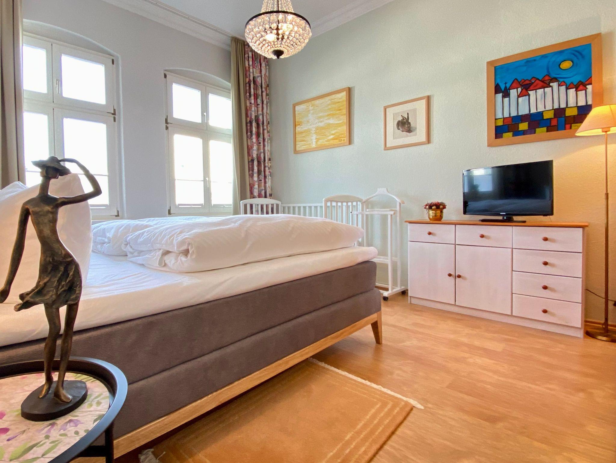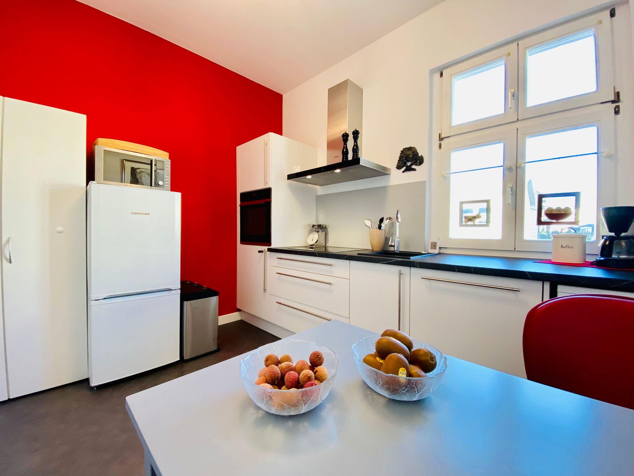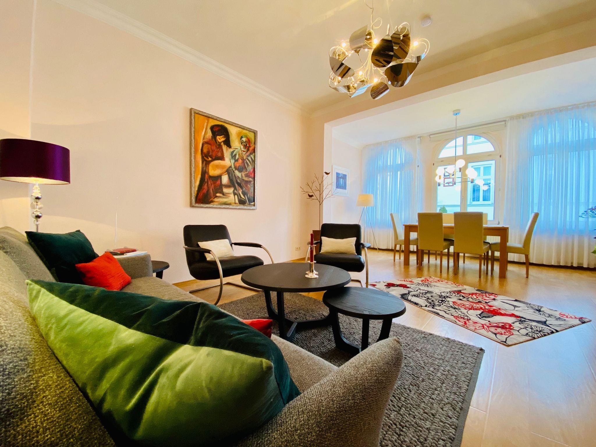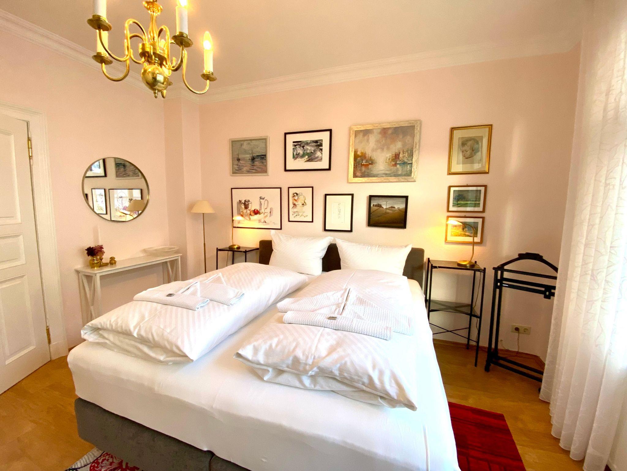 Die Ferienwohnung Melusine ist eine sehr modern und liebevoll eingerichtete Ferienwohnung im ersten Stock des Gartenhauses der Villa Elisabeth, die über das historische Treppenhaus zu erreichen ist. Diese Ferienwohnung verfügt über 2 Schlafzimmer mit Boxspringbett und separatem Kinderbett und TV. Es erwartet Sie ein großer Wohnbereich mit Esstisch und Couchecke (Schlafcouch für 5. und 6. Person). Die Ferienwohnung verfügt über eine separate Komplettküche ebenfalls mit Esstisch und Waschmaschine. Zur Wohnung gehört ein exklusives Bad mit Dusche.