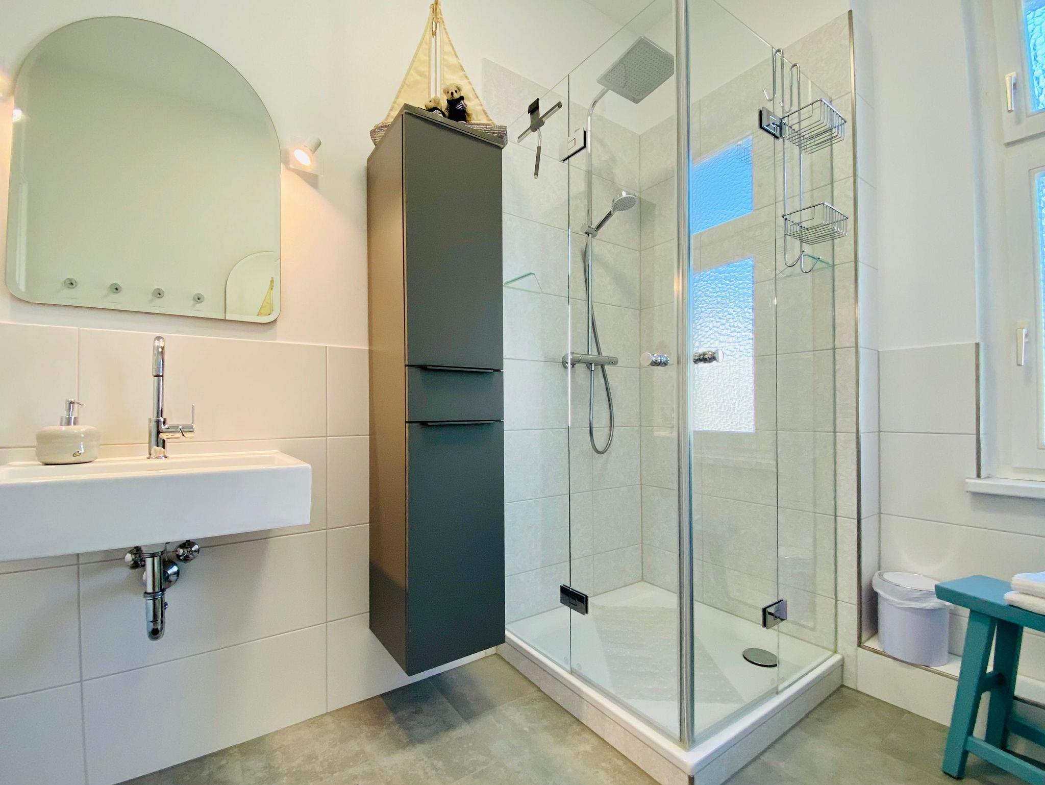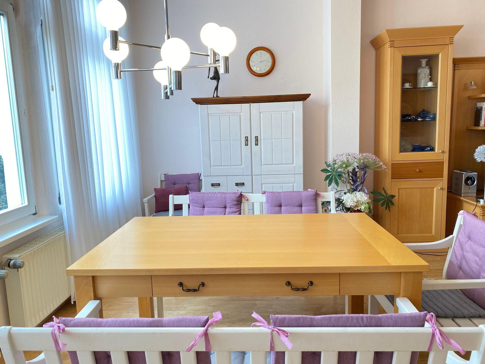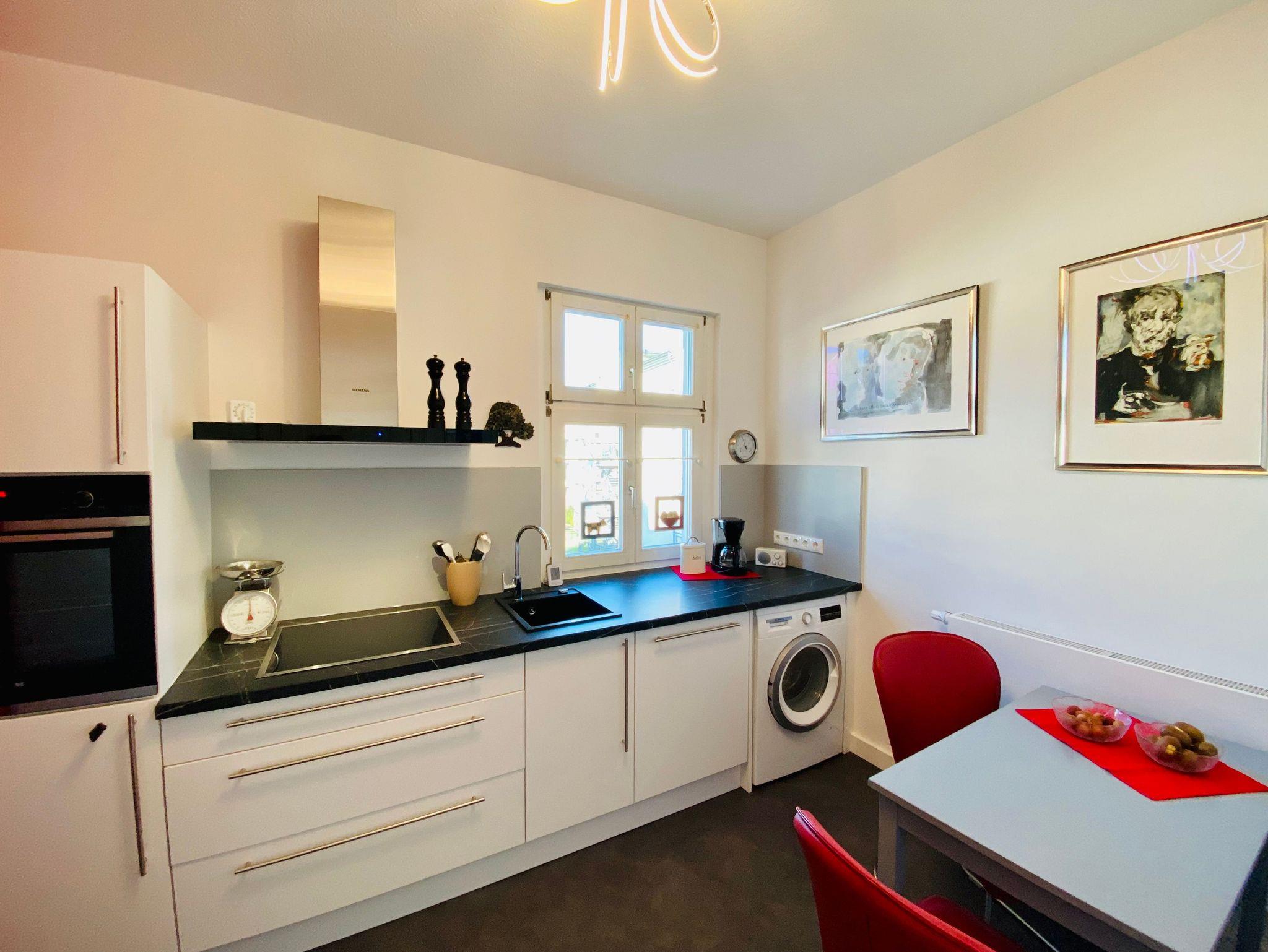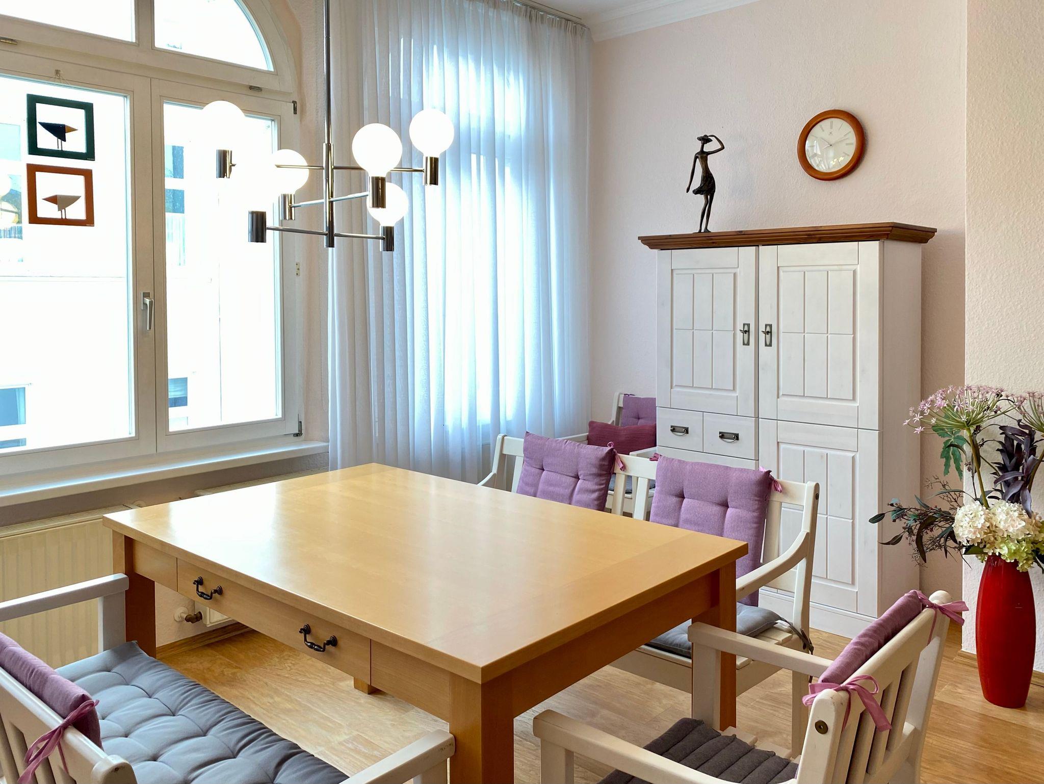 Die Ferienwohnung Melusine ist eine sehr modern und liebevoll eingerichtete Ferienwohnung im ersten Stock des Gartenhauses der Villa Elisabeth, die über das historische Treppenhaus zu erreichen ist. Diese Ferienwohnung verfügt über 2 Schlafzimmer mit Boxspringbett und separatem Kinderbett und TV. Es erwartet Sie ein großer Wohnbereich mit Esstisch und Couchecke (Schlafcouch für 5. und 6. Person). Die Ferienwohnung verfügt über eine separate Komplettküche ebenfalls mit Esstisch und Waschmaschine. Zur Wohnung gehört ein exklusives Bad mit Dusche.