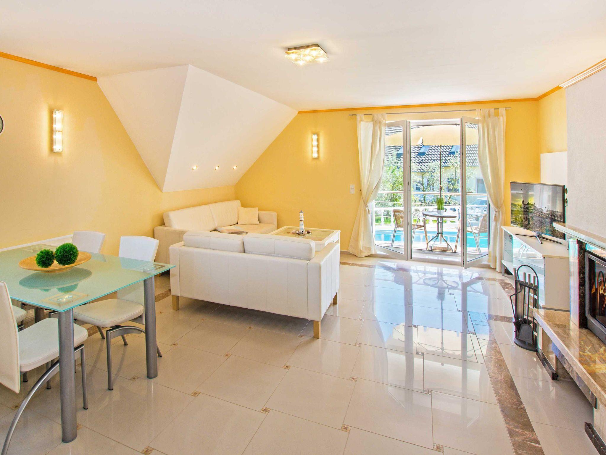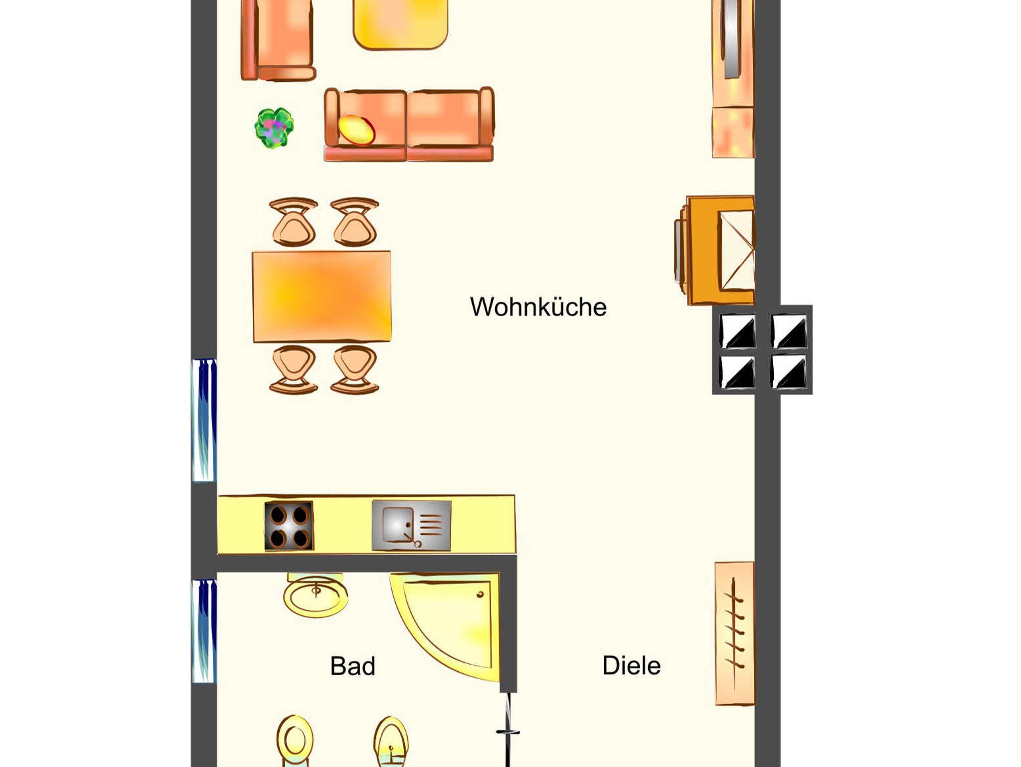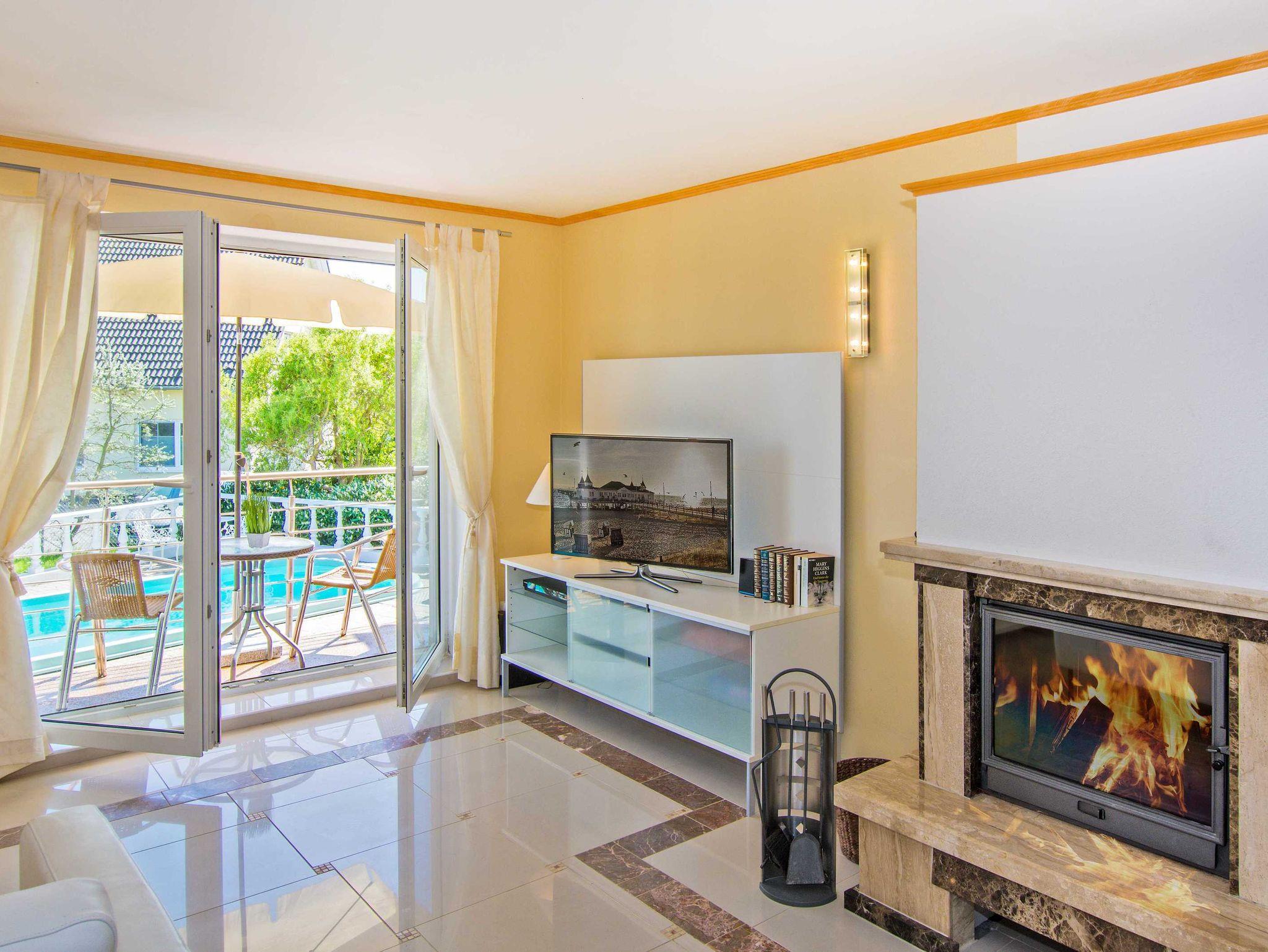 Nehmen Sie Platz auf den beiden gemütlichen Sofas im offenen Wohnbereich, die Ihnen die Sicht auf den Fernseher und hinaus durch die bodentiefen Fenster auf den Balkon. Eines der beiden Sofas lässt sich als Schlafbett für eine weitere Personen ausziehen. Die Küchenzeile, bestehend aus Backofen, Herd mit Ceranfeld, Kühlschrank mit Gefrierfach, Geschirrspülmaschine, sowie Kleinelektrogeräten wie einer Mikrowelle, Kaffeemaschine, Toaster und Wasserkocher steht vor dem großen Esstisch mit vier Stühlen. Zu Ihrer Unterhaltung stehen Ihnen ein 3D 40“Flat TV mit Blue-Ray HiFi-Anlage zur Verfügung. Der Kamin schafft in den Wintermonaten eine wohlige Atmosphäre. Das maritime Badezimmer stellt Ihnen eine gläserne Duschkabine, ein unterbautes Waschbecken mit Spiegel und Kosmetikspiegel, Haartrockner, Bidet und WC bereit.