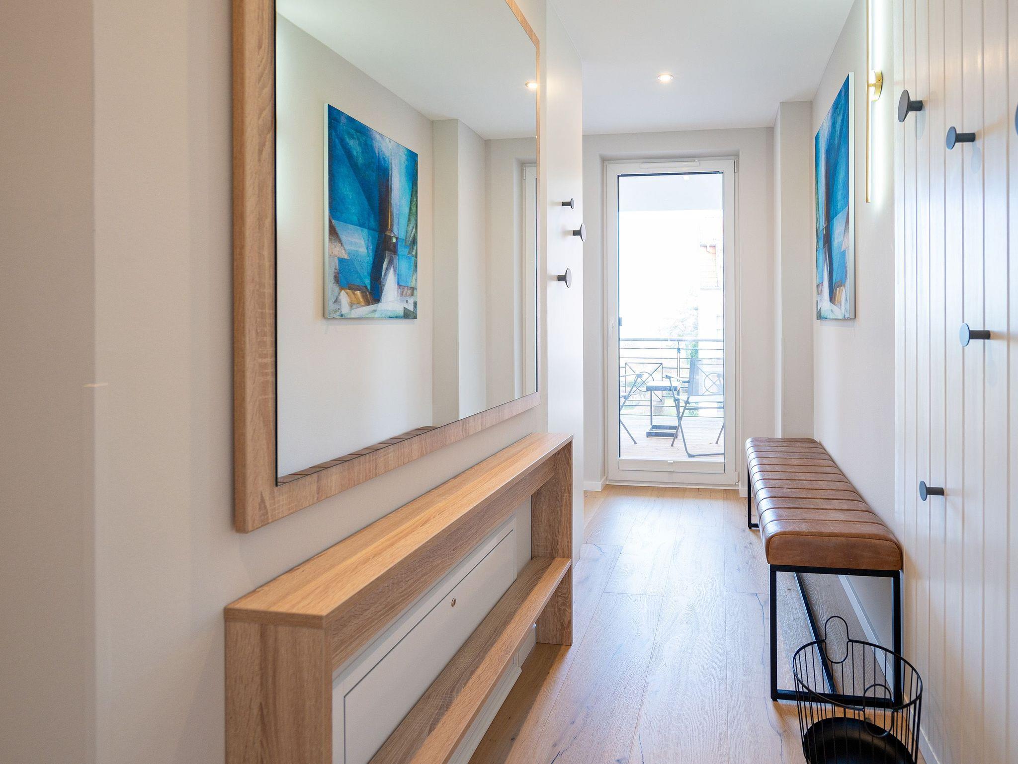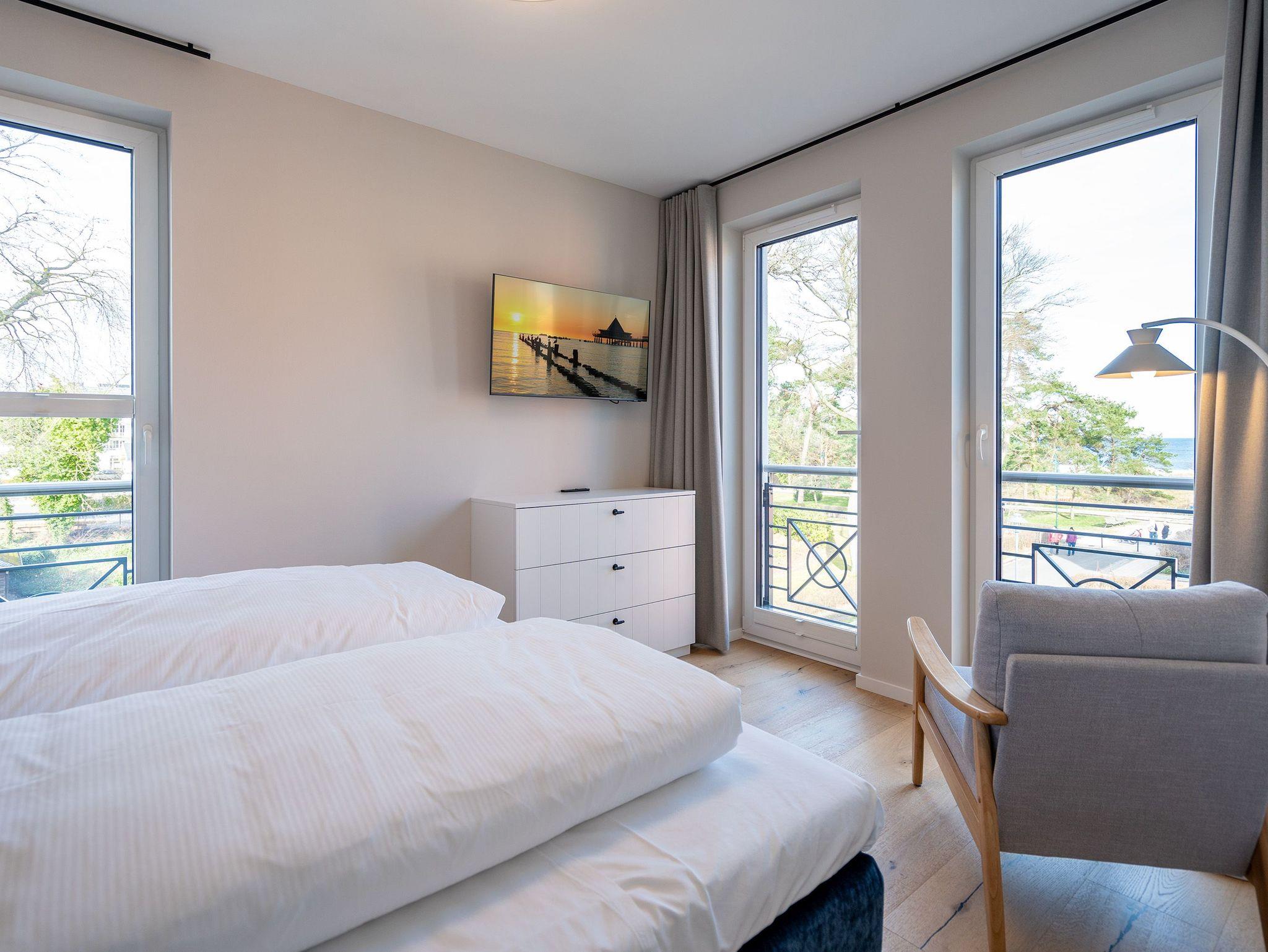 Willkommen in der großzügigen 3-Raum-Ferienwohnung Nr. 07 im Quartier am Strand! Diese herrliche 84 Quadratmeter große Wohnung im 2. Obergeschoss bietet Platz für bis zu 4 Erwachsene und ein Kleinkind (im Kinderreisebett). Der offene Wohnbereich ist ein einladender Ort, um Ihre Urlaubstage zu genießen. Hier finden Sie eine gemütliche Sitzgruppe, einen Flachbildfernseher (43 Zoll) und einen einladenden Kaminofen. Der Essplatz für 4 Personen lädt zu gemeinsamen Mahlzeiten und geselligen Abenden ein. Vom Wohnbereich aus gelangen Sie direkt auf den 9 Quadratmeter großen Süd-West-Balkon, wo Sie die Sonne und die frische Meeresluft in vollen Zügen genießen können. Die voll ausgestattete Küchenzeile bietet modernste Annehmlichkeiten, darunter einen Induktionsherd und eine Mikrowelle, um Ihre kulinarischen Abenteuer zu bereichern. Die Wohnung beherbergt zwei gemütliche Schlafzimmer, von denen eines mit einem komfortablen Boxspringdoppelbett (1,80m x 2,00m) ausgestattet ist und einen direkten Zugang zum innenliegenden Masterbad bietet. Hier finden Sie eine Dusche, einen Waschtisch und ein WC. Das zweite Schlafzimmer ist ebenfalls mit einem herrlichen Boxspringdoppelbett (1,80m x 2,00m), einem Flachbildfernseher und einem atemberaubenden Seeblick ausgestattet, der Ihre Morgen mit einer malerischen Kulisse bereichert. Zusätzlich zum Masterbad gibt es ein zweites Tageslichtbad mit Waschtisch, Dusche, WC, Waschmaschine und Trockner, um Ihren Aufenthalt so angenehm wie möglich zu gestalten. Die finnische Sauna für 2-3 Personen bietet eine wundervolle Gelegenheit zur Entspannung und Regeneration nach einem erlebnisreichen Tag. Genießen Sie den Ausblick zur Ostsee vom zweiten Balkon (6 qm) aus und erleben Sie Momente der Ruhe und Entspannung. Ihr Fahrzeug findet zwei sichere Plätze nebeneinander in der Tiefgarage, wobei einer optional mit einer E-Ladesäule buchbar ist. Ein wohnungseigener Fahrradkeller steht ebenfalls zur Verfügung. Erleben Sie unvergessliche Tage in dieser traumhaften Ferienwohnung und erkunden Sie die Schönheit der Umgebung.