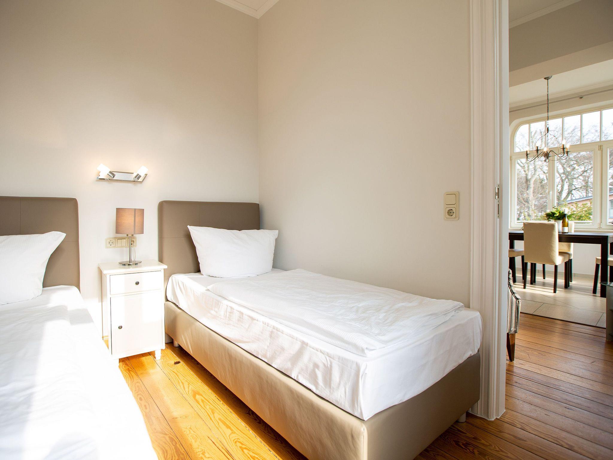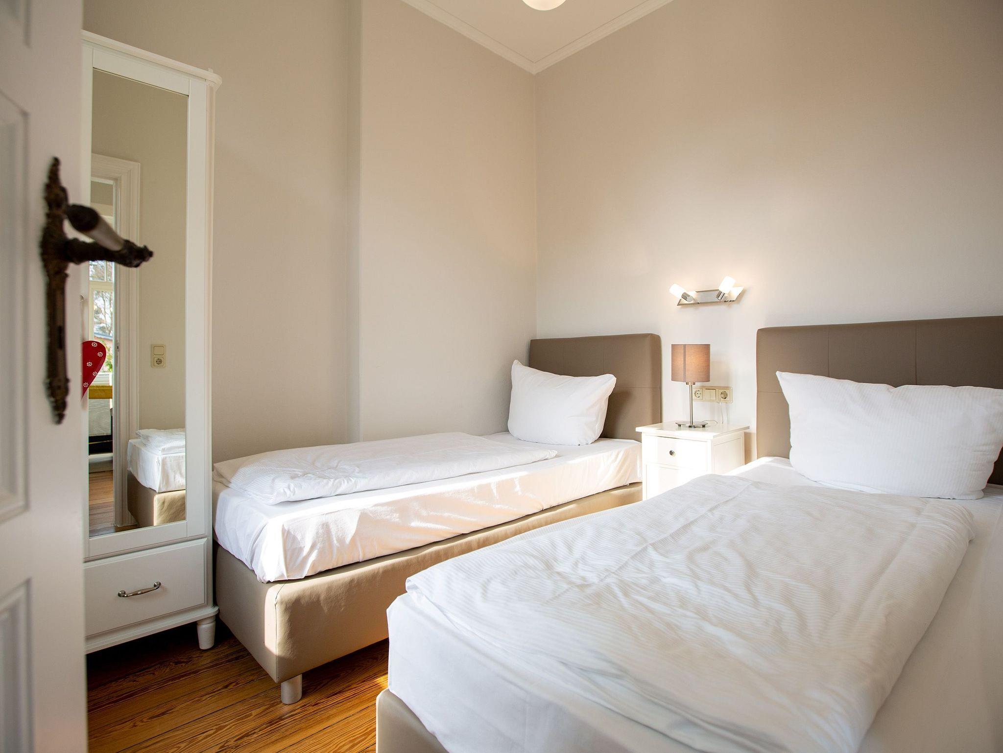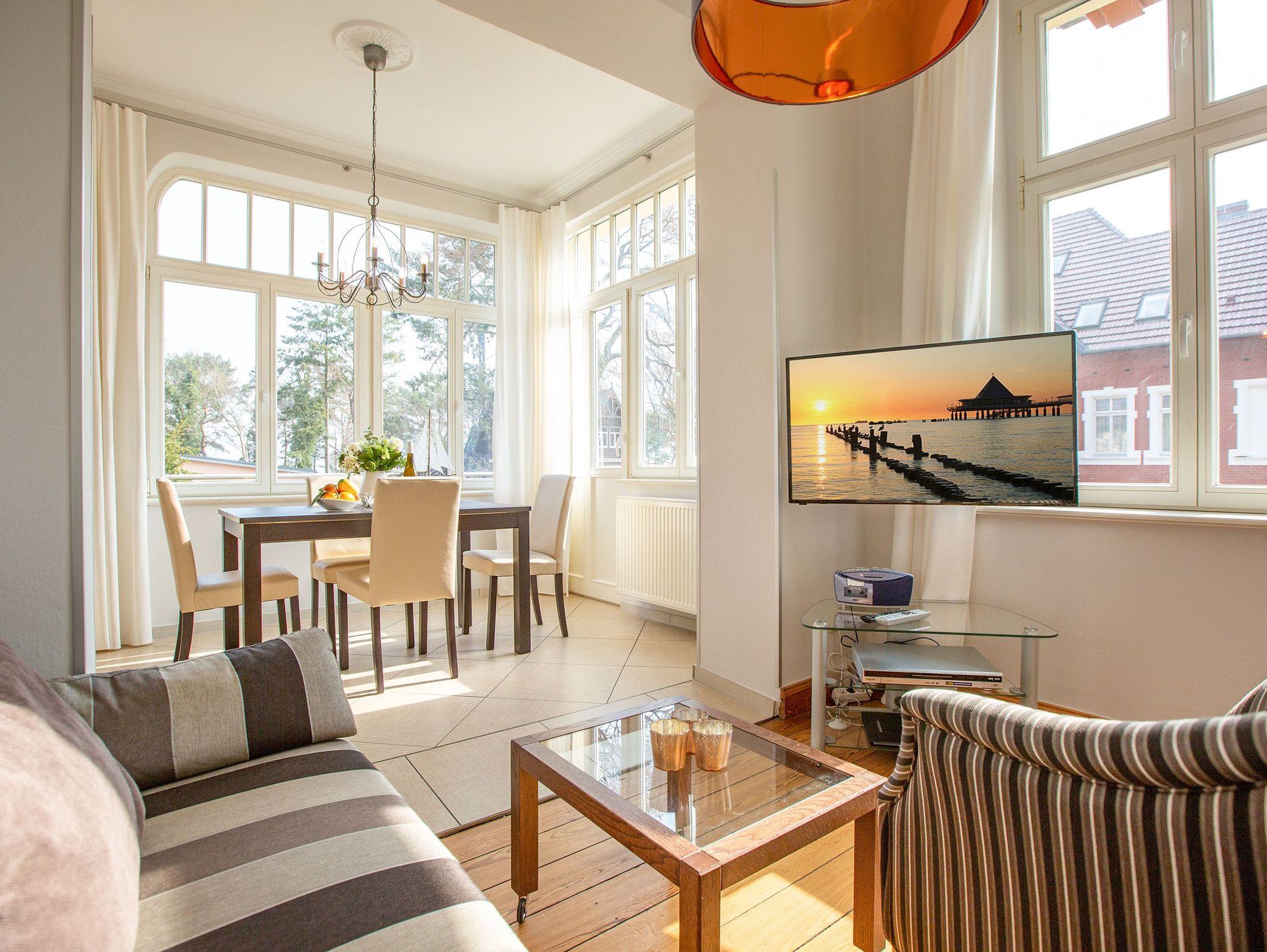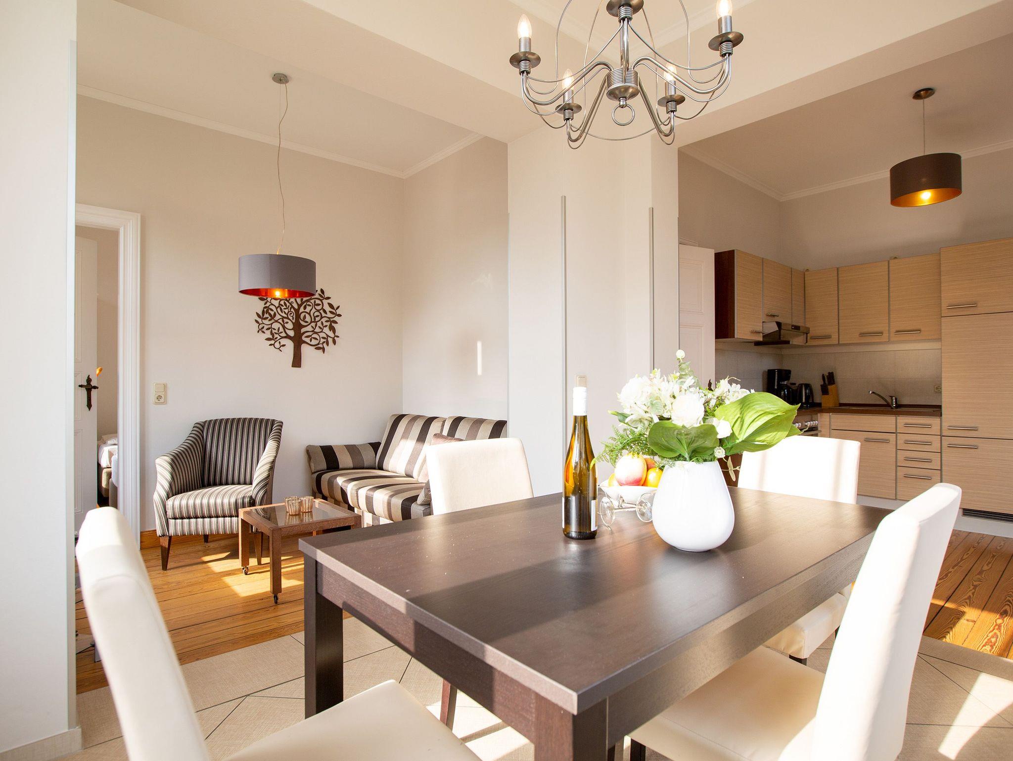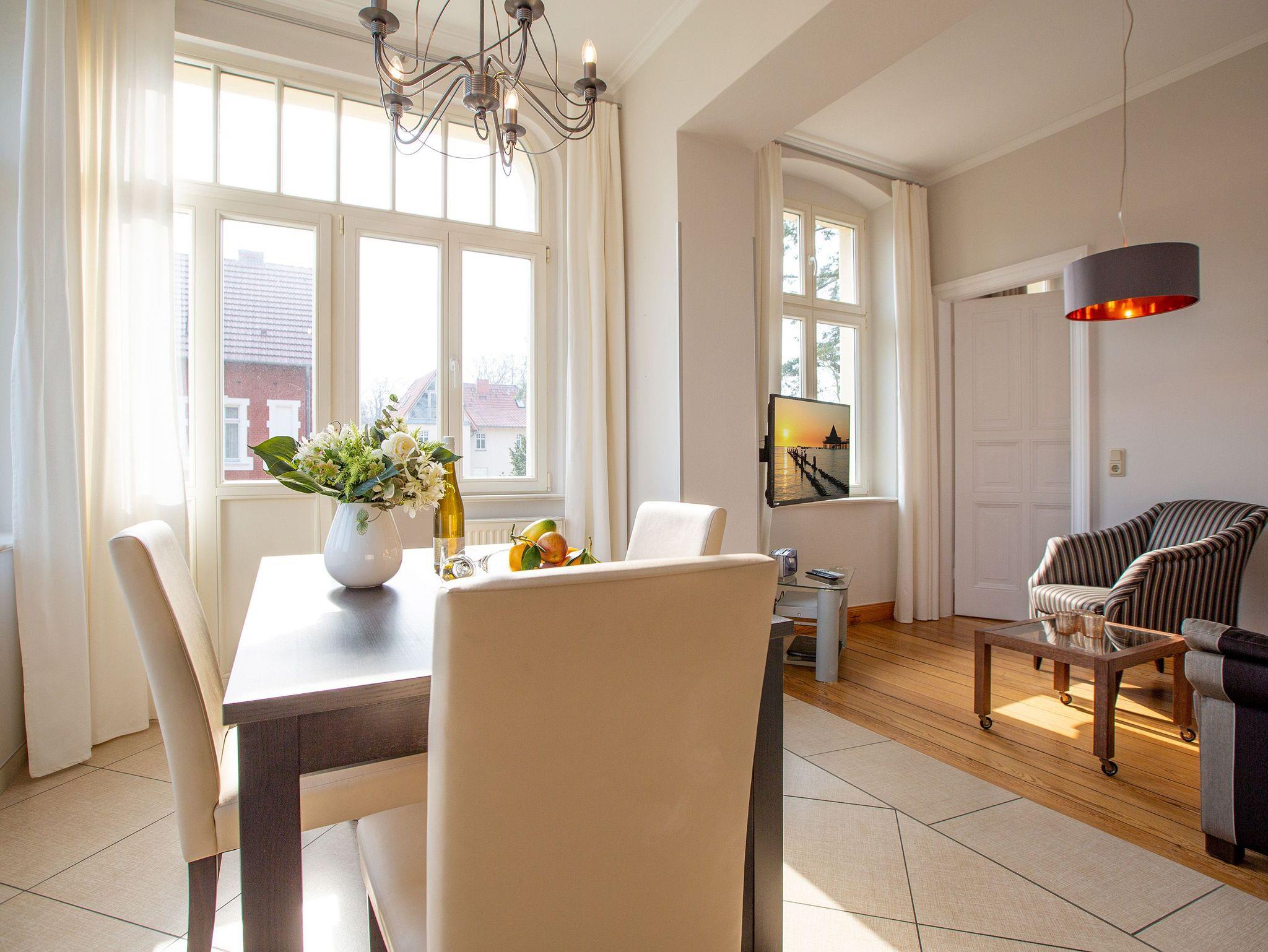 Ankommen und Wohlfühlen. Die Ferienwohnung 3 im ersten Obergeschoss der Villa gelegen, bietet alles was man für einen gelungenen Urlaub auf Usedom braucht. Der moderne Wohnbereich mit Flachbild-TV wird ergänzt durch eine offene, komplett ausgestattete Küche und einen schönen Essbereich. Zwei Schlafzimmer bieten Platz für 4 Gäste. Für Ihren Komfort steht die Erstausstattung Wäsche (Bettwäsche [&] Handtücher) für Sie bereit. Schon am Morgen genießen Sie die Sonne auf dem großzügigen Balkon.