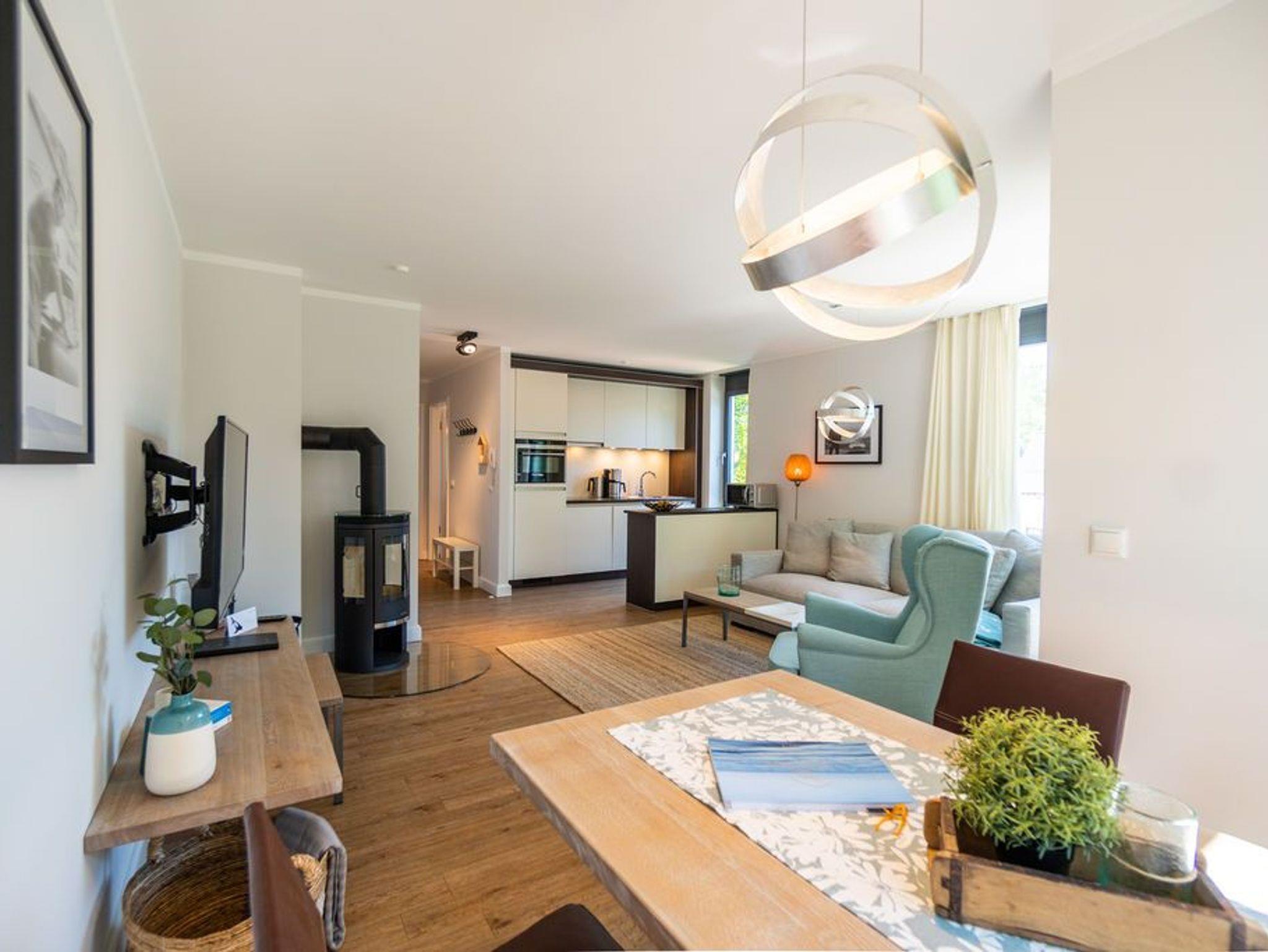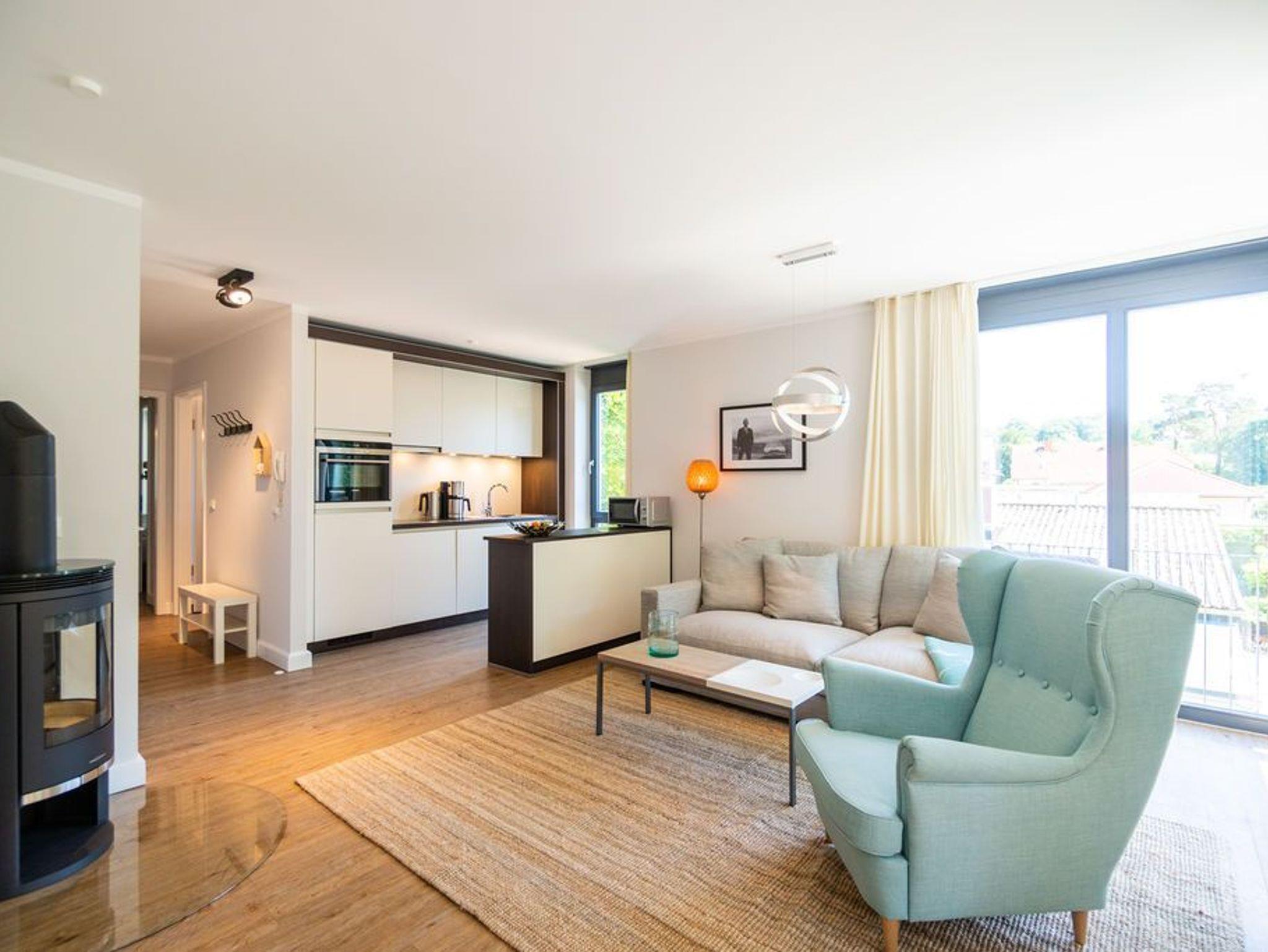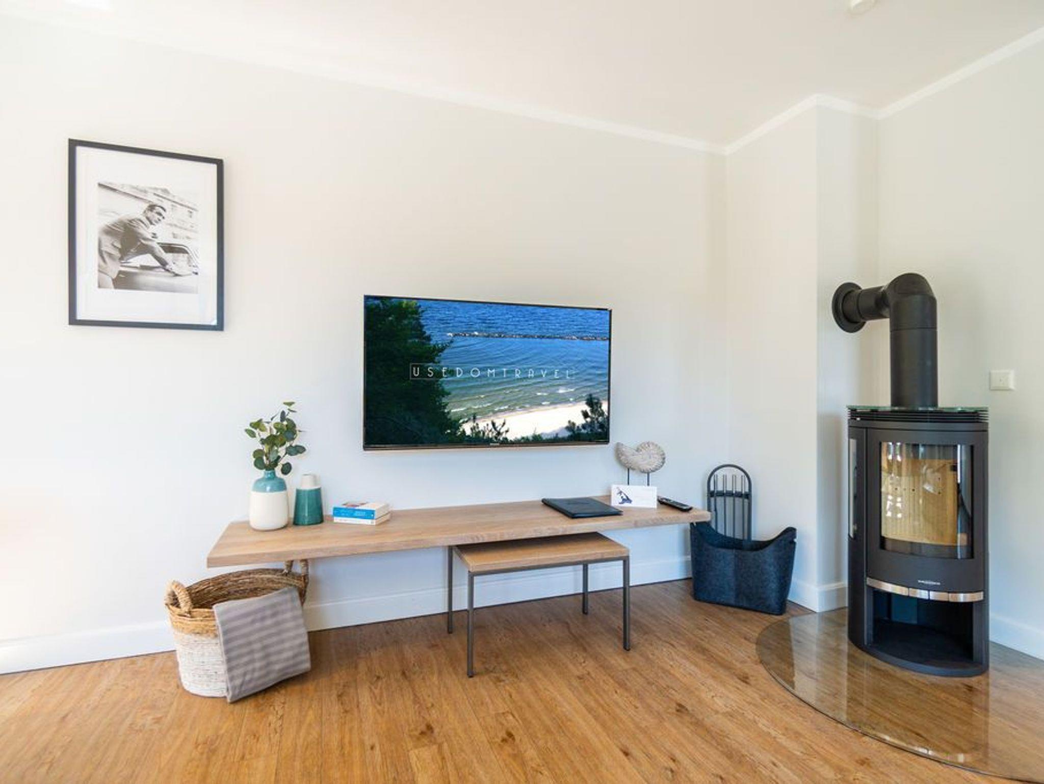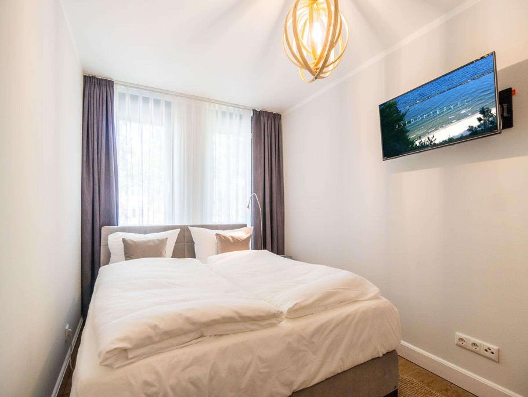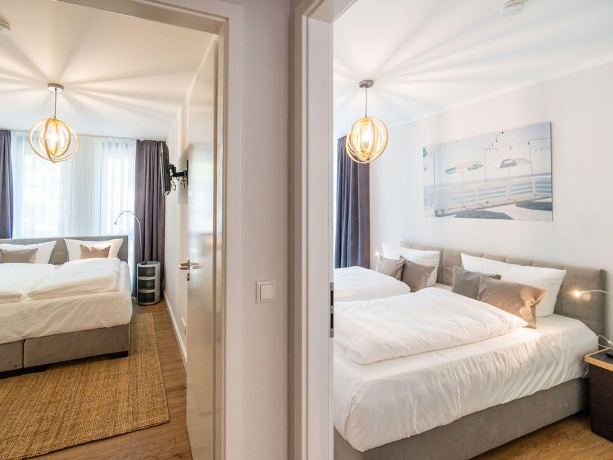 Machen Sie einmal die Augen zu und stellen sich einen sonnenüberfluteten Süd-Balkon vor. In der Hand ein erfrischendes Getränk. Der Himmel färbt sich im Untergang der Sonne in flammendes Orange und Rot. Die nahe Ostsee weht eine angenehme Brise herüber. Sie haben Zeit. Zeit zum Durchatmen. Zeit zum Genießen. Ortswechsel. Im Kamin flackert fesselnd ein wohlig warmes Feuer. Eingekuschelt auf dem Sofa verfolgen Sie das Spiel der Flammen. Hier können Sie zur Ruhe kommen. Abschalten. Das Feriendomizil Nummer 4 im 1. Obergeschoss der Villa Maxim ist eine solche Ruhezone, die sie mit viel Gemütlichkeit und einem urigen Charme empfängt, um Ihnen eine herrlich entspannende Auszeit zu schenken. Auf 70 Quadratmetern finden Sie hier alles, was Sie dafür benötigen. Ein schönes, helles und modern eingerichtetes Wohn-Esszimmer mit Kaminofen und Flat-TV lädt zum Entspannen und gemeinsamen Essen ein. Eine offene und voll ausgestattete Küche lässt das Herz von Hobbyköchen höher schlagen. Essen können Sie am großen Esstisch im Wohnzimmer oder auf dem beschriebenen Balkon unter freiem Himmel. Zum Schlafen stehen den bis zu vier Personen und einem Kleinkind (im Kinderreisebett), die in dieser Wohnung Platz finden, zwei schöne Schlafzimmer zur Verfügung. In jedem steht ein komfortables und äußerst bequemes Boxspringdoppelbett (1,80 m x 2,00 m und 1,60 m x 2,00 m). In den geräumigen Schränken können Sie Ihre Urlaubsgarderobe unterbringen. Das größere der beiden Schlafzimmer hat sogar einen eigenen, kleinen Nord-Balkon. Das Tageslichtbad verfügt über eine Dusche, einen Waschtisch und ein WC. Und wünschen Sie sich einmal so richtig Entspannung, können Sie im Erdgeschoss den kleinen SPA mit zwei Saunen, Dusche und Ruheraum mit nutzen. Kostenfrei. Ebenfalls kostenfrei ist das WLAN-Netz. Ein Pkw-Stellplatz ist für Sie auf dem Gelände reserviert. Bei Ankunft sind die Betten bereits bezogen und Handtücher liegen bereit.
