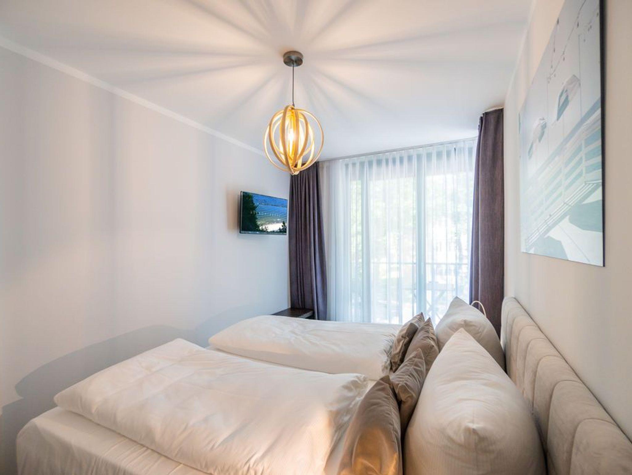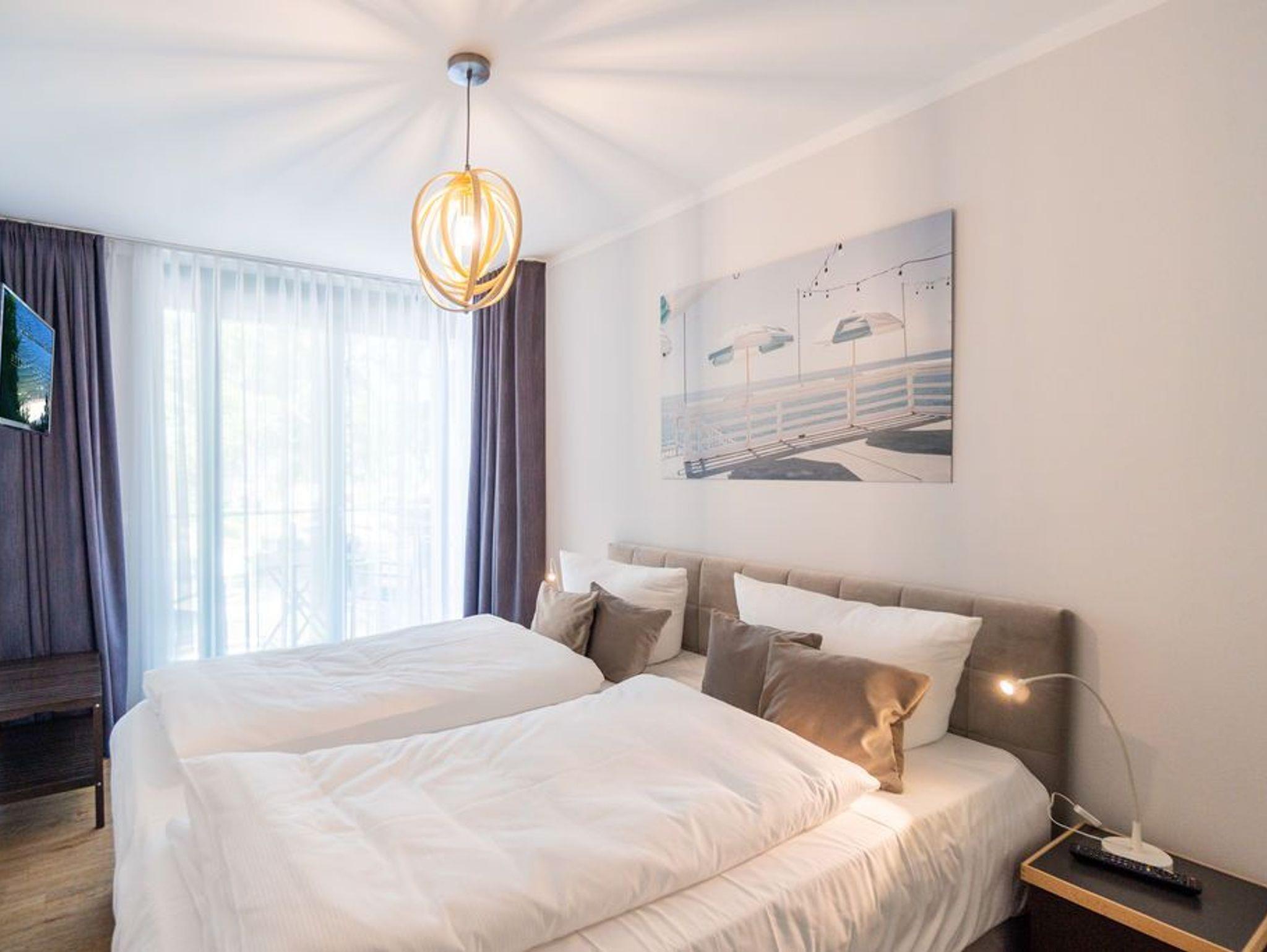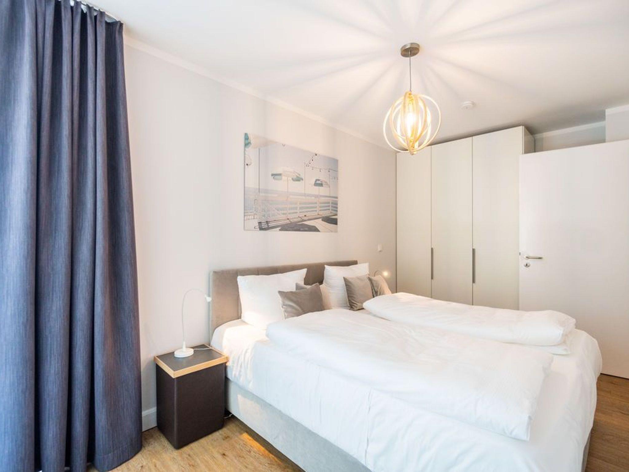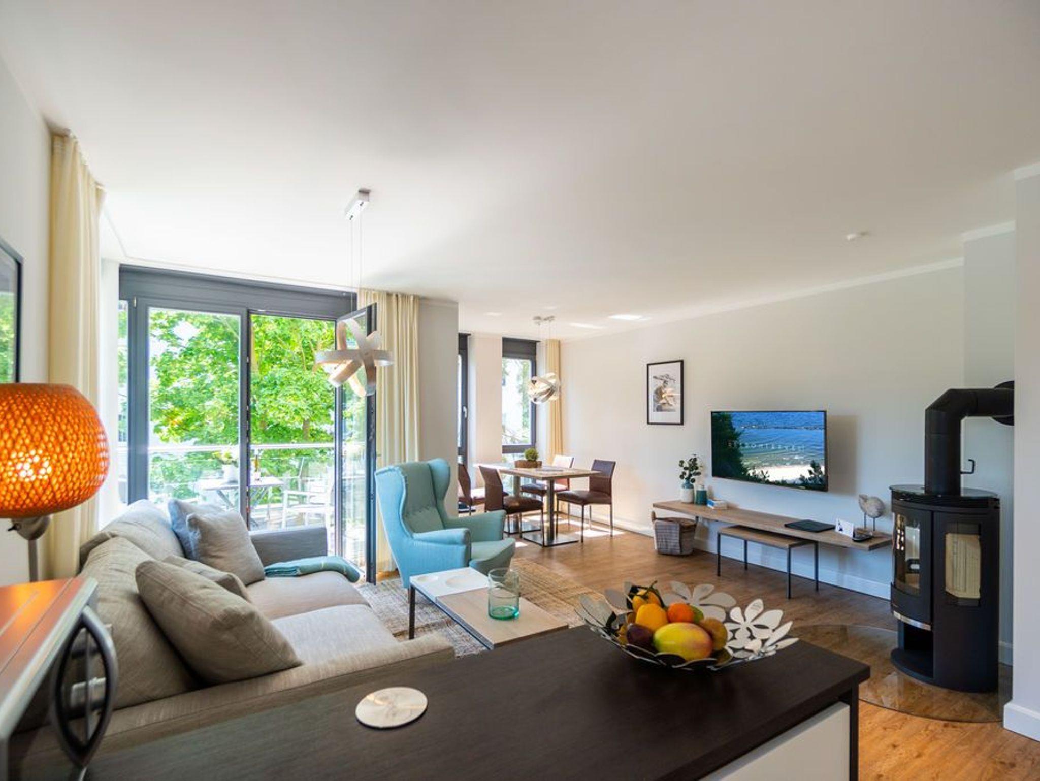 Machen Sie einmal die Augen zu und stellen sich einen sonnenüberfluteten Süd-Balkon vor. In der Hand ein erfrischendes Getränk. Der Himmel färbt sich im Untergang der Sonne in flammendes Orange und Rot. Die nahe Ostsee weht eine angenehme Brise herüber. Sie haben Zeit. Zeit zum Durchatmen. Zeit zum Genießen. Ortswechsel. Im Kamin flackert fesselnd ein wohlig warmes Feuer. Eingekuschelt auf dem Sofa verfolgen Sie das Spiel der Flammen. Hier können Sie zur Ruhe kommen. Abschalten. Das Feriendomizil Nummer 4 im 1. Obergeschoss der Villa Maxim ist eine solche Ruhezone, die sie mit viel Gemütlichkeit und einem urigen Charme empfängt, um Ihnen eine herrlich entspannende Auszeit zu schenken. Auf 70 Quadratmetern finden Sie hier alles, was Sie dafür benötigen. Ein schönes, helles und modern eingerichtetes Wohn-Esszimmer mit Kaminofen und Flat-TV lädt zum Entspannen und gemeinsamen Essen ein. Eine offene und voll ausgestattete Küche lässt das Herz von Hobbyköchen höher schlagen. Essen können Sie am großen Esstisch im Wohnzimmer oder auf dem beschriebenen Balkon unter freiem Himmel. Zum Schlafen stehen den bis zu vier Personen und einem Kleinkind (im Kinderreisebett), die in dieser Wohnung Platz finden, zwei schöne Schlafzimmer zur Verfügung. In jedem steht ein komfortables und äußerst bequemes Boxspringdoppelbett (1,80 m x 2,00 m und 1,60 m x 2,00 m). In den geräumigen Schränken können Sie Ihre Urlaubsgarderobe unterbringen. Das größere der beiden Schlafzimmer hat sogar einen eigenen, kleinen Nord-Balkon. Das Tageslichtbad verfügt über eine Dusche, einen Waschtisch und ein WC. Und wünschen Sie sich einmal so richtig Entspannung, können Sie im Erdgeschoss den kleinen SPA mit zwei Saunen, Dusche und Ruheraum mit nutzen. Kostenfrei. Ebenfalls kostenfrei ist das WLAN-Netz. Ein Pkw-Stellplatz ist für Sie auf dem Gelände reserviert. Bei Ankunft sind die Betten bereits bezogen und Handtücher liegen bereit.