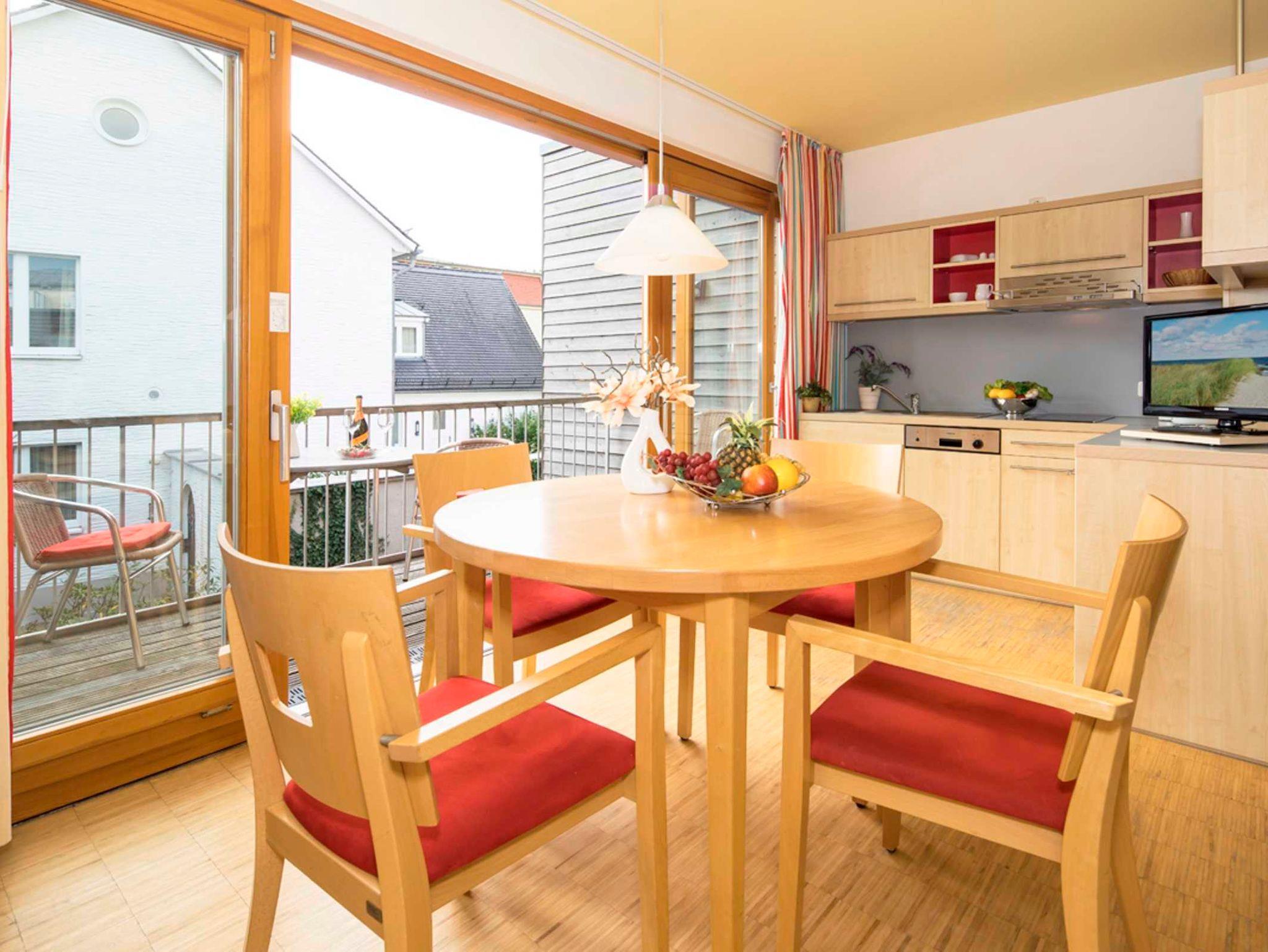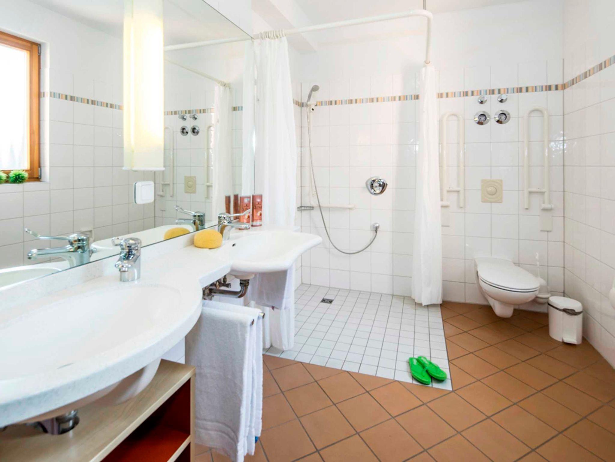 Das erste der 2 Schlafzimmer ist mit einem Doppelbett ausgestattet, das zweite Schlafzimmer mit zwei Einzelbetten. Das barrierefreie Badezimmer verfügt über eine befahrbare Dusche mit Handlauf, ein WC mit klappbaren Haltegriffen sowie zwei Waschtischen, einer davon unterfahrbar. Die gesamte Wohnung ist mit hellen Möbeln und Parkettfußboden ausgestattet. Die Erstausstattung Toilettenpapier, Bettwäsche und Handtücher ist bereits im Gesamtpreis enthalten. Ein PKW-Stellplatz kann gegen Gebühr zugebucht werden.
