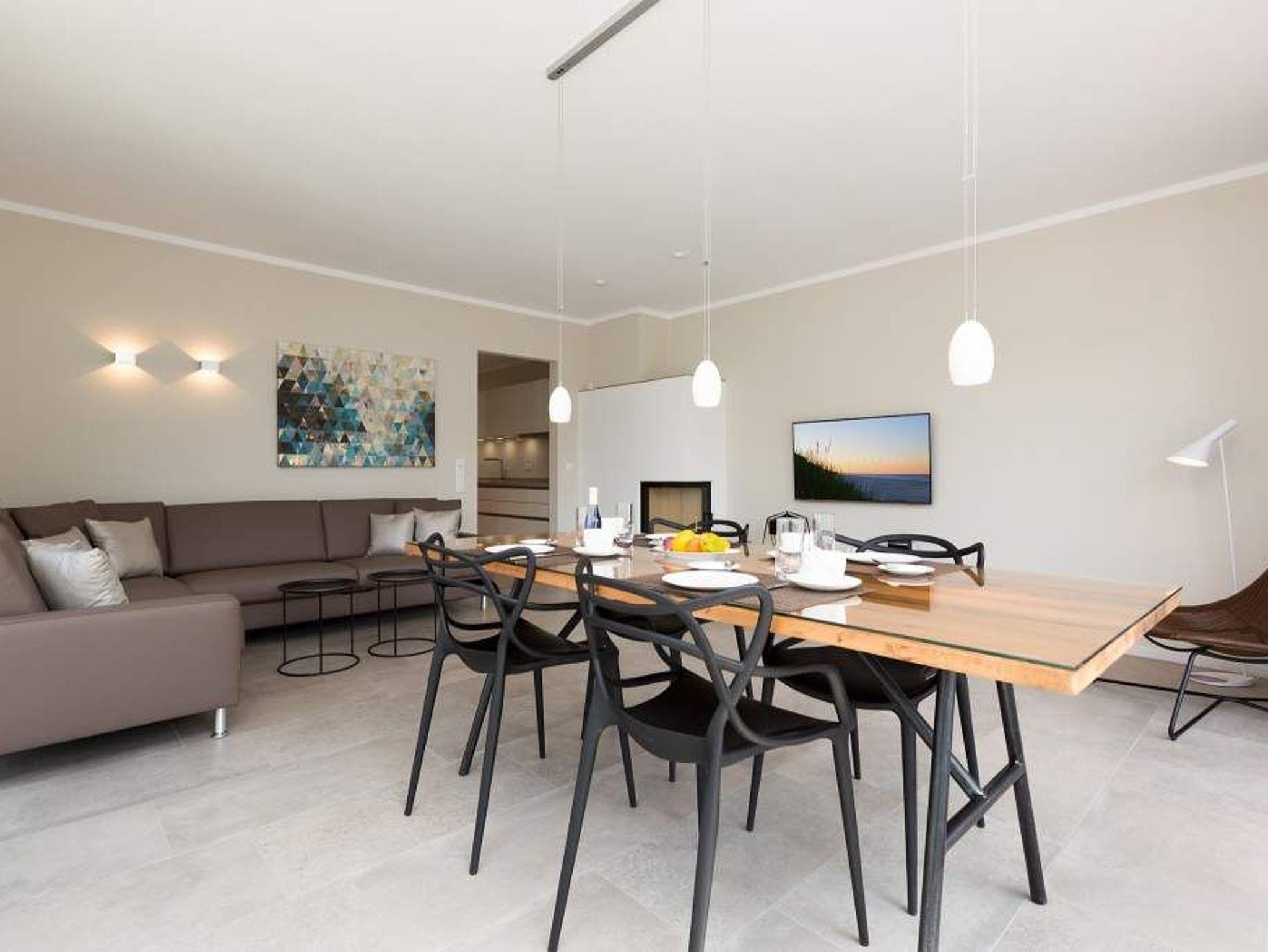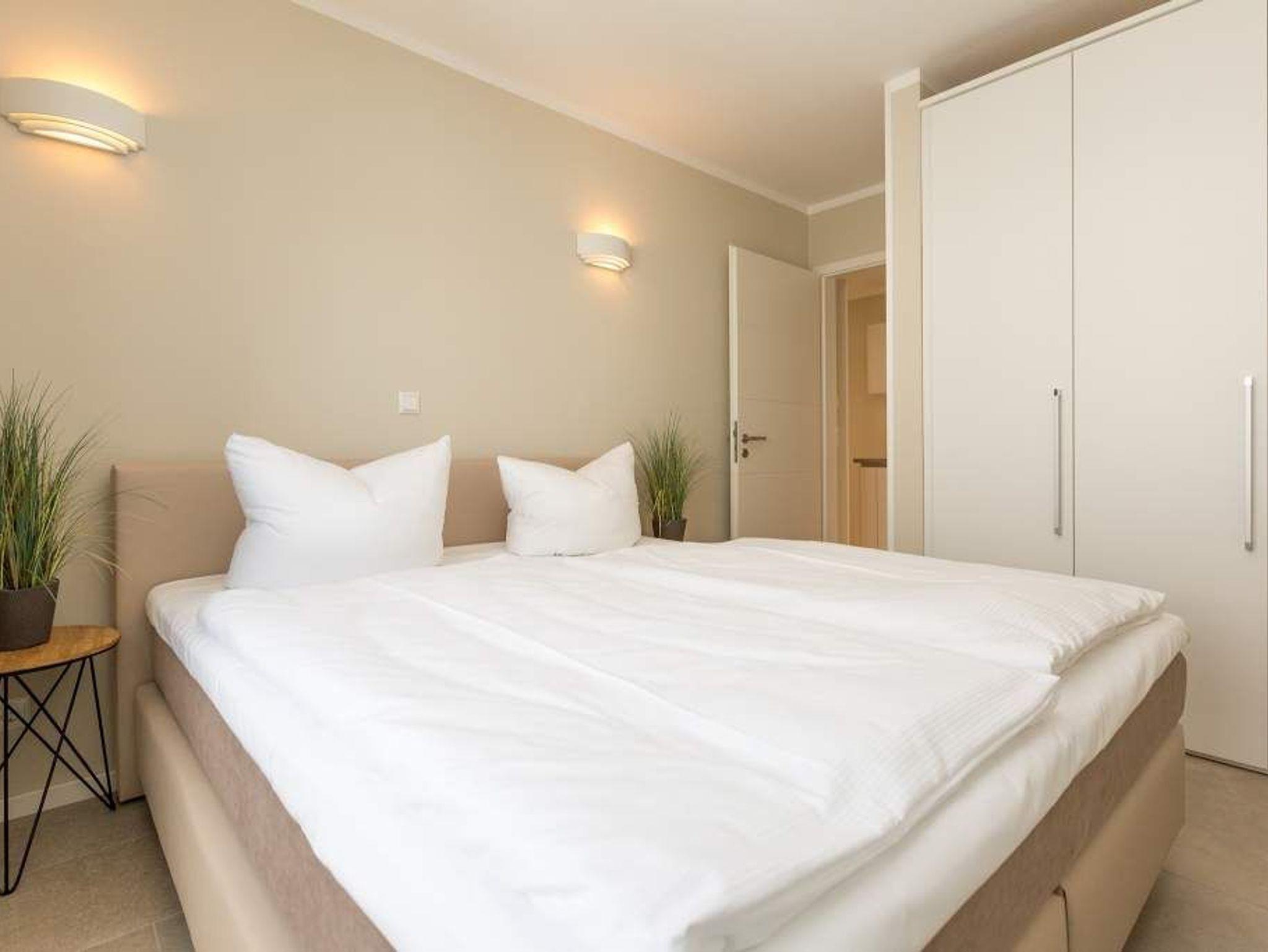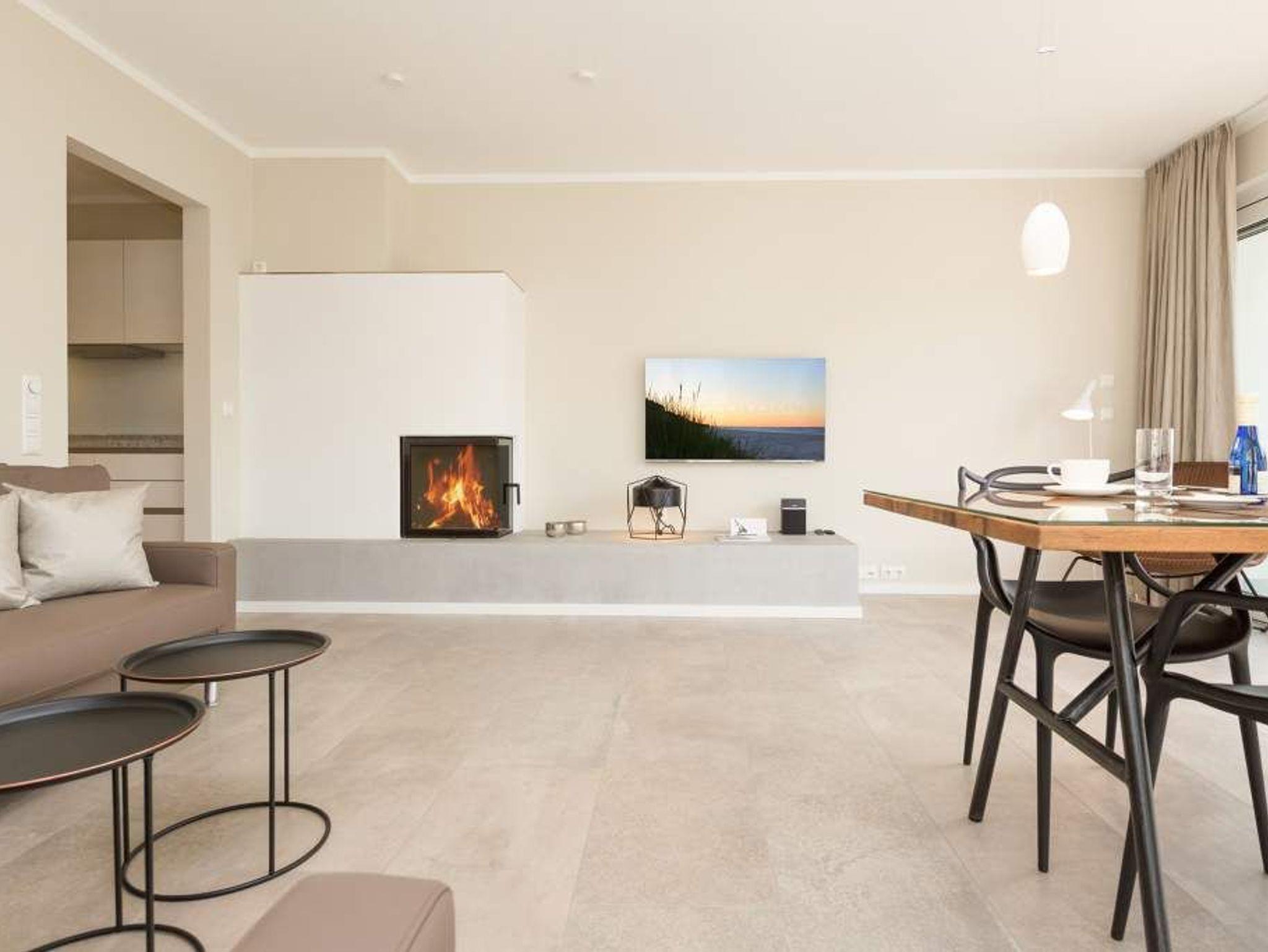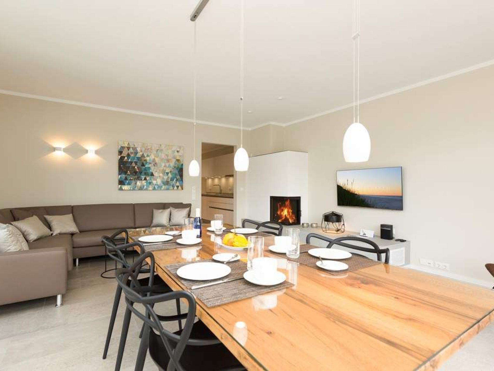 Die Sonne taucht den großen Balkon mit dem Bangkirai-Holzboden in warmes Wohlfühllicht, durchflutet das weiträumige Wohnzimmer und sorgt in den drei Räumen für eine luftig leichte Urlaubsatmosphäre. Viel Raum für vier Personen und ein Kleinkind (bis 2 Jahre im Kinderreisebett) bieten die 87 Quadratmeter der Wohnung Nummer 7 im zweiten Obergeschoss der Villa Strandgrün. Helle Sandfarben lassen den feinen Strand schon erahnen. Gerade einmal 100 Meter entfernt wirft die Ostsee ihre Wellen auf den feinen Sand. Auf der gemütlichen Sofalandschaft lässt es sich herrlich entspannen ? egal ob beim Blick auf den großen Flat-TV oder die urigen Flammen im Kamin. Stilvolle Designmöbel geben der Inneneinrichtung eine stylische Note. Ein schöner großer Echtholztisch wird komplettiert durch vier moderne Stühle. Vom Wohnzimmer gelangt man durch eine Schiebetür zum großen und sonnigen Südwestbalkon. Dieser ist mit einem Teakholztisch und vier Designerstühlen sowie einer Sonnenliege ausgestattet und bietet einen schönen Ausblick. Auf dem zweitem Balkon zum Nordosten kann man das Meeresrauschen vernehmen. Die hochwertige und moderne Küche ist voll ausgestattet. Zwei Schlafzimmer mit Doppelboxspringbetten (1 x 2,00/1,80m und 1 x 2,00/1,60) und jeweils mit eigenem Flat-TV sorgen für ruhige Nächte und angenehme Träume. Zum E-Mails checken oder zum entspannten Lesen empfiehlt sich die Schreibtischnische in einem der Schlafzimmer. Auch der Traum von der Rundumwohlfühlauszeit wird hier wahr. Denn eines der beiden Bäder besitzt eine finnische Sauna. Ansonsten verfügen sie über je eine Dusche mit Rainshower Duschsystem, Waschtisch mit Unterschrank, WC und genügend Ablagen mit großen Spiegeln. Außerdem steht Ihnen ein Waschtrockner (Kombigerät) zur Verfügung. Für das Appartement sind in der Tiefgarage zwei Stellplätze vorgesehen. In einem zur Wohnung gehörenden separaten Abstellraum können Sie Fahrräder unterstellen. Für den Tag am Meer steht Ihnen von Mai bis Ende September (je nach Witterung) ein Strandkorb kostenlos zur Verfügung. Urlauben in der Villa Strandgrün beinhaltet auch die Ausstattung mit Handtüchern und den Bezug der Betten. Das WLAN kann kostenfrei genutzt werden.