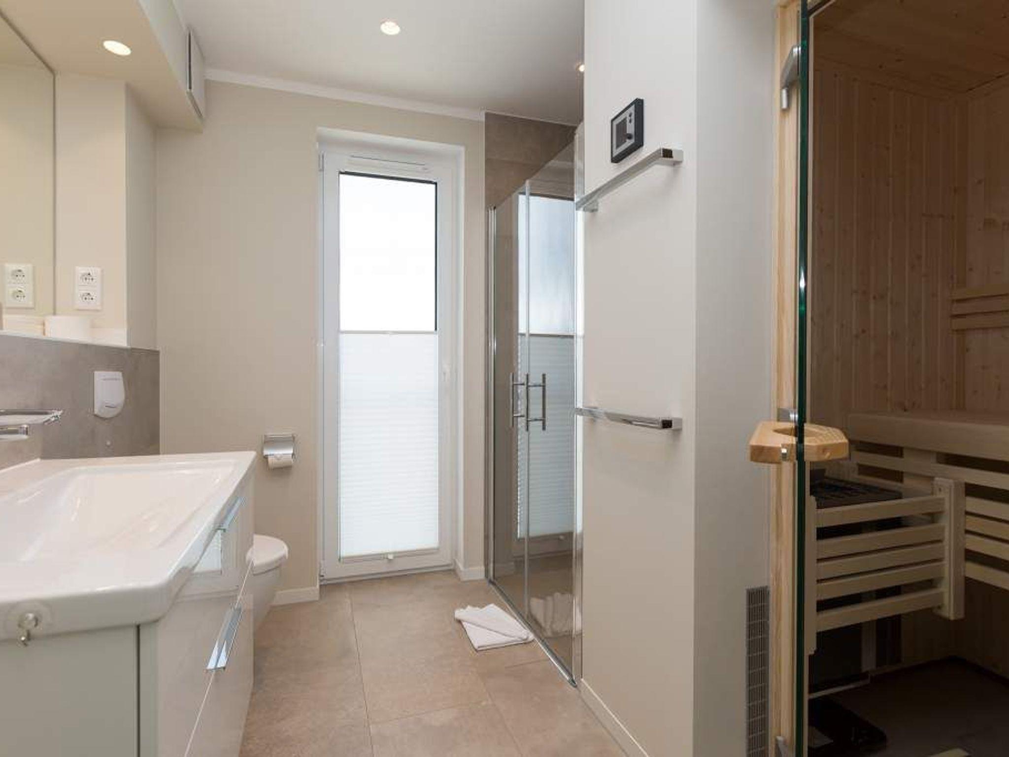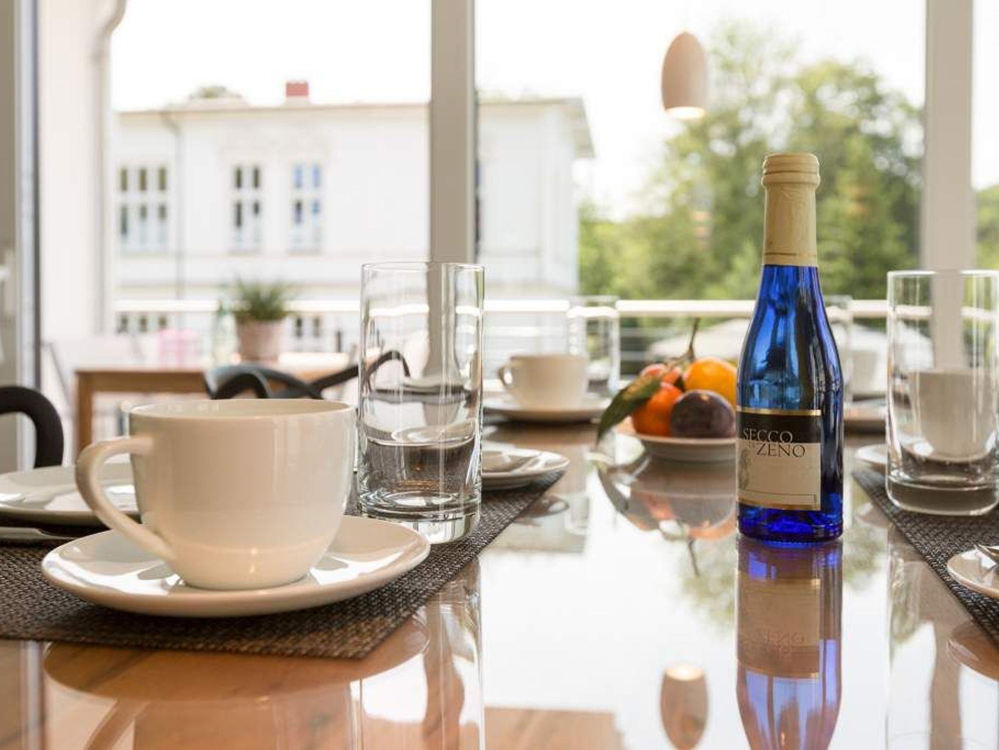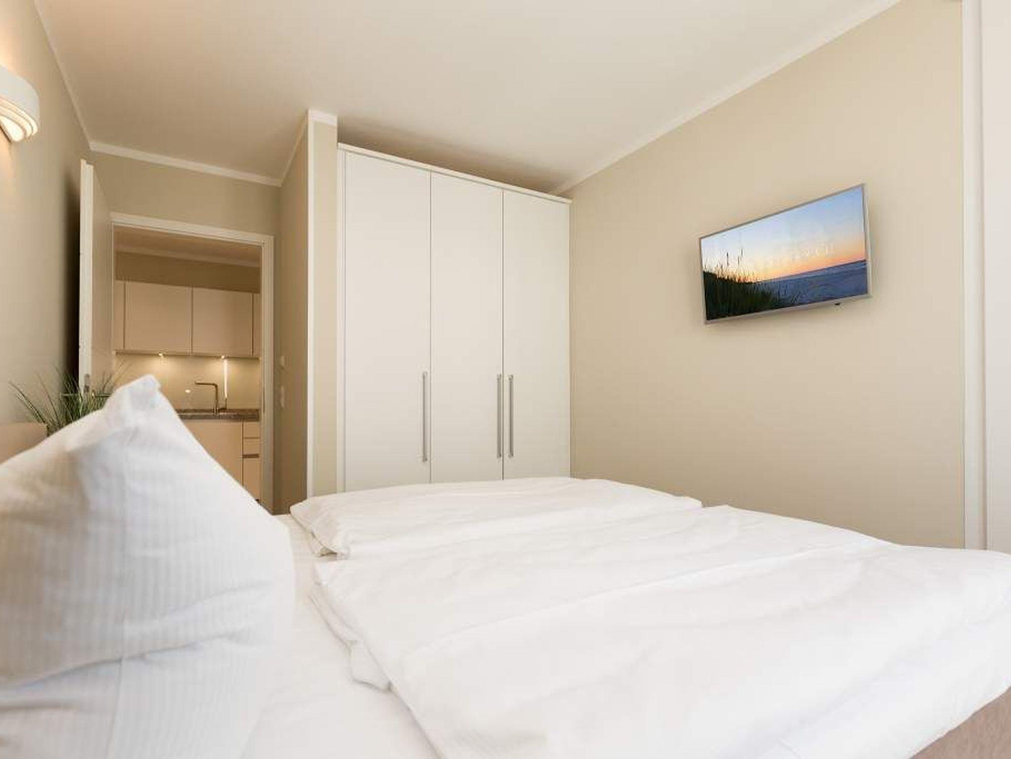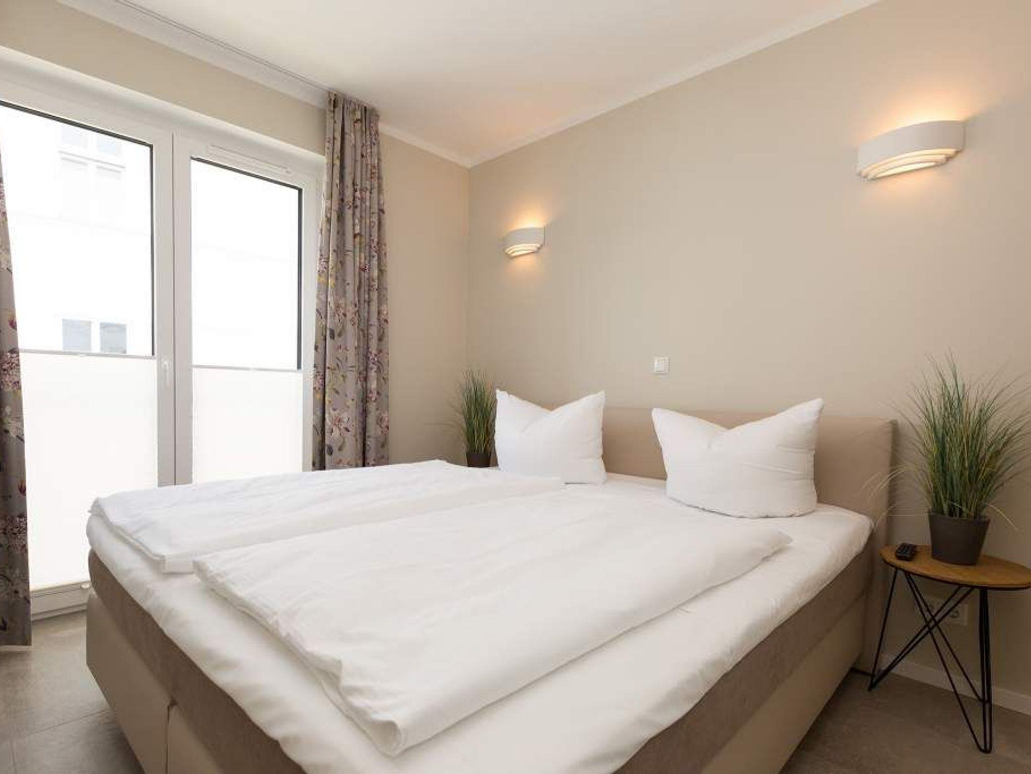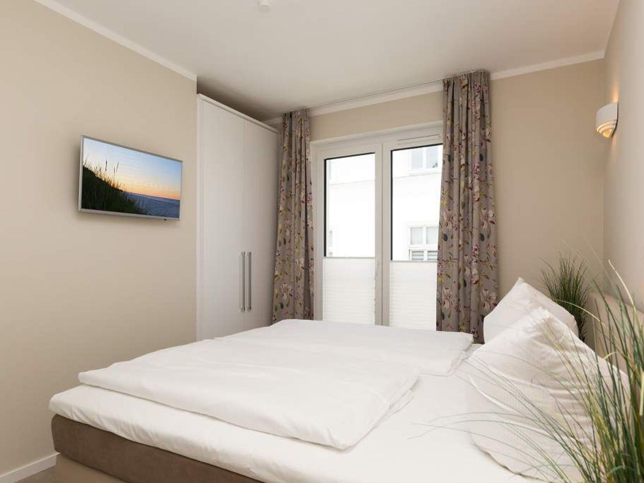 Die Sonne taucht den großen Balkon mit dem Bangkirai-Holzboden in warmes Wohlfühllicht, durchflutet das weiträumige Wohnzimmer und sorgt in den drei Räumen für eine luftig leichte Urlaubsatmosphäre. Viel Raum für vier Personen und ein Kleinkind (bis 2 Jahre im Kinderreisebett) bieten die 87 Quadratmeter der Wohnung Nummer 7 im zweiten Obergeschoss der Villa Strandgrün. Helle Sandfarben lassen den feinen Strand schon erahnen. Gerade einmal 100 Meter entfernt wirft die Ostsee ihre Wellen auf den feinen Sand. Auf der gemütlichen Sofalandschaft lässt es sich herrlich entspannen ? egal ob beim Blick auf den großen Flat-TV oder die urigen Flammen im Kamin. Stilvolle Designmöbel geben der Inneneinrichtung eine stylische Note. Ein schöner großer Echtholztisch wird komplettiert durch vier moderne Stühle. Vom Wohnzimmer gelangt man durch eine Schiebetür zum großen und sonnigen Südwestbalkon. Dieser ist mit einem Teakholztisch und vier Designerstühlen sowie einer Sonnenliege ausgestattet und bietet einen schönen Ausblick. Auf dem zweitem Balkon zum Nordosten kann man das Meeresrauschen vernehmen. Die hochwertige und moderne Küche ist voll ausgestattet. Zwei Schlafzimmer mit Doppelboxspringbetten (1 x 2,00/1,80m und 1 x 2,00/1,60) und jeweils mit eigenem Flat-TV sorgen für ruhige Nächte und angenehme Träume. Zum E-Mails checken oder zum entspannten Lesen empfiehlt sich die Schreibtischnische in einem der Schlafzimmer. Auch der Traum von der Rundumwohlfühlauszeit wird hier wahr. Denn eines der beiden Bäder besitzt eine finnische Sauna. Ansonsten verfügen sie über je eine Dusche mit Rainshower Duschsystem, Waschtisch mit Unterschrank, WC und genügend Ablagen mit großen Spiegeln. Außerdem steht Ihnen ein Waschtrockner (Kombigerät) zur Verfügung. Für das Appartement sind in der Tiefgarage zwei Stellplätze vorgesehen. In einem zur Wohnung gehörenden separaten Abstellraum können Sie Fahrräder unterstellen. Für den Tag am Meer steht Ihnen von Mai bis Ende September (je nach Witterung) ein Strandkorb kostenlos zur Verfügung. Urlauben in der Villa Strandgrün beinhaltet auch die Ausstattung mit Handtüchern und den Bezug der Betten. Das WLAN kann kostenfrei genutzt werden.