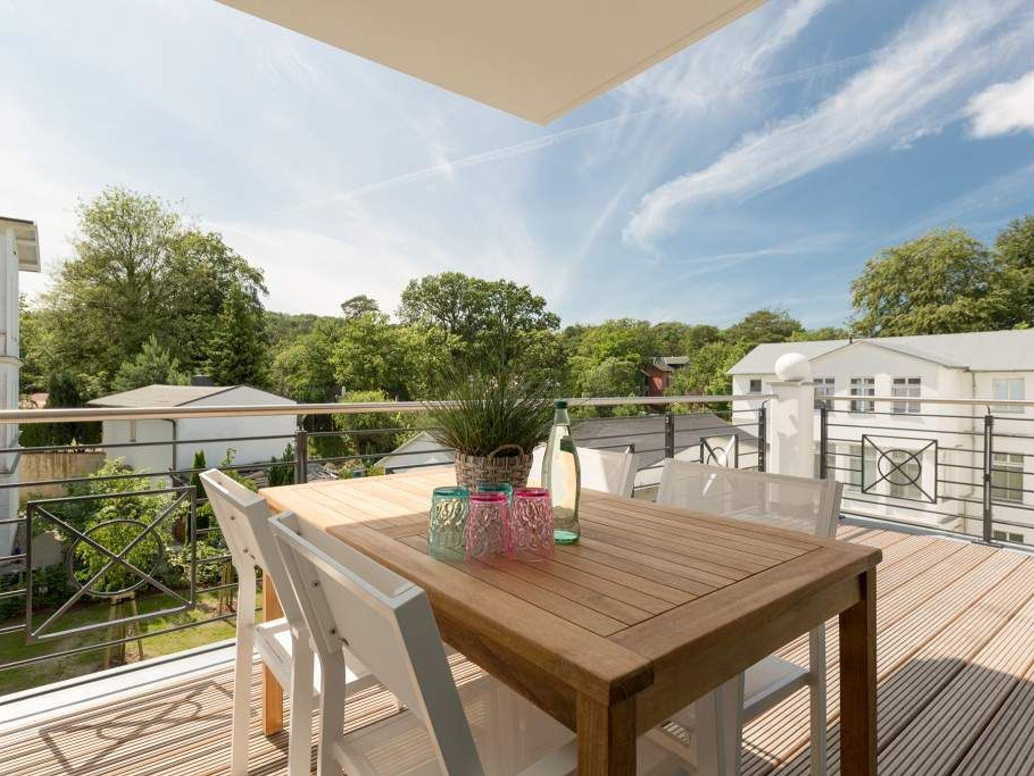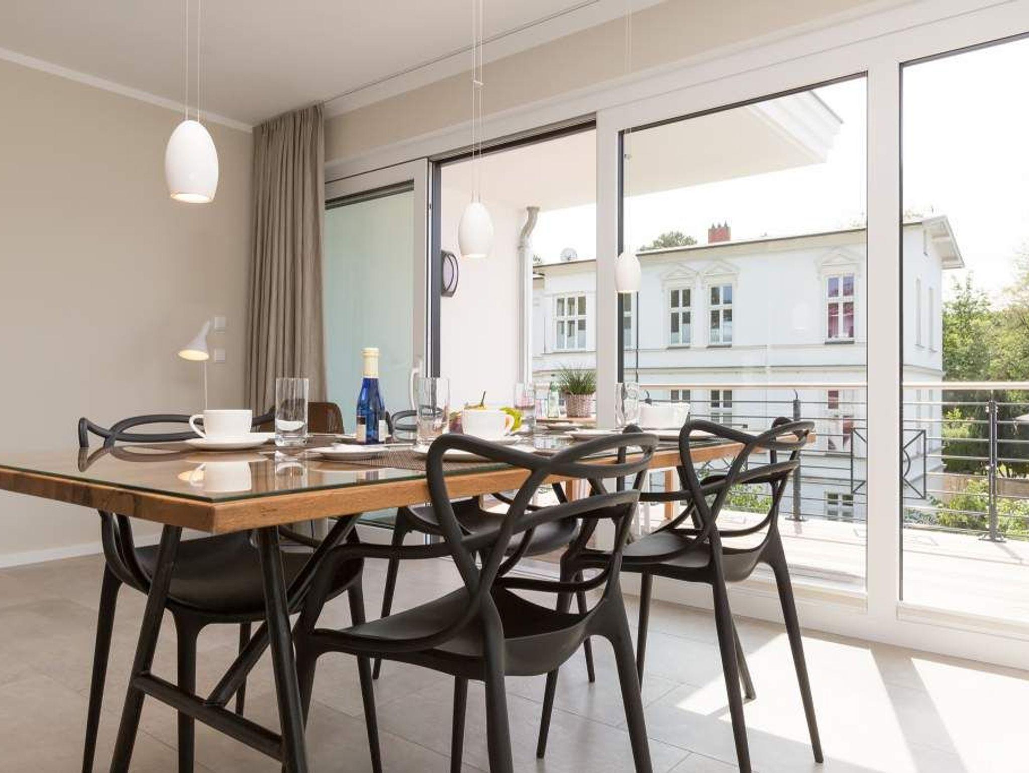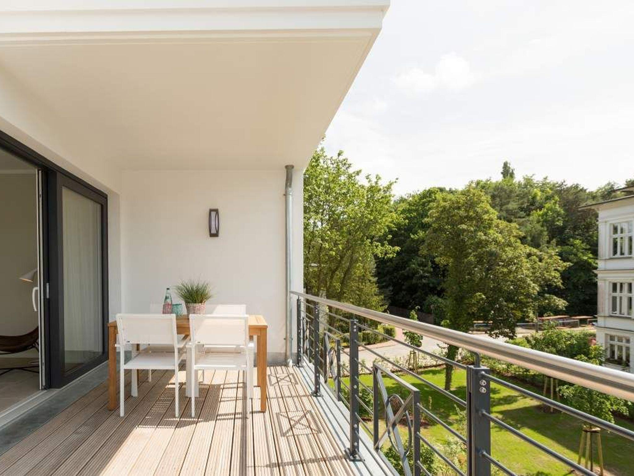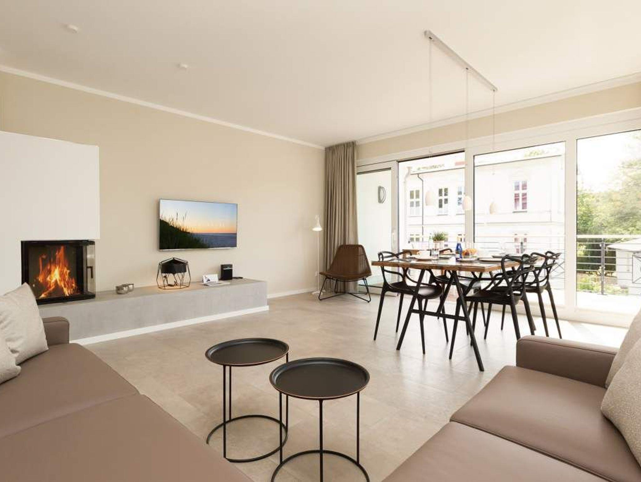 Vogelzwitschern und das sanfte Rauschen der Ostsee: Umgeben von wunderschönen, alten Bäumen atmet die 2017 fertig gestellte Villa Strandgrün das Flair der sie umgebenden Bädervillen. Mit seinen Balkonen und Erkern, die die Fassade untergliedern und auflockern, passt sich das strandnahe (100 Meter) Urlaubsdomizil angenehm in das Bild der aufwendig sanierten Villen um sie herum ein und wirkt selbst wie eine Weiterführung der einst mondänen Architektur des 19. Jahrhunderts. Das stilvolle Äußere setzt sich im exklusiven und eleganten Wohndesign im Inneren fort. Jede Ferienwohnung verfügt über eine Sonnenterrasse oder mehrere Balkone. Besondere Highlights eines jeden Appartements sind der Kamin, eine Sauna und je zwei Bäder bzw. ein zusätzliches Gäste WC. Die großzügigen 3- und 4-Raum-Suiten wurden mit allem Komfort konzipiert und ausgestattet. Vom ASA-Geschirr bis zu den hochwertigen Designmöbeln steht das Wohlfühlen an erster Stelle. In der Tiefgarage gibt es für jedes Appartement einen Stellplatz. Außerdem steht für jede Wohnung ein Briefkasten am Haus zur Verfügung.
