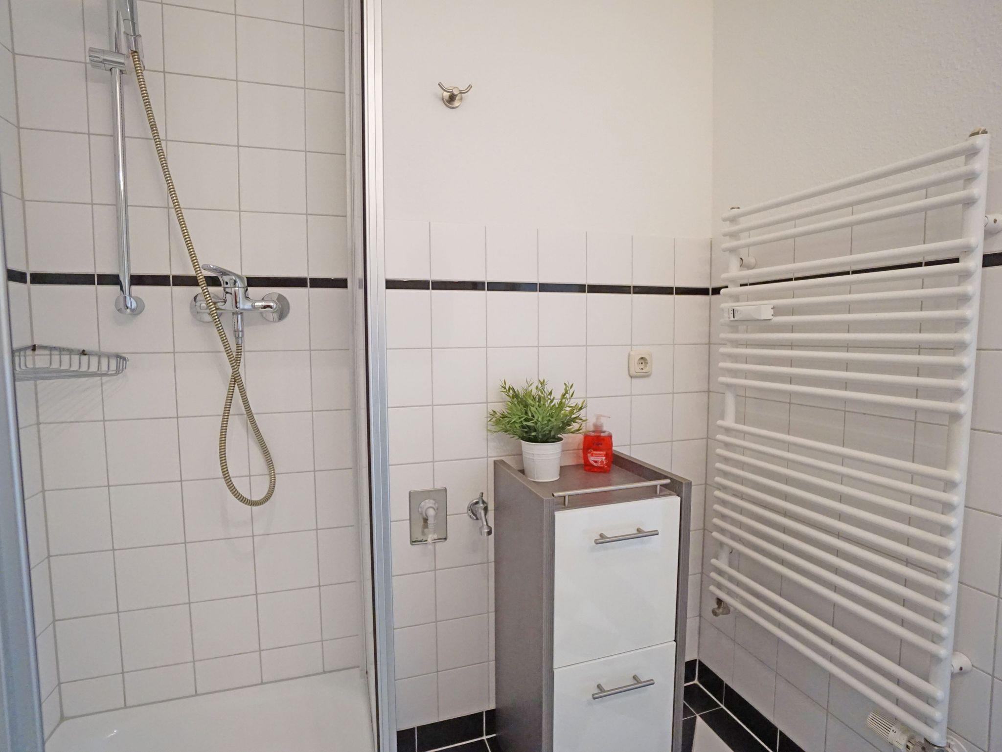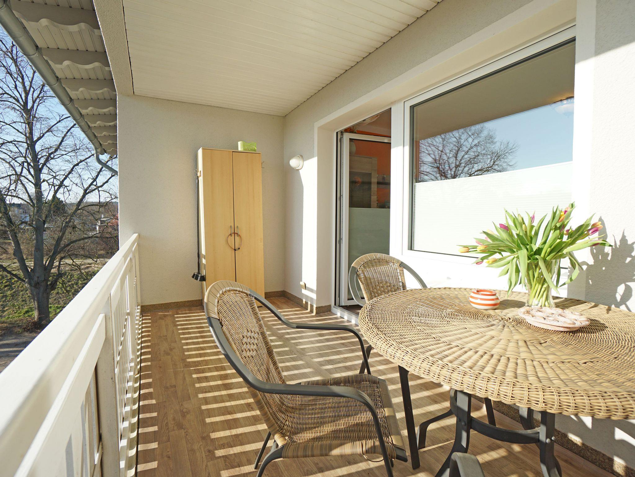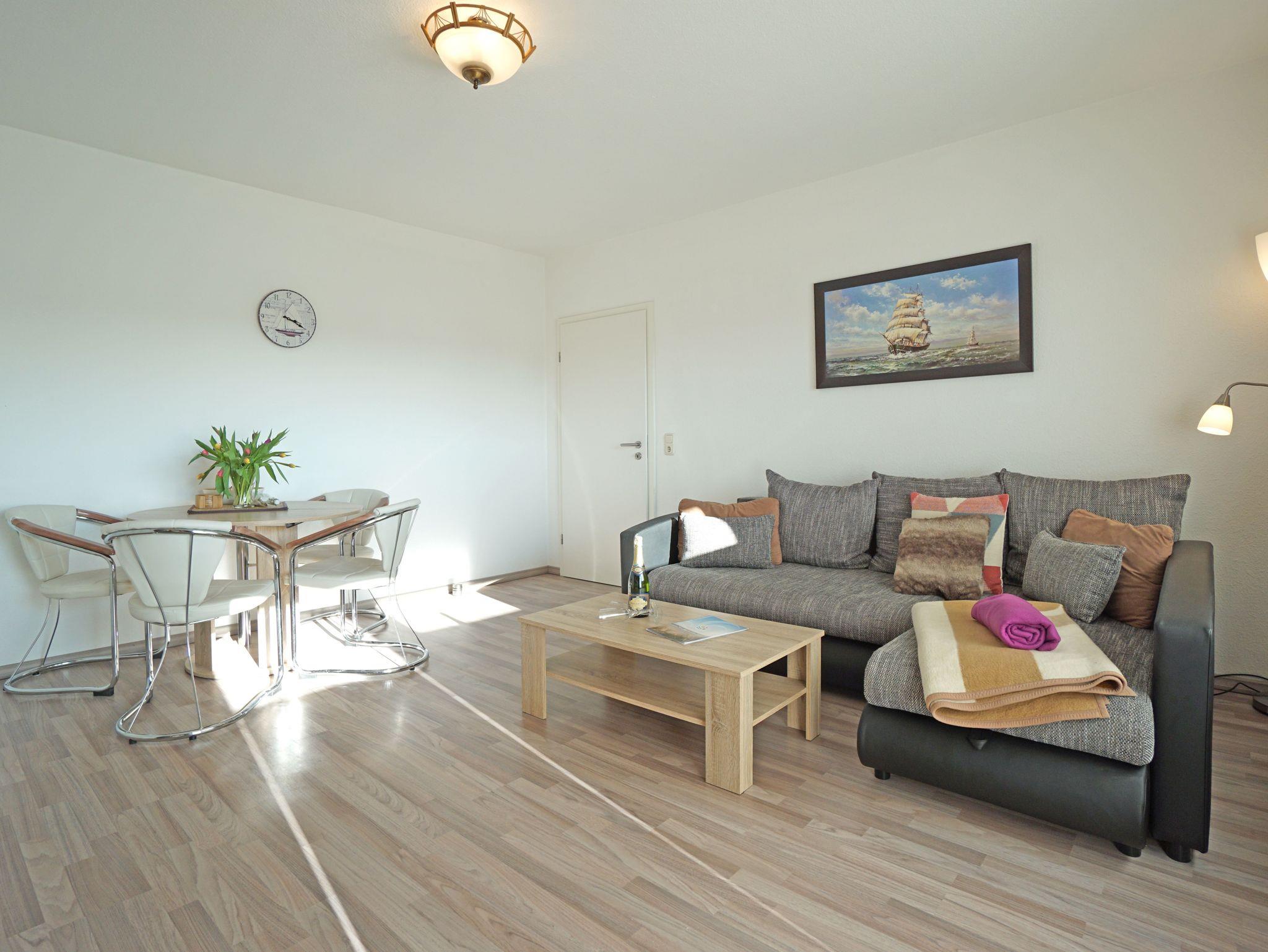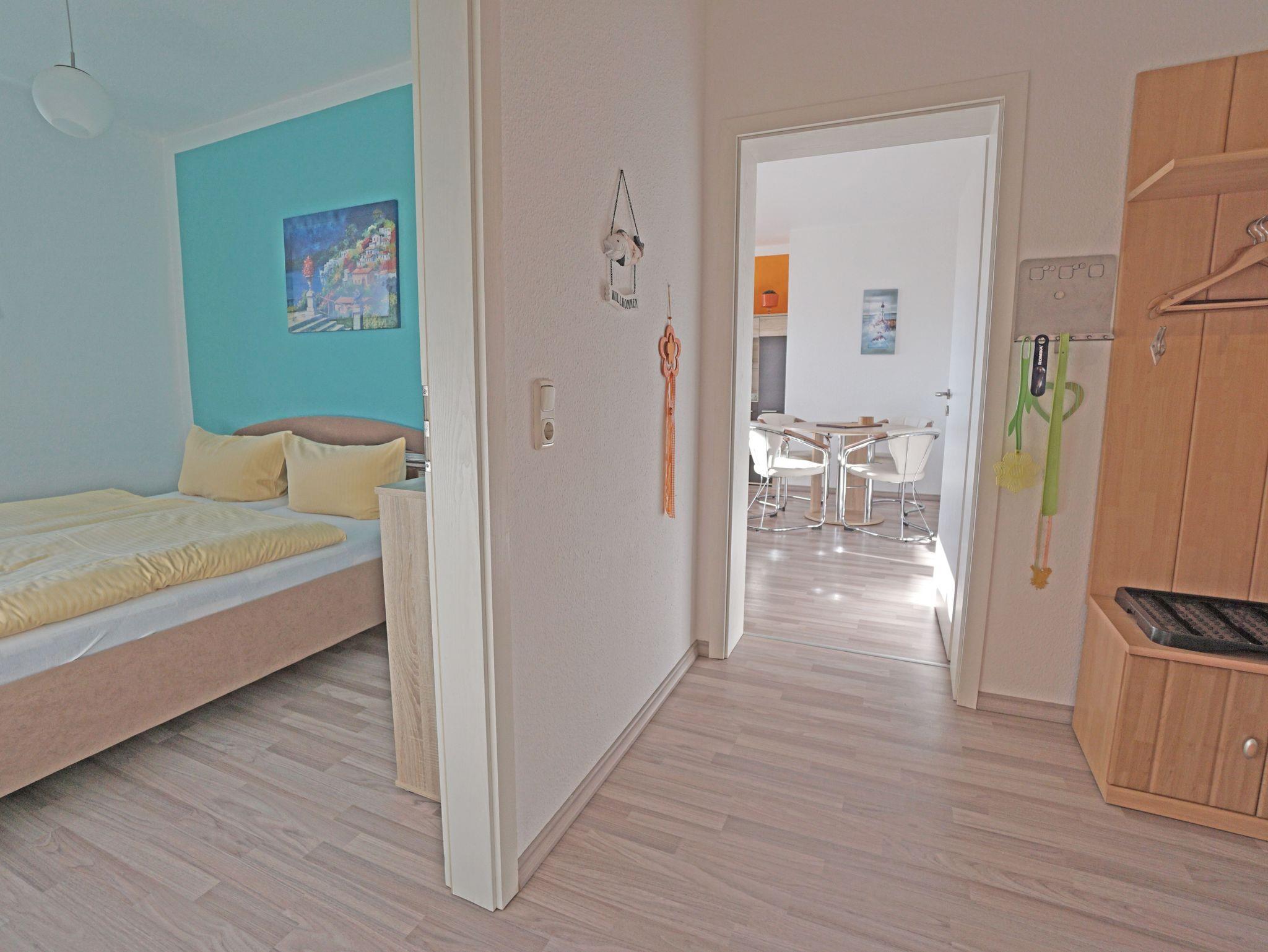 Sie wohnen in einer gemütlichen, hellen 2-Zimerwohnung in Heringsdorf. Die Wohnung befindet sich im Obergeschoß eines zweistöckigen Wohnhauses mit 5 Wohnungseinheiten. Die Wohnung besteht aus einem Wohnzimmer mit einer Doppelbettcouch, Schlafzimmer mit einem Doppelbett, separater Küche mit Essplatz, Bad mit Dusche und einem Balkon. Außerhalb der Wohnung befindet sich ein Abstellraum für z.B. Fahrräder und ein kostenloser Stellplatz für ein Auto.