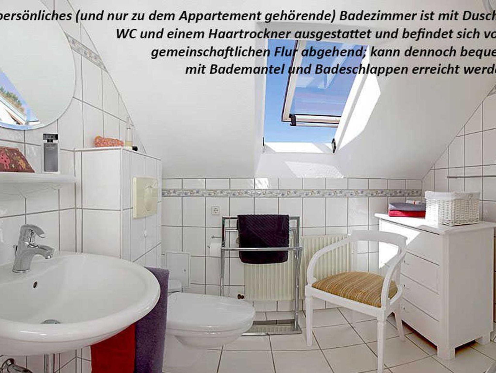 Ihr persönliches (und nur zu dem Appartement gehörende) Badezimmer ist mit Dusche, WC und einem Haartrockner ausgestattet und befindet sich vom gemeinschaftlichen Flur abgehend; kann dennoch bequem mit Bademantel und Badeschlappen erreicht werden.