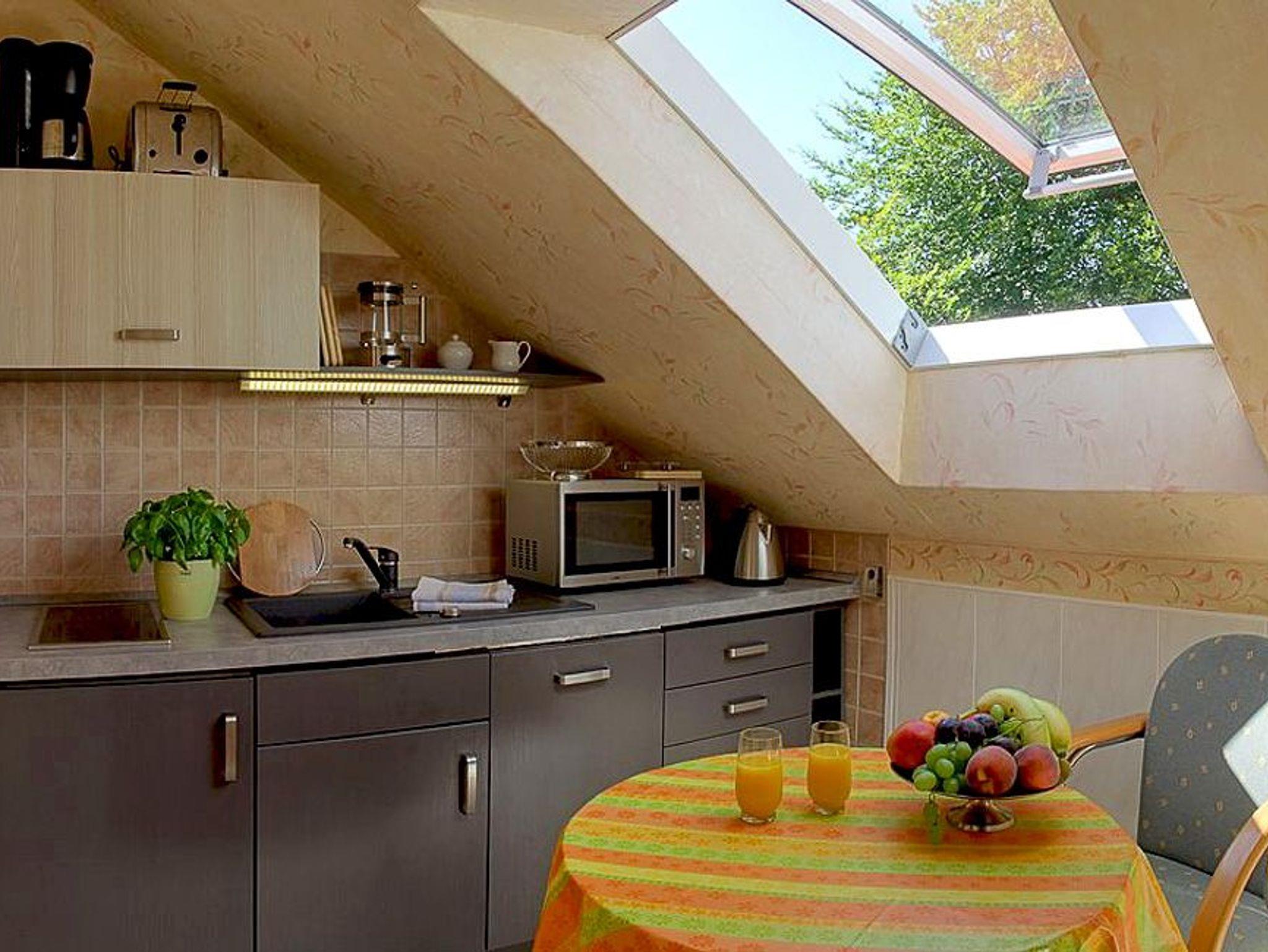 Die separate Küche mit moderner Küchenzeile inkl. Geschirrspüler, Mikrowelle, Cerankochfeld, Kühlschrank mit Gefrierfach, Wasserkocher, Toaster, Kaffeemaschine und Eierkocher sowie Essplatz für zwei Personen lässt keine Wünsche offen.