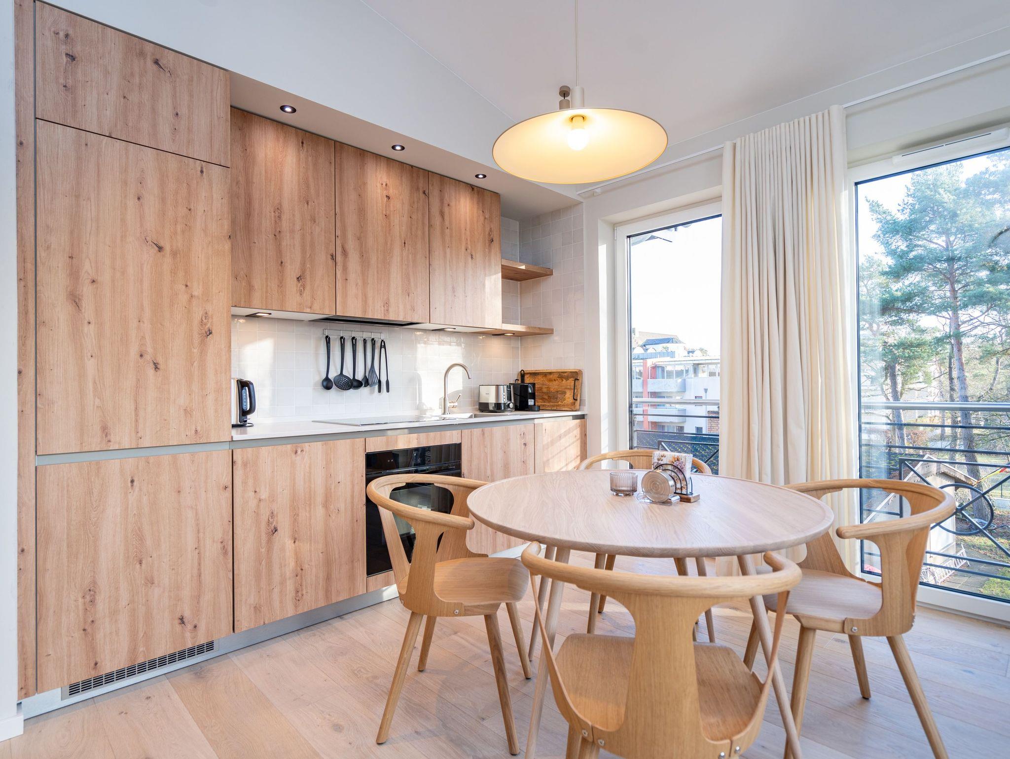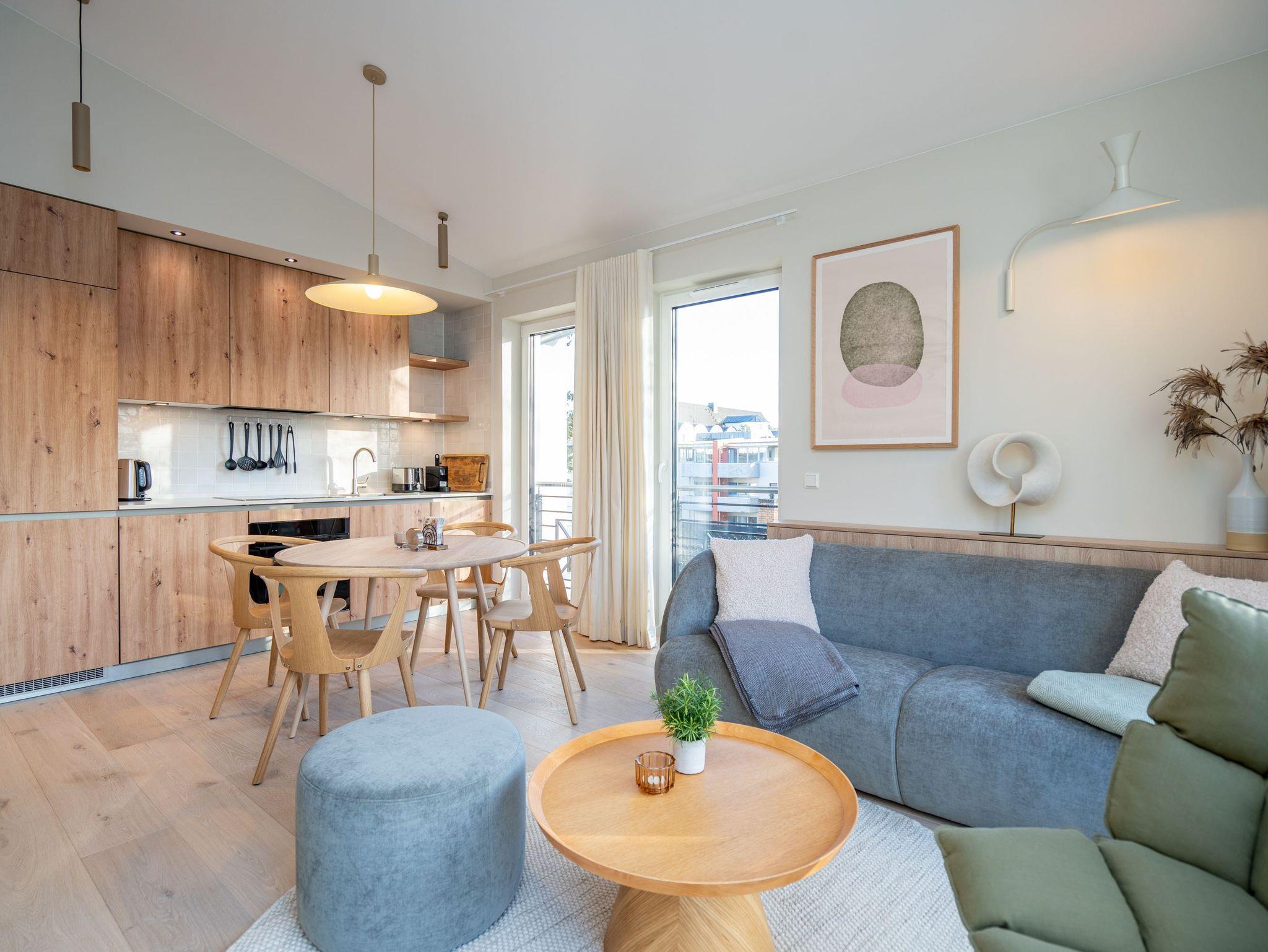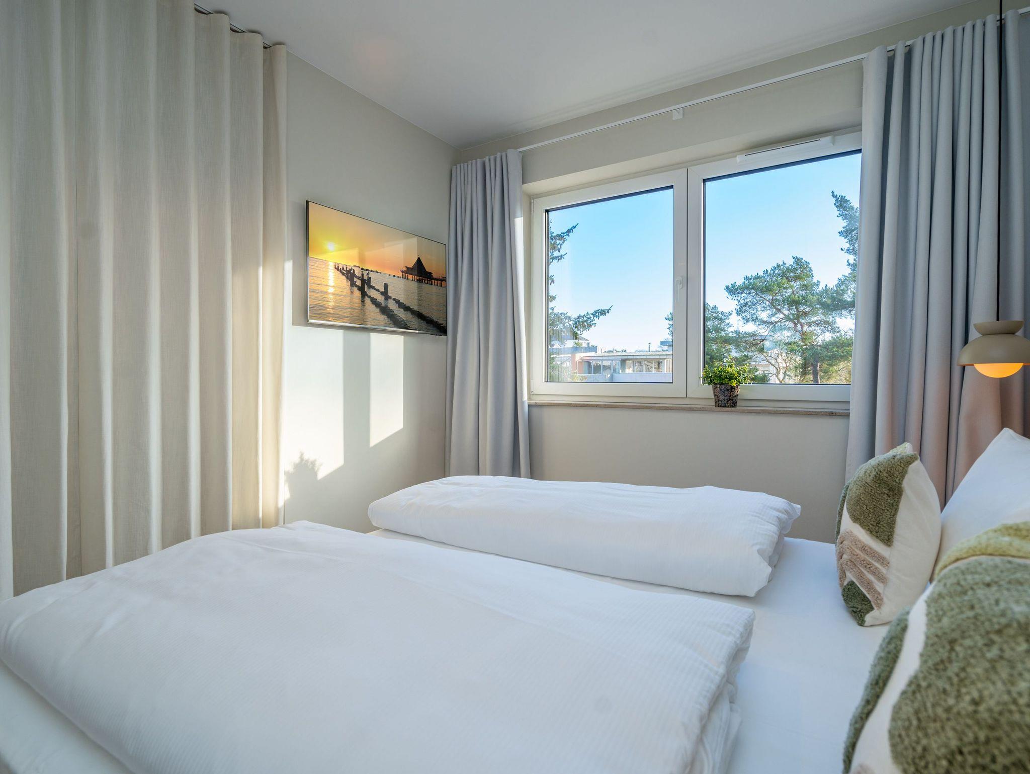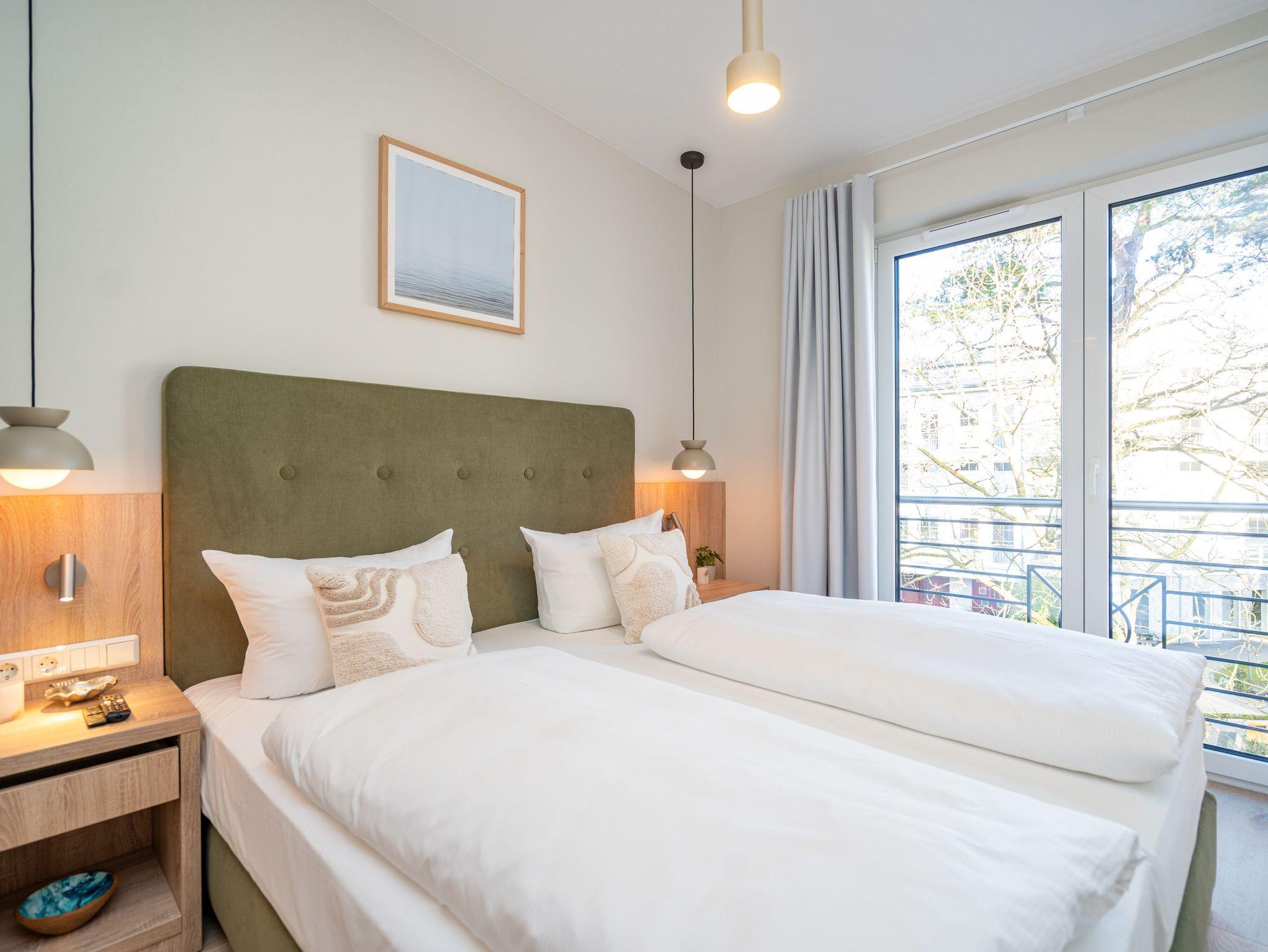 Willkommen im Quartier Maxim ? App. 9, einem stilvollen 3-Raum-Appartement in der 2. Etage, das auf 68 qm Platz für bis zu 4 Personen bietet. Hier erwartet Sie eine perfekte Kombination aus Komfort, Eleganz und durchdachter Ausstattung für unvergessliche Urlaubstage. Der lichtdurchflutete Wohnbereich lädt mit einer gemütlichen Sitzgruppe, einem Kaminofen und einem beeindruckenden 65-Zoll-Flat-TV zu entspannten Stunden ein. Genießen Sie die frische Luft und den Ausblick auf dem Süd-West-Balkon (ca. 7 qm), der mit komfortablen Gartenmöbeln ausgestattet ist ? der perfekte Ort für ein Frühstück oder ein Glas Wein zum Sonnenuntergang. Die offene Küchenzeile lässt keine Wünsche offen. Sie ist mit einem 4-Platten-Cerankochfeld, einem Backofen mit Mikrowellenfunktion, einem geräumigen Kühlschrank sowie einem Gefrierschrank mit drei Fächern ausgestattet. Ideal, um auch im Urlaub kulinarische Highlights zu zaubern! Erholsame Nächte versprechen die beiden stilvollen Schlafzimmer, die jeweils mit luxuriösen Boxspring-Doppelbetten (1,80 m x 2,00 m), Kleiderschränken und Flat-TVs ausgestattet sind. Ein besonderes Highlight: Eines der Schlafzimmer verfügt über direkten Zugang zum Tageslicht-Masterbad, das mit Dusche, Waschtisch und WC besticht. Ein zweites, innenliegendes Bad bietet zusätzlichen Komfort und punktet mit einer Sauna, Dusche und WC ? ein wahres Wellness-Erlebnis. Kostenfreies WLAN sorgt dafür, dass Sie auch im Urlaub jederzeit vernetzt bleiben können. In den Sommermonaten genießen Sie zusätzlich die kostenfreie Nutzung eines Strandkorbs direkt am Strand ? perfekte Voraussetzungen für entspannte Tage an der Küste. Ein PKW-Stellplatz in der Tiefgarage steht ebenfalls zur Verfügung, mit einer kostenpflichtigen Lademöglichkeit für E-Autos. Freuen Sie sich auf ein Urlaubserlebnis, das Komfort, Entspannung und moderne Ausstattung harmonisch vereint ? Quartier Maxim ? App. 9 erwartet Sie!