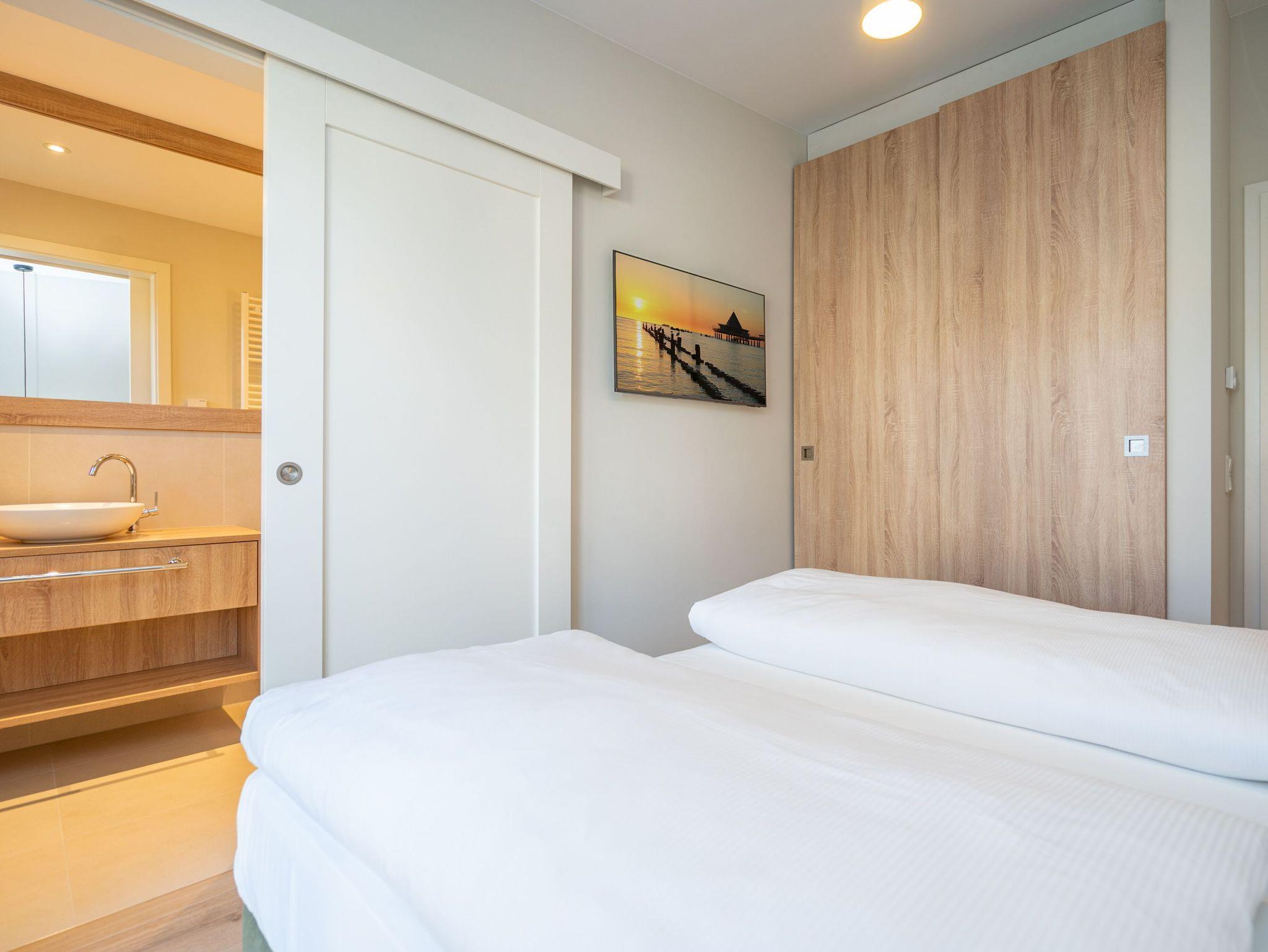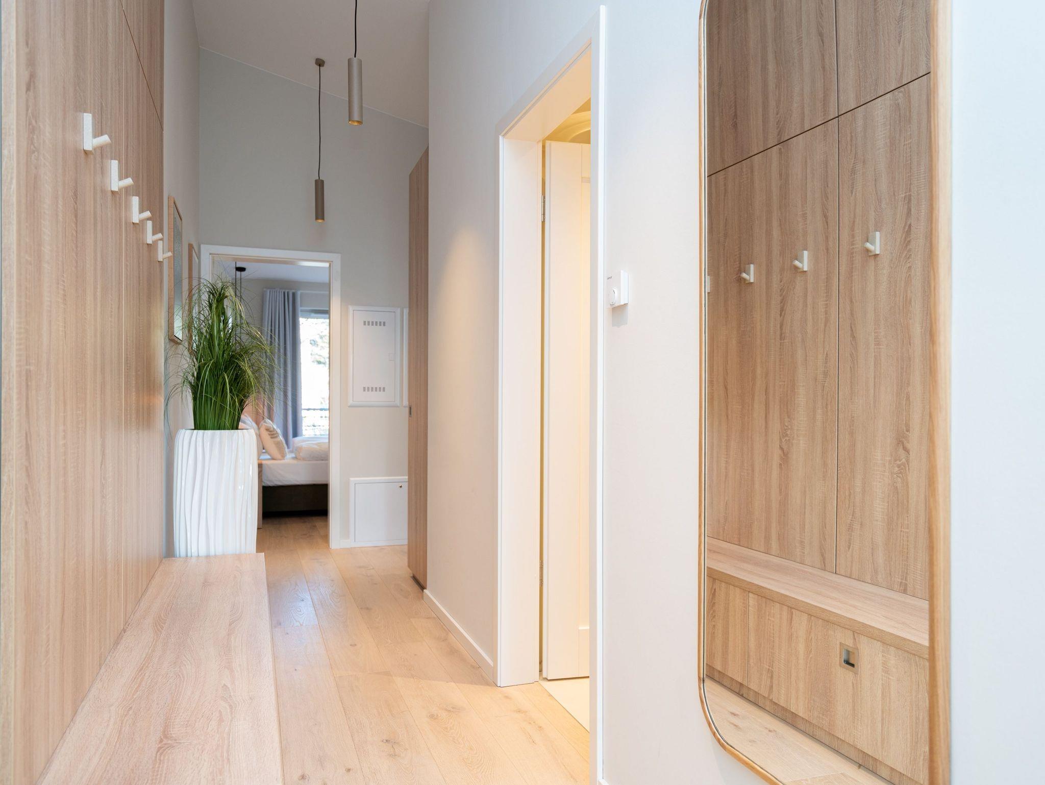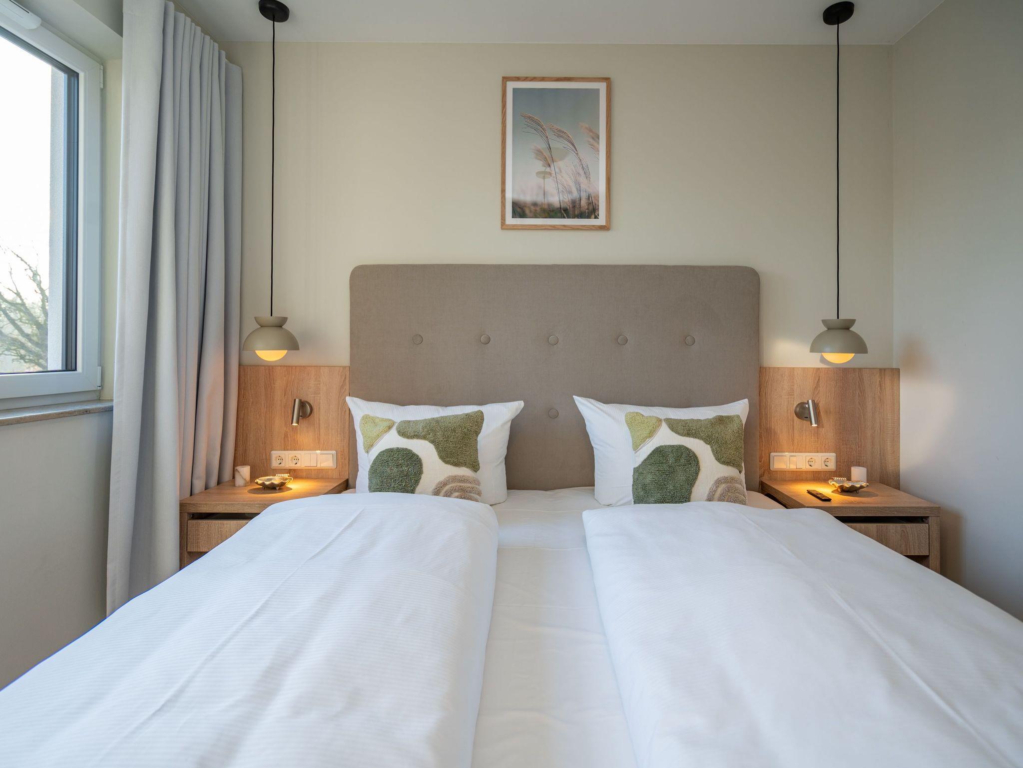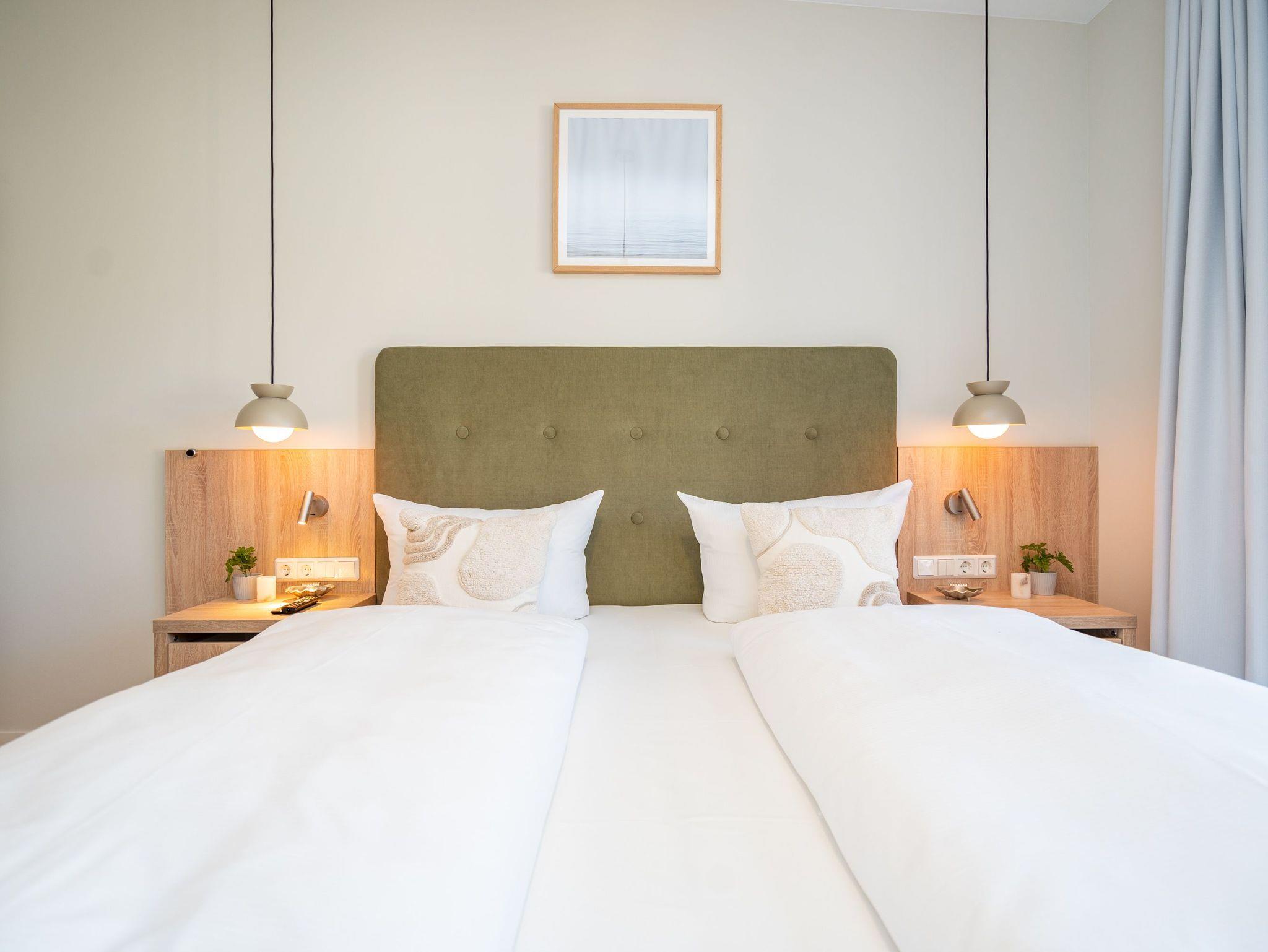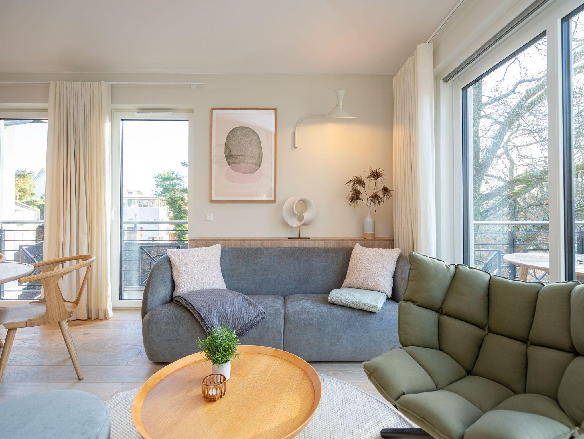 Willkommen im Quartier Maxim ? App. 9, einem stilvollen 3-Raum-Appartement in der 2. Etage, das auf 68 qm Platz für bis zu 4 Personen bietet. Hier erwartet Sie eine perfekte Kombination aus Komfort, Eleganz und durchdachter Ausstattung für unvergessliche Urlaubstage. Der lichtdurchflutete Wohnbereich lädt mit einer gemütlichen Sitzgruppe, einem Kaminofen und einem beeindruckenden 65-Zoll-Flat-TV zu entspannten Stunden ein. Genießen Sie die frische Luft und den Ausblick auf dem Süd-West-Balkon (ca. 7 qm), der mit komfortablen Gartenmöbeln ausgestattet ist ? der perfekte Ort für ein Frühstück oder ein Glas Wein zum Sonnenuntergang. Die offene Küchenzeile lässt keine Wünsche offen. Sie ist mit einem 4-Platten-Cerankochfeld, einem Backofen mit Mikrowellenfunktion, einem geräumigen Kühlschrank sowie einem Gefrierschrank mit drei Fächern ausgestattet. Ideal, um auch im Urlaub kulinarische Highlights zu zaubern! Erholsame Nächte versprechen die beiden stilvollen Schlafzimmer, die jeweils mit luxuriösen Boxspring-Doppelbetten (1,80 m x 2,00 m), Kleiderschränken und Flat-TVs ausgestattet sind. Ein besonderes Highlight: Eines der Schlafzimmer verfügt über direkten Zugang zum Tageslicht-Masterbad, das mit Dusche, Waschtisch und WC besticht. Ein zweites, innenliegendes Bad bietet zusätzlichen Komfort und punktet mit einer Sauna, Dusche und WC ? ein wahres Wellness-Erlebnis. Kostenfreies WLAN sorgt dafür, dass Sie auch im Urlaub jederzeit vernetzt bleiben können. In den Sommermonaten genießen Sie zusätzlich die kostenfreie Nutzung eines Strandkorbs direkt am Strand ? perfekte Voraussetzungen für entspannte Tage an der Küste. Ein PKW-Stellplatz in der Tiefgarage steht ebenfalls zur Verfügung, mit einer kostenpflichtigen Lademöglichkeit für E-Autos. Freuen Sie sich auf ein Urlaubserlebnis, das Komfort, Entspannung und moderne Ausstattung harmonisch vereint ? Quartier Maxim ? App. 9 erwartet Sie!